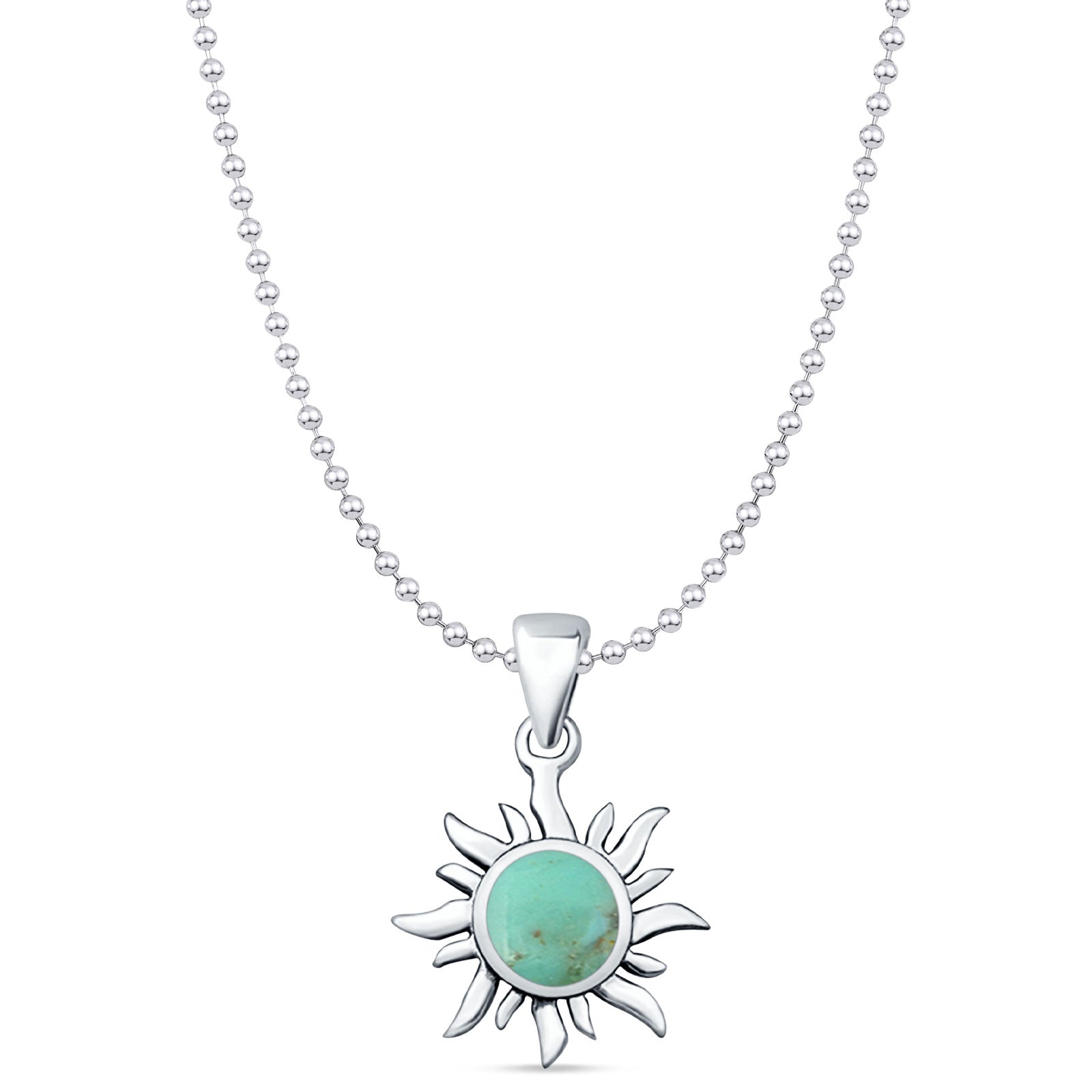 Round Turquoise Sun Pendant Oxidized Bead Chain Necklace 925 Sterling Silver