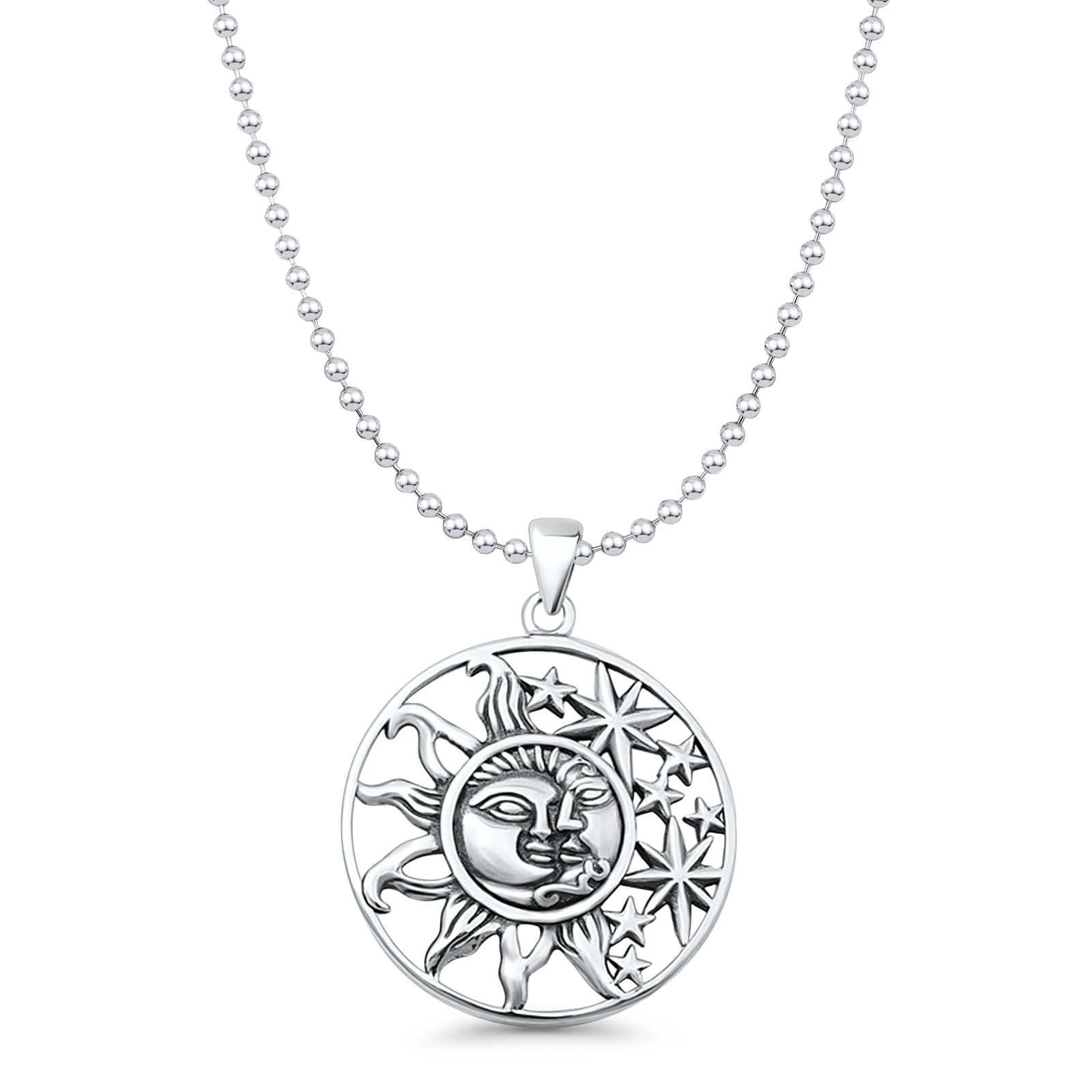 Sun Moon & Stars Pendant Bead Chain Necklace Oxidized 925 Sterling Silver