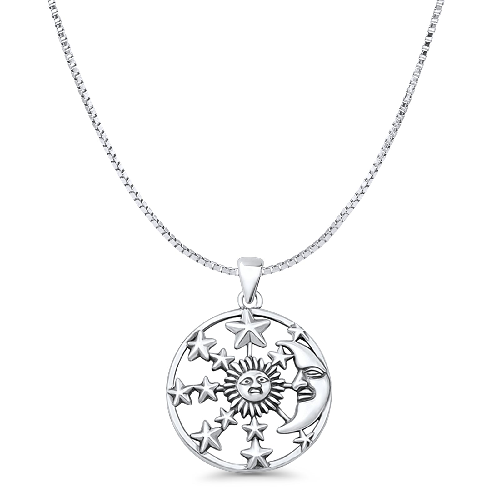 Sun Moon & Stars Pendant Box Chain Necklace Oxidized 925 Sterling Silver