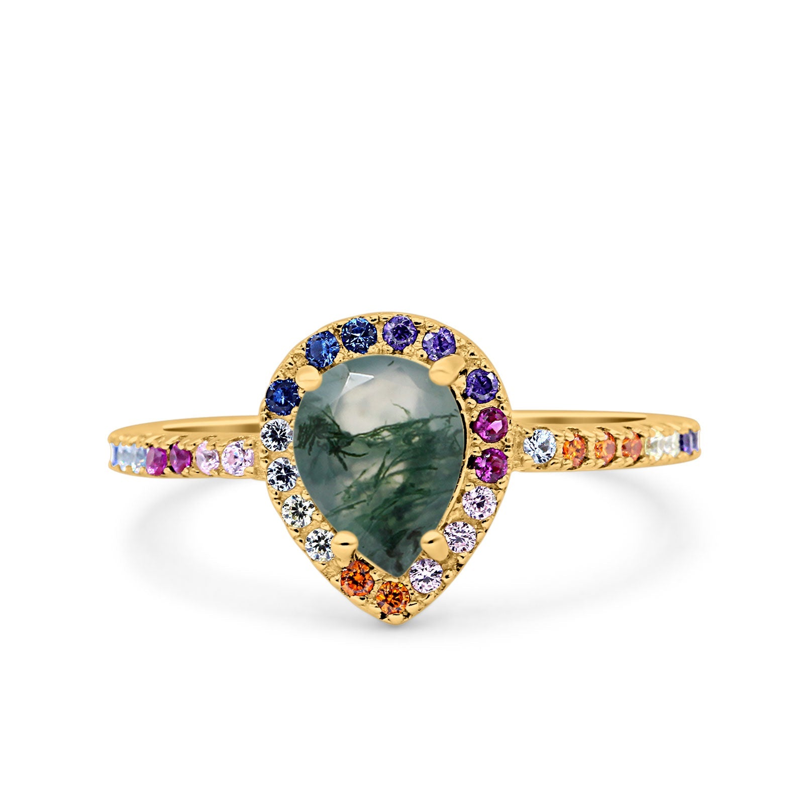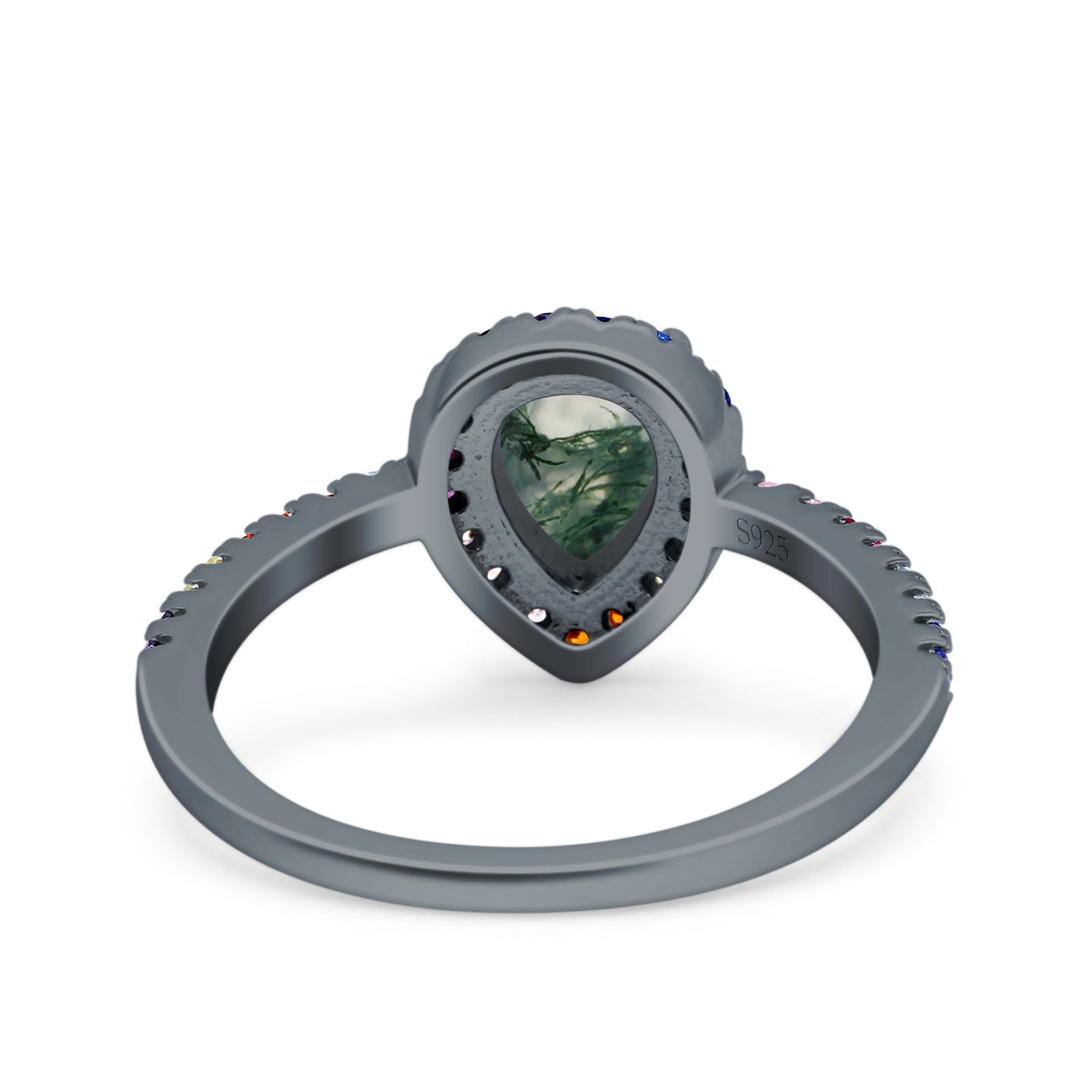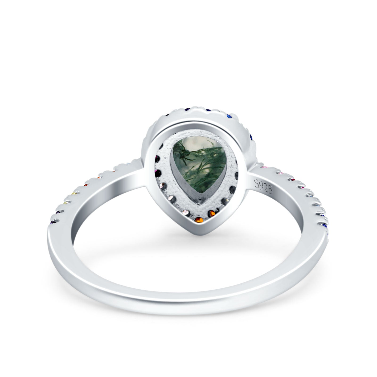 Teardrop Pear Natural Green Moss Agate Vintage Style Ring 925 Sterling Silver