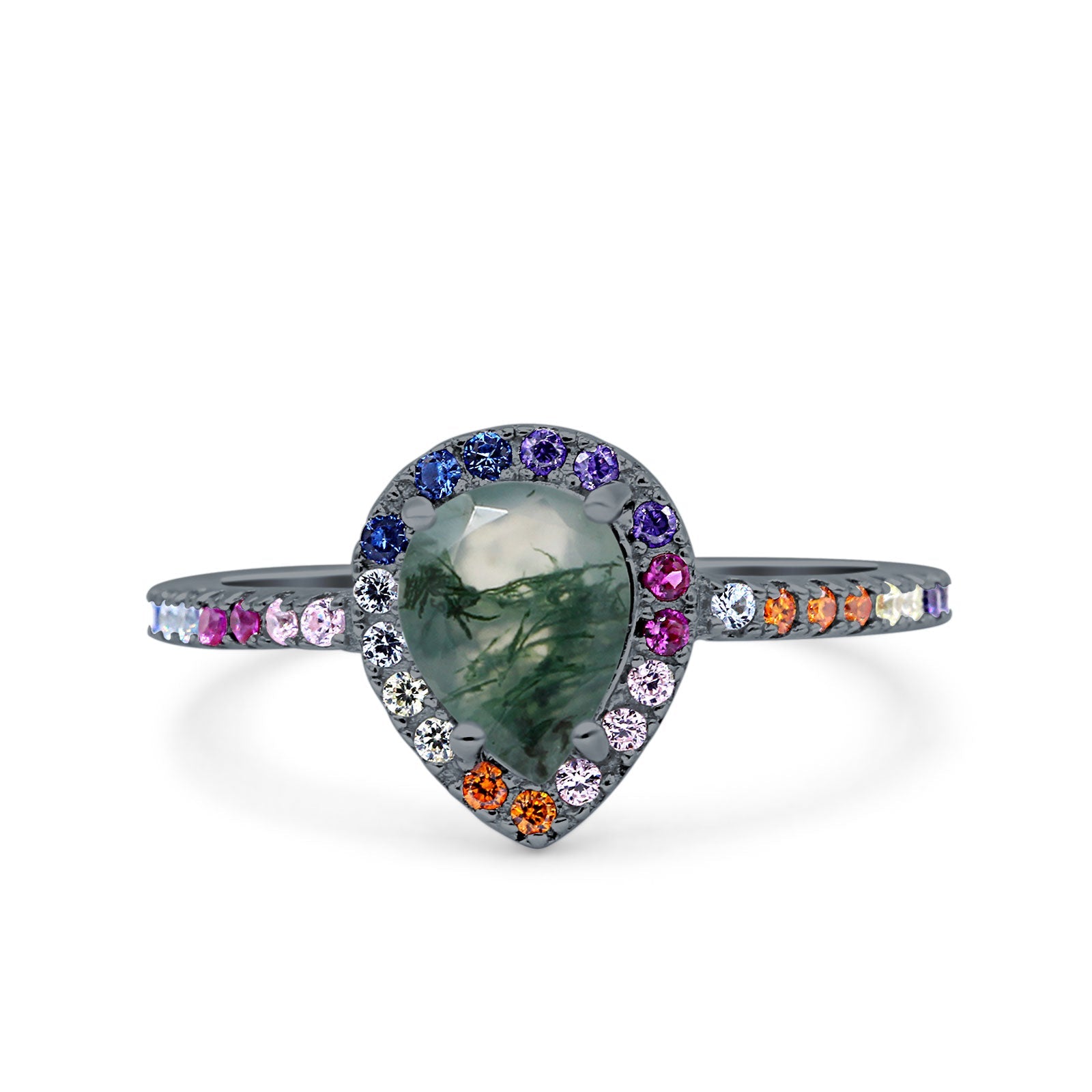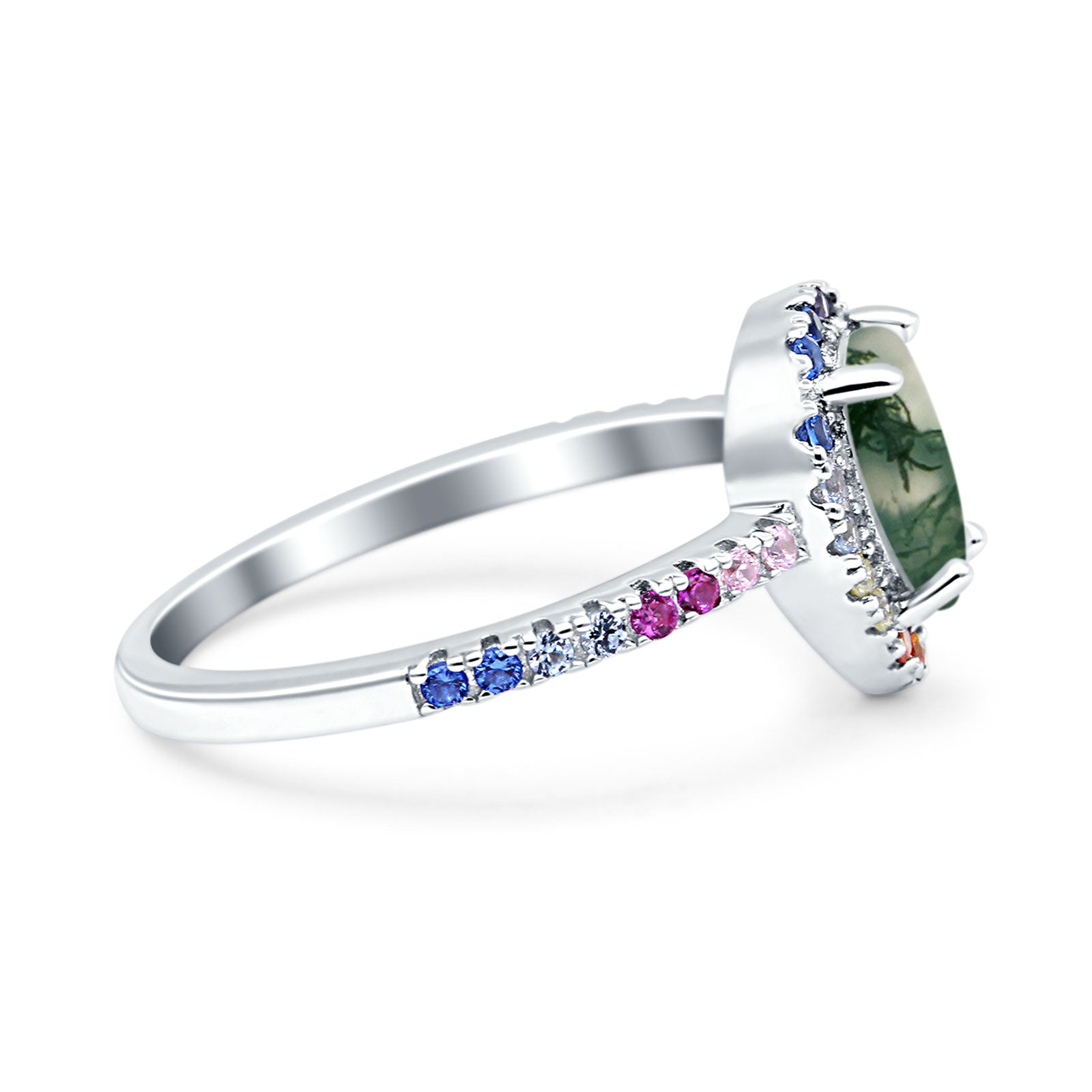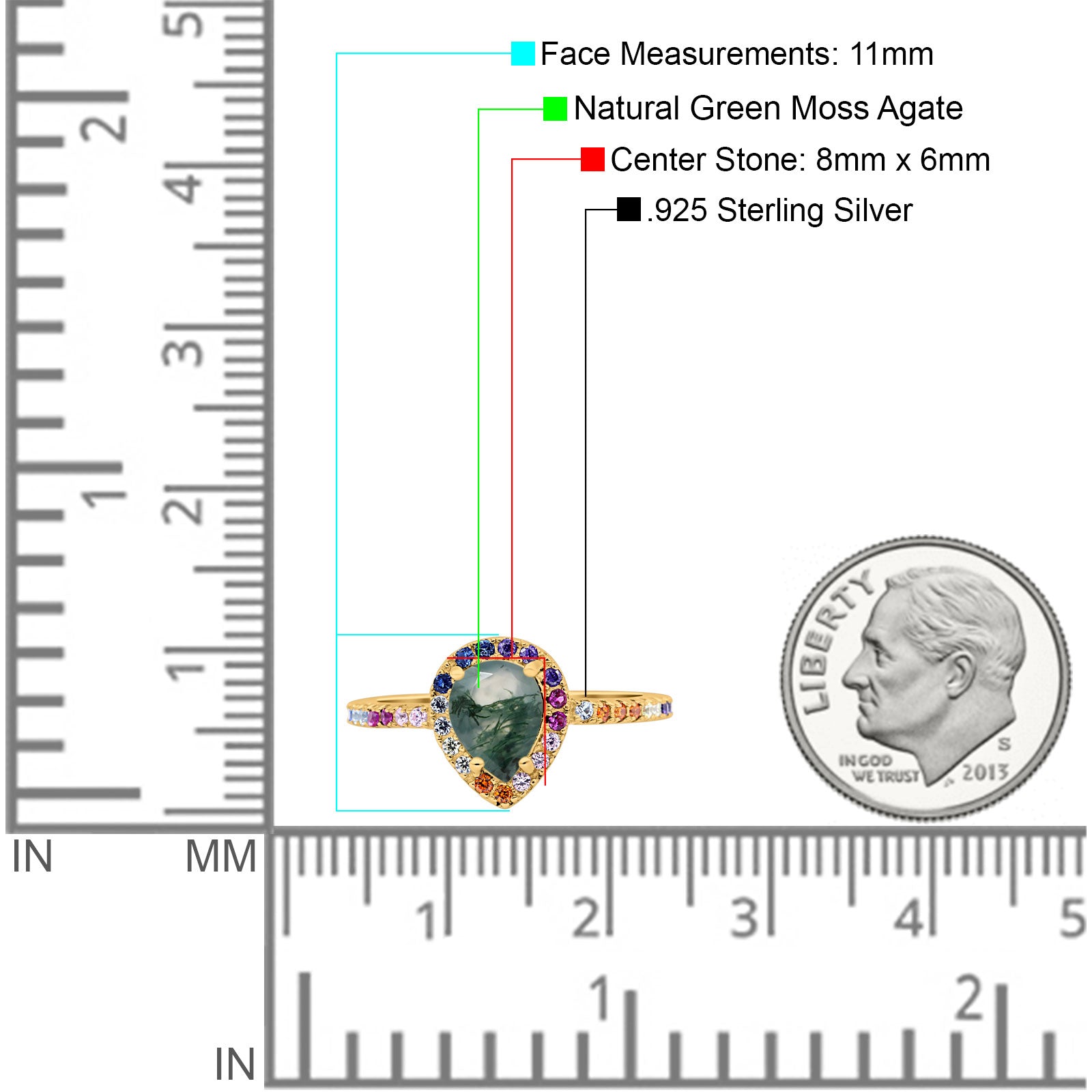Teardrop Pear Natural Green Moss Agate Vintage Style Ring 925 Sterling Silver