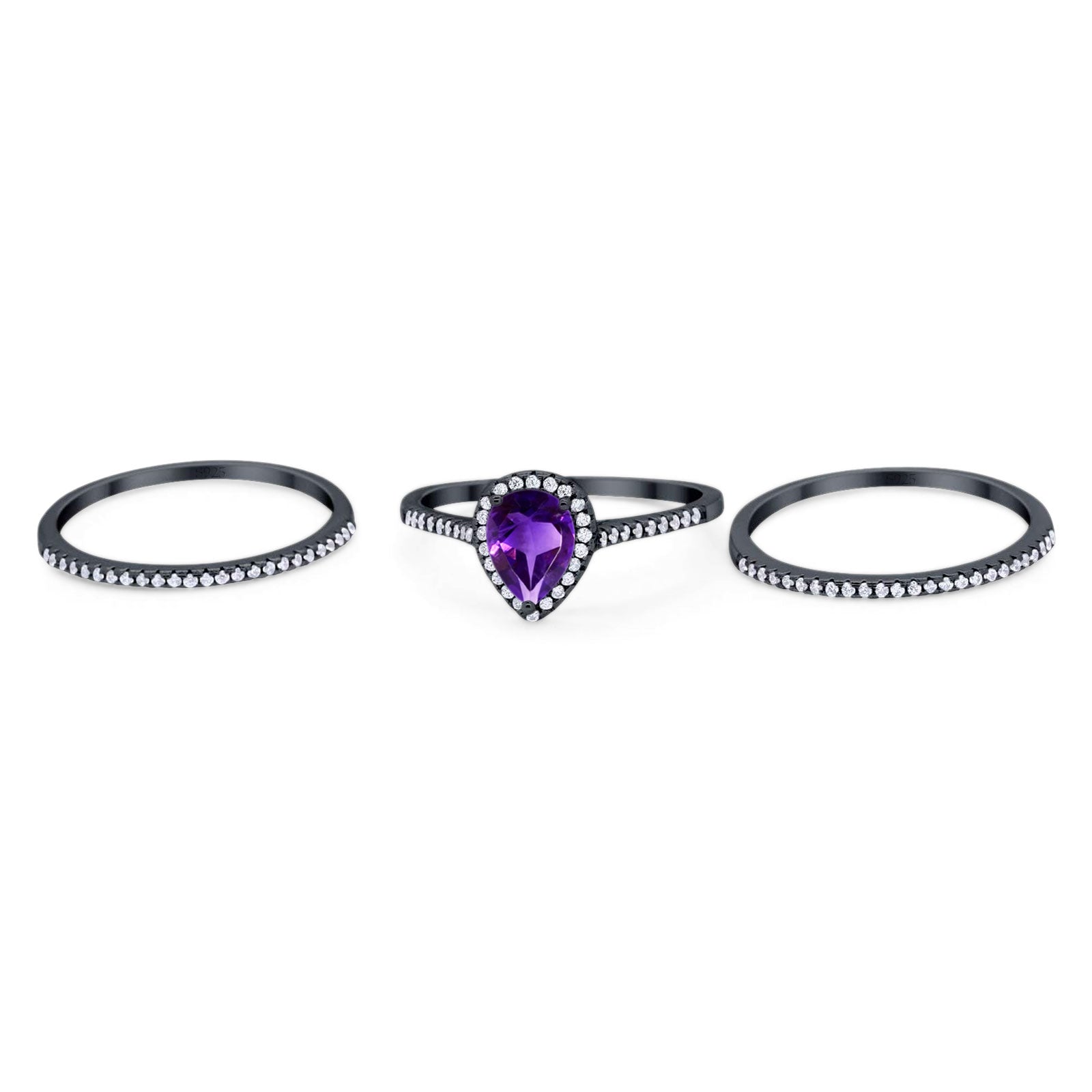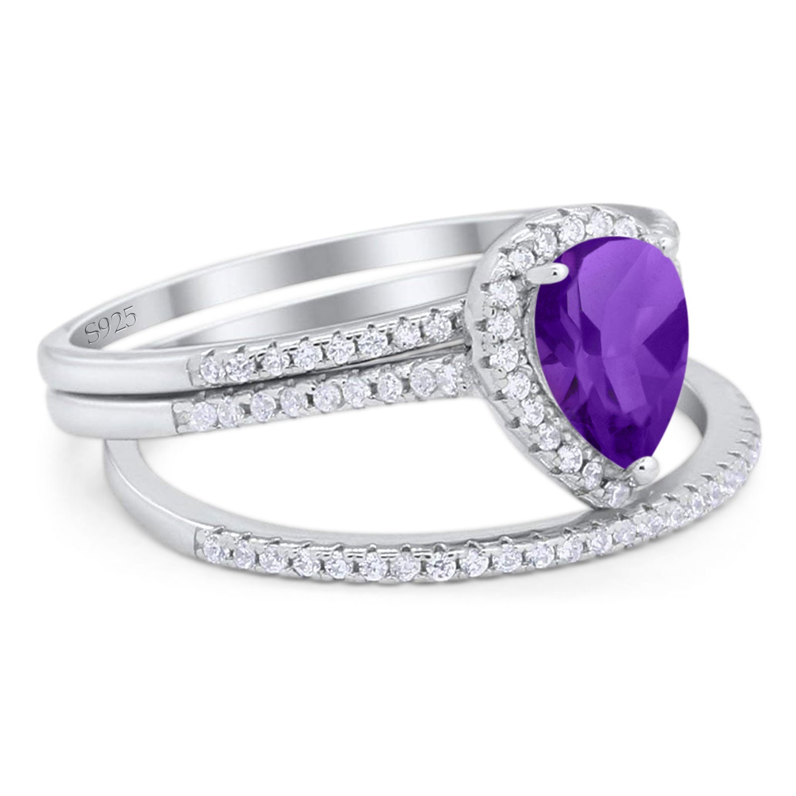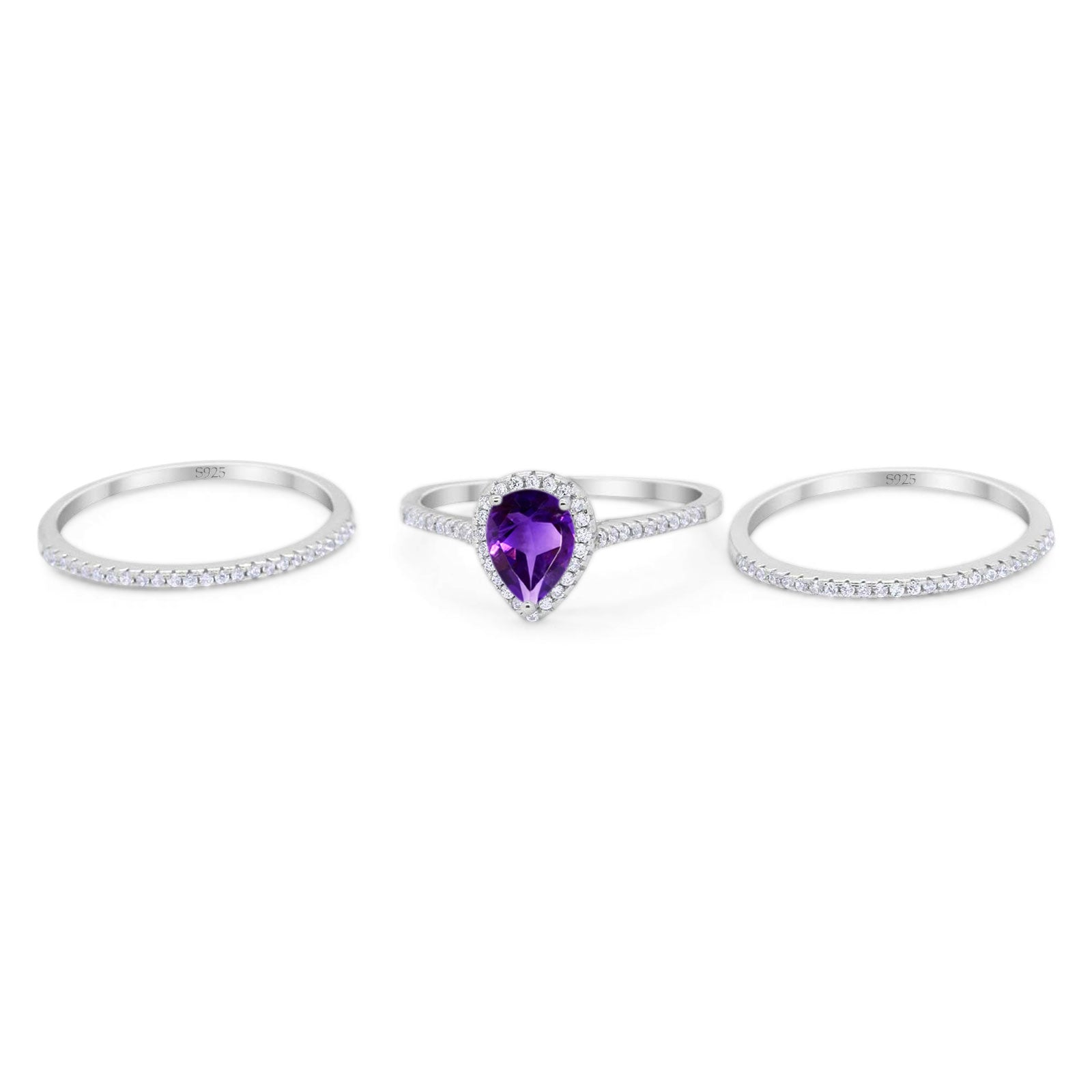 Three Piece Art Deco Pear Teardrop Natural Amethyst Bridal Ring 925 Sterling Silver