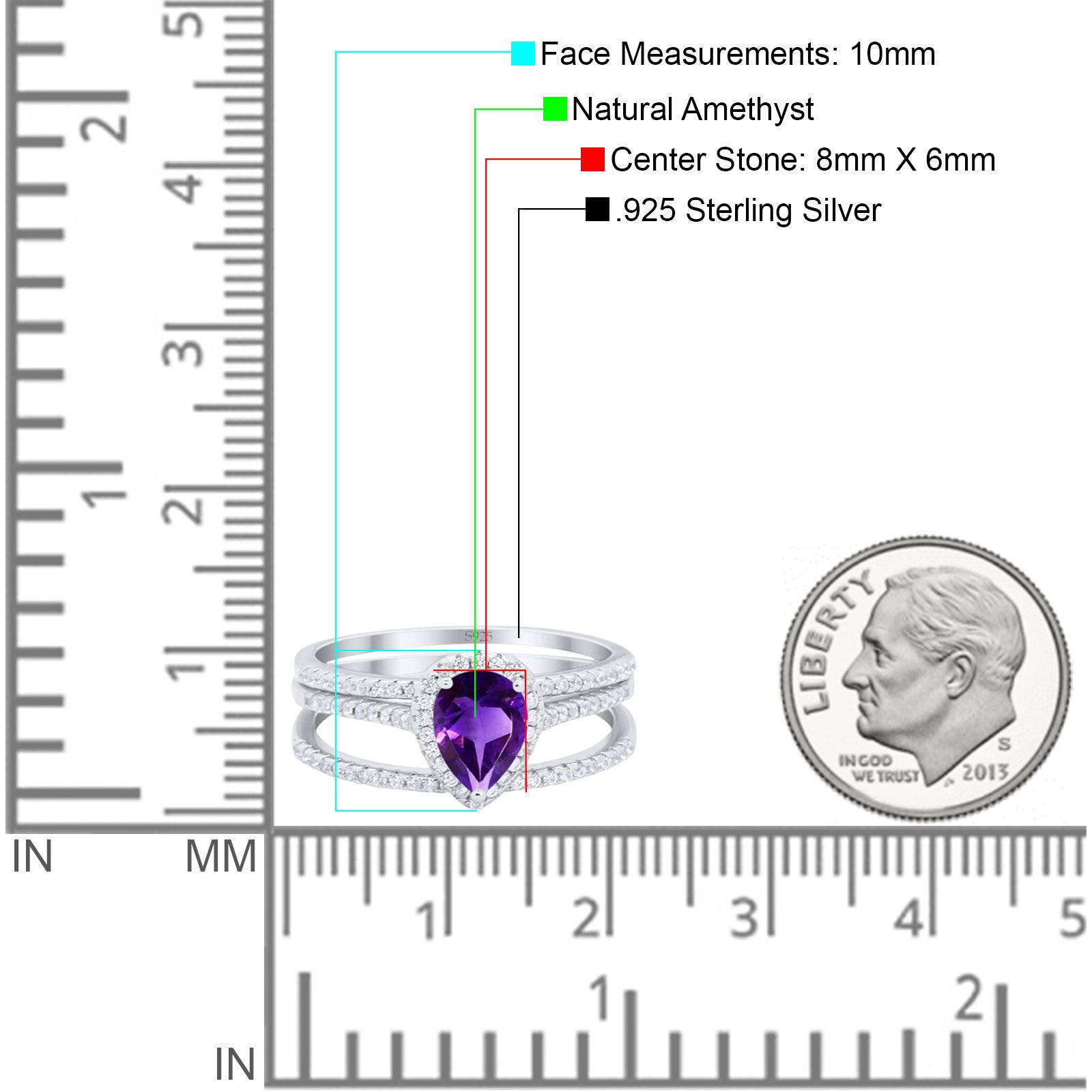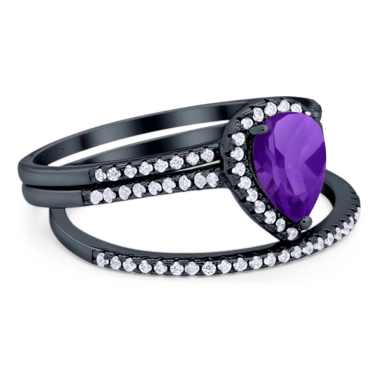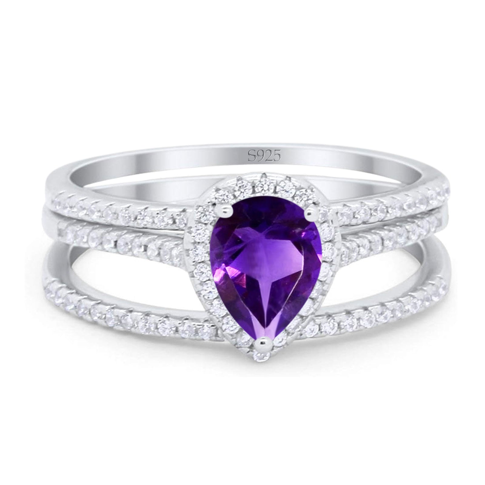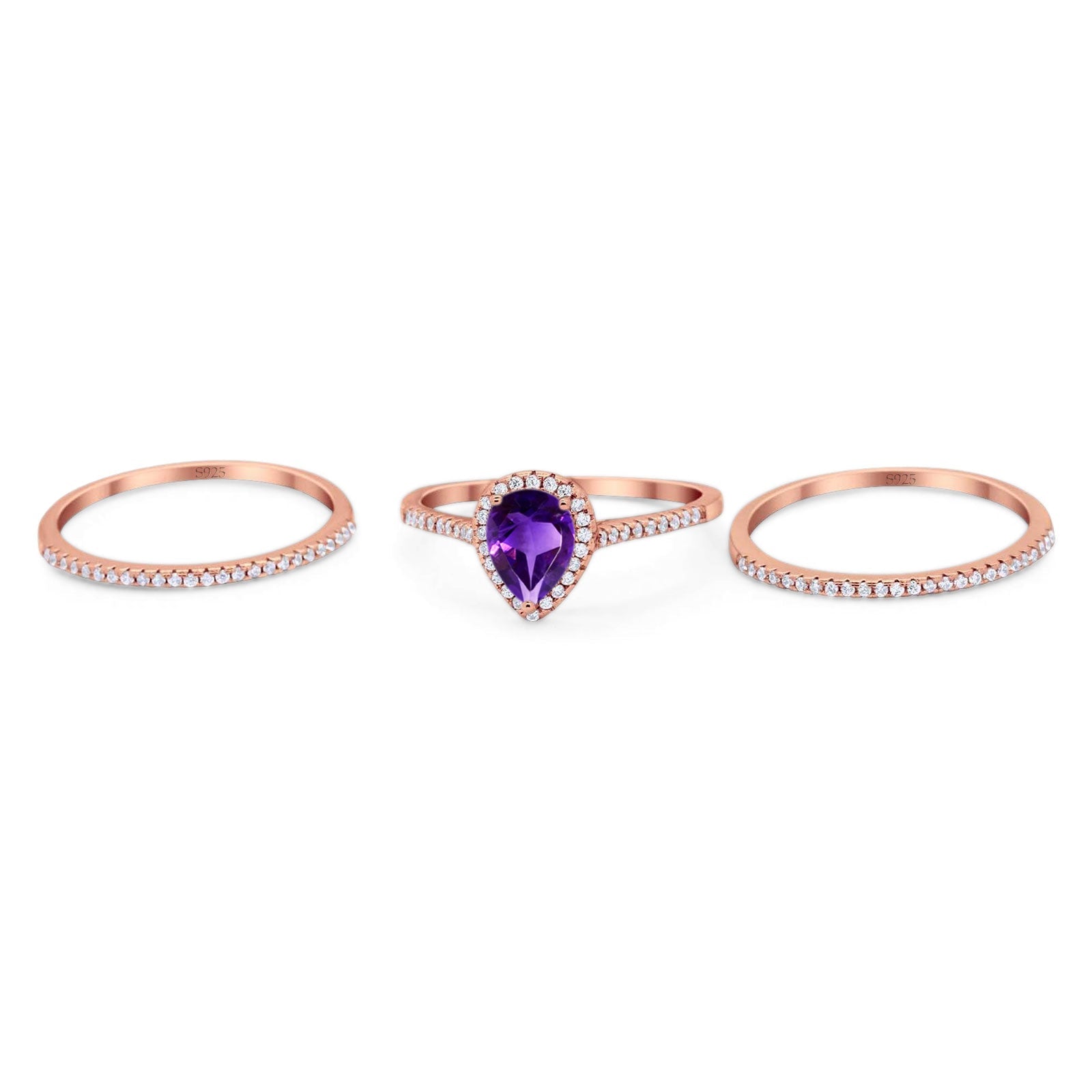 Three Piece Art Deco Pear Teardrop Natural Amethyst Bridal Ring 925 Sterling Silver