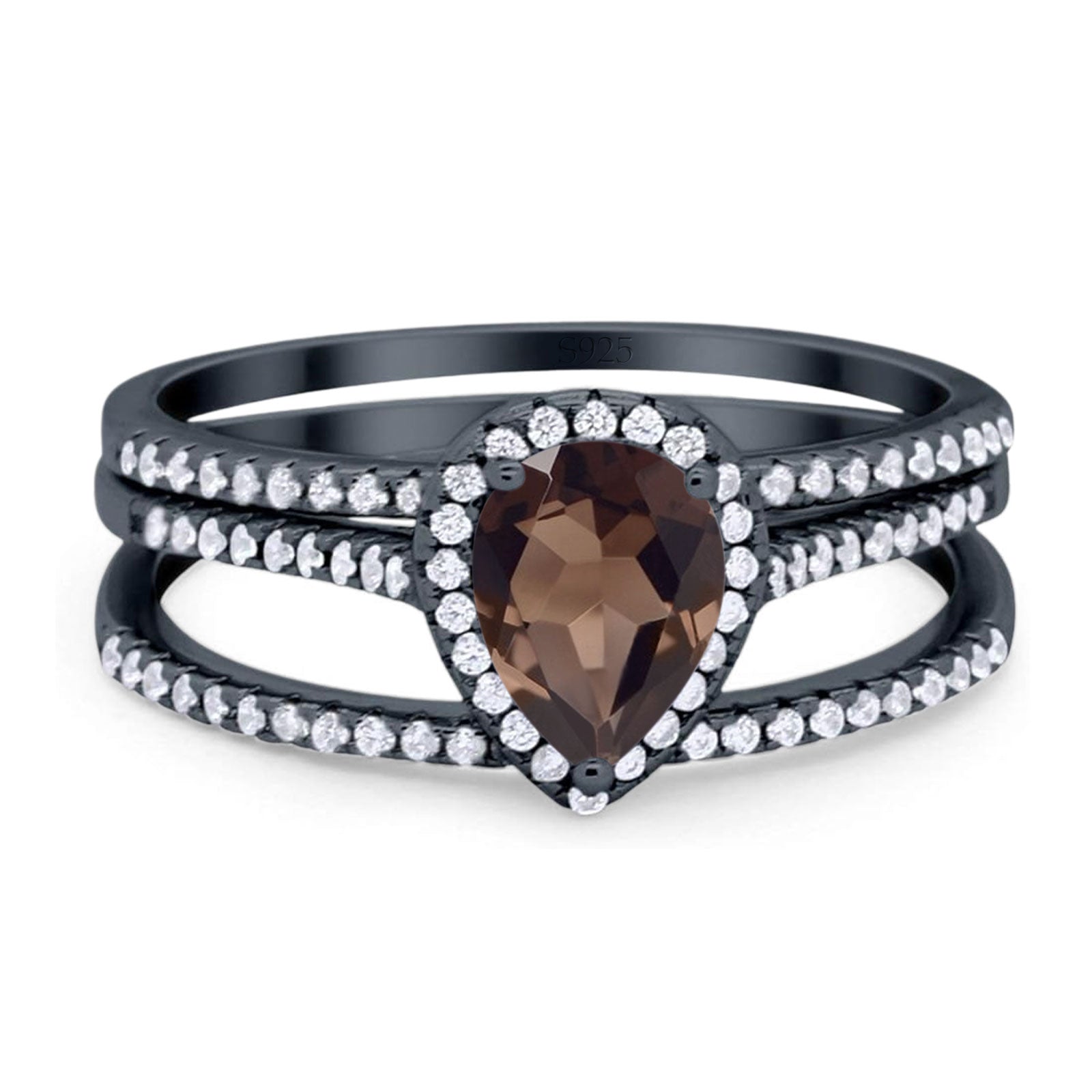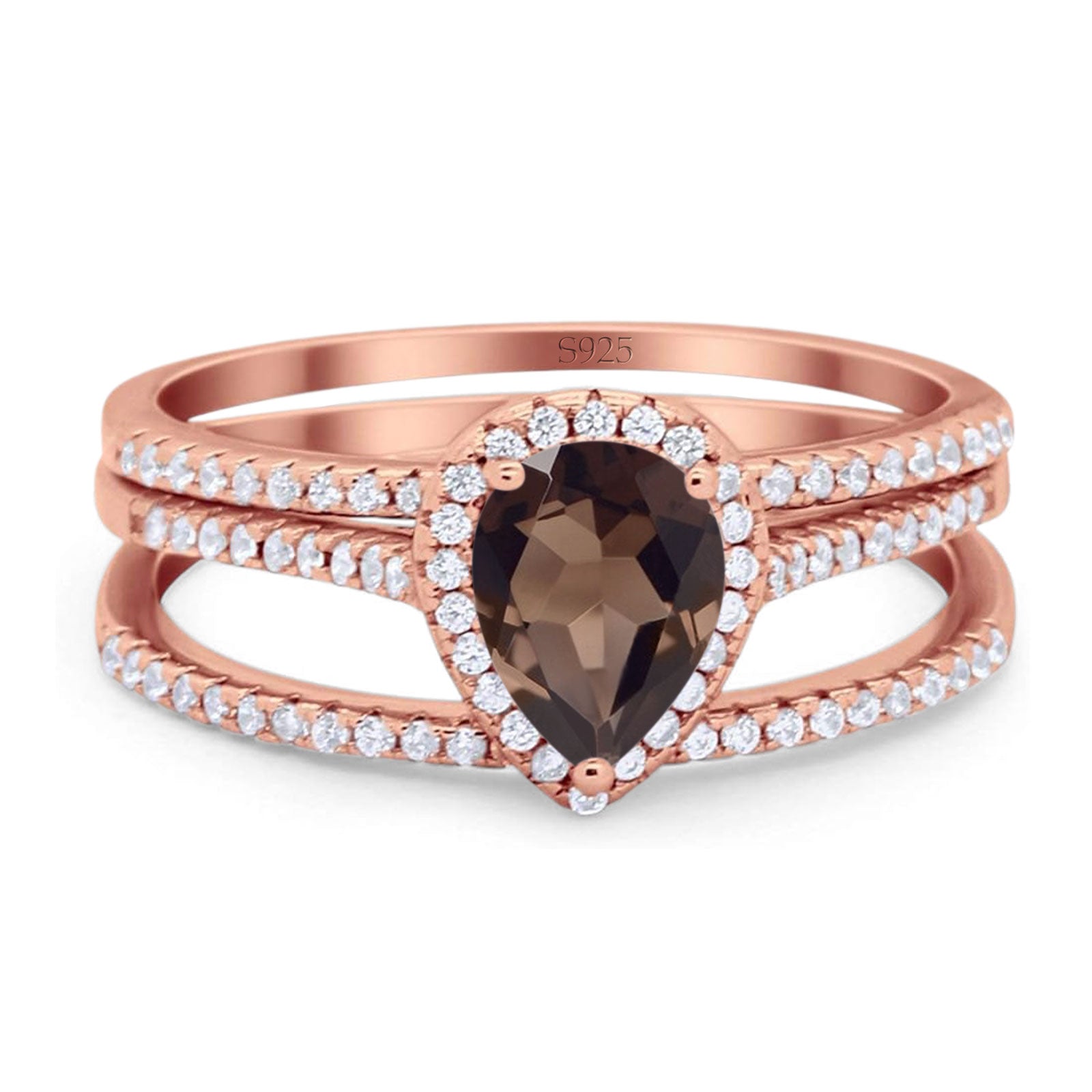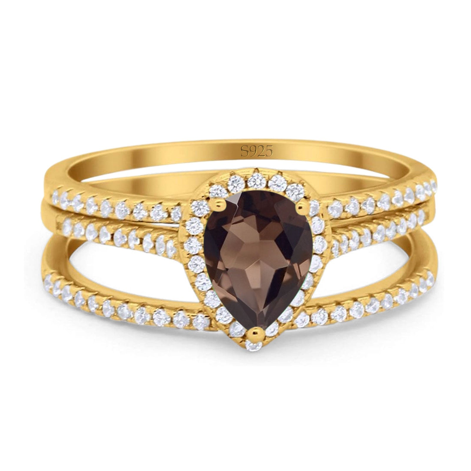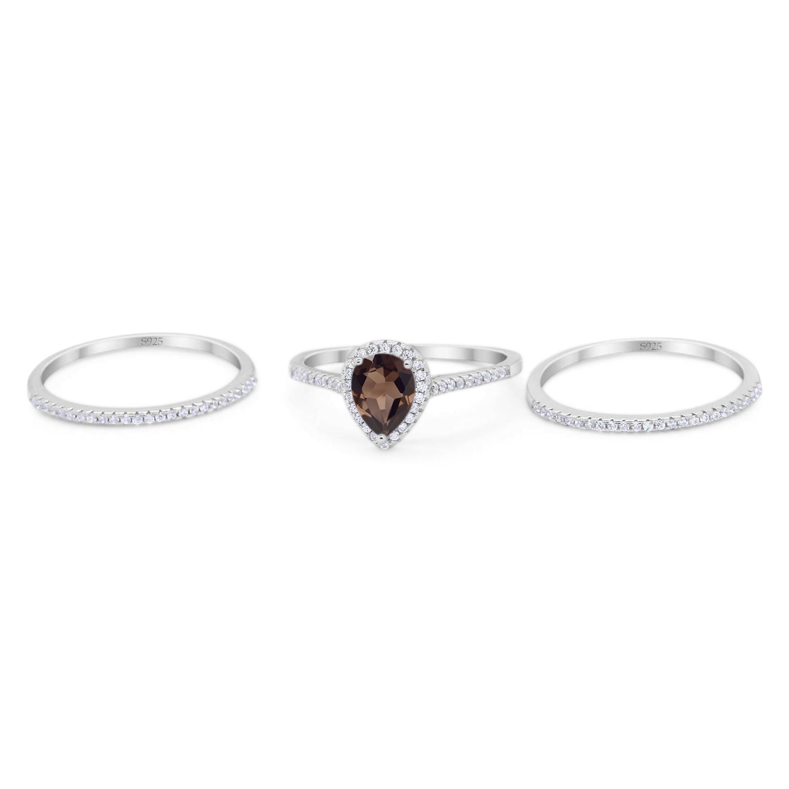 Three Piece Art Deco Pear Teardrop Natural Chocolate Smoky Quartz Bridal Ring 925 Sterling Silver