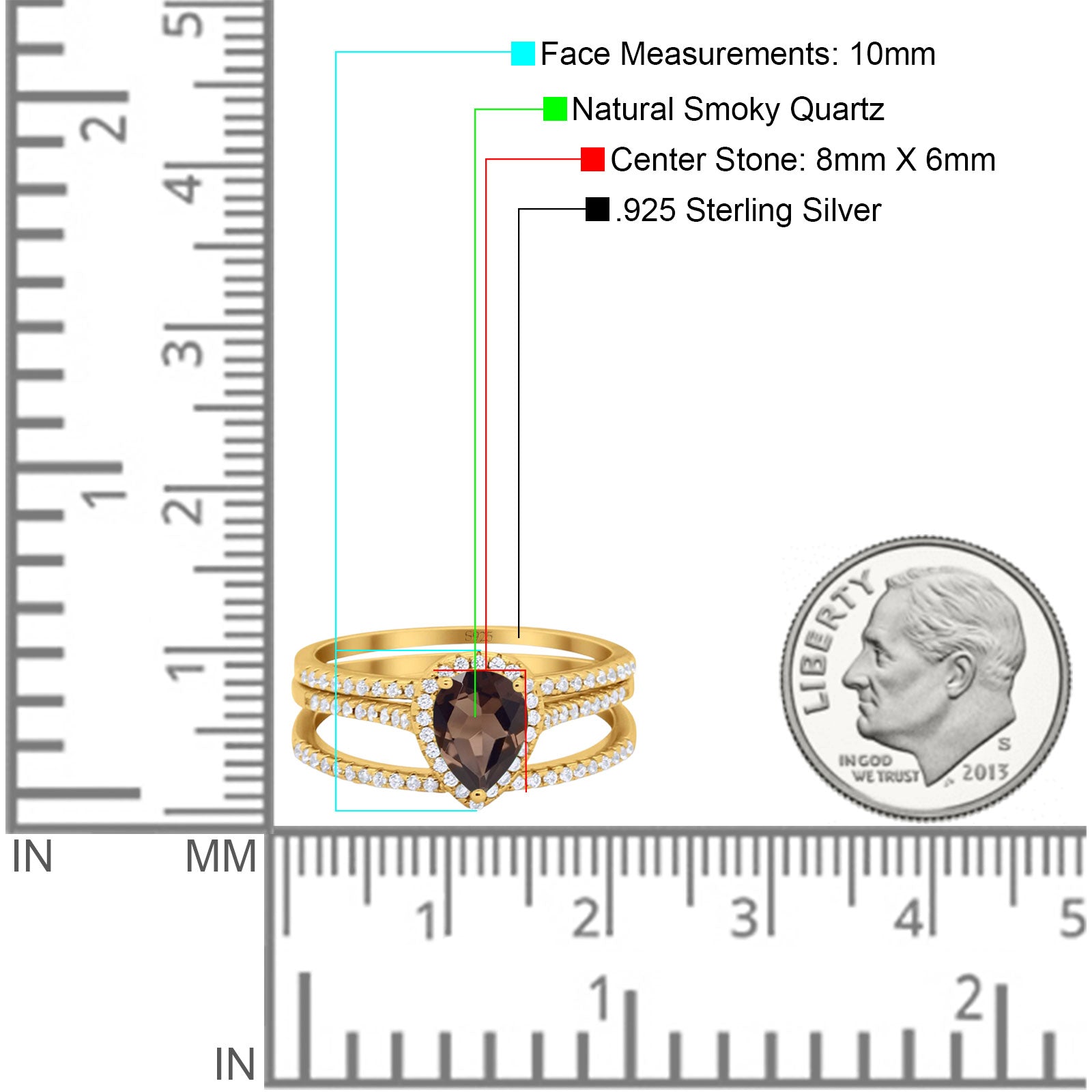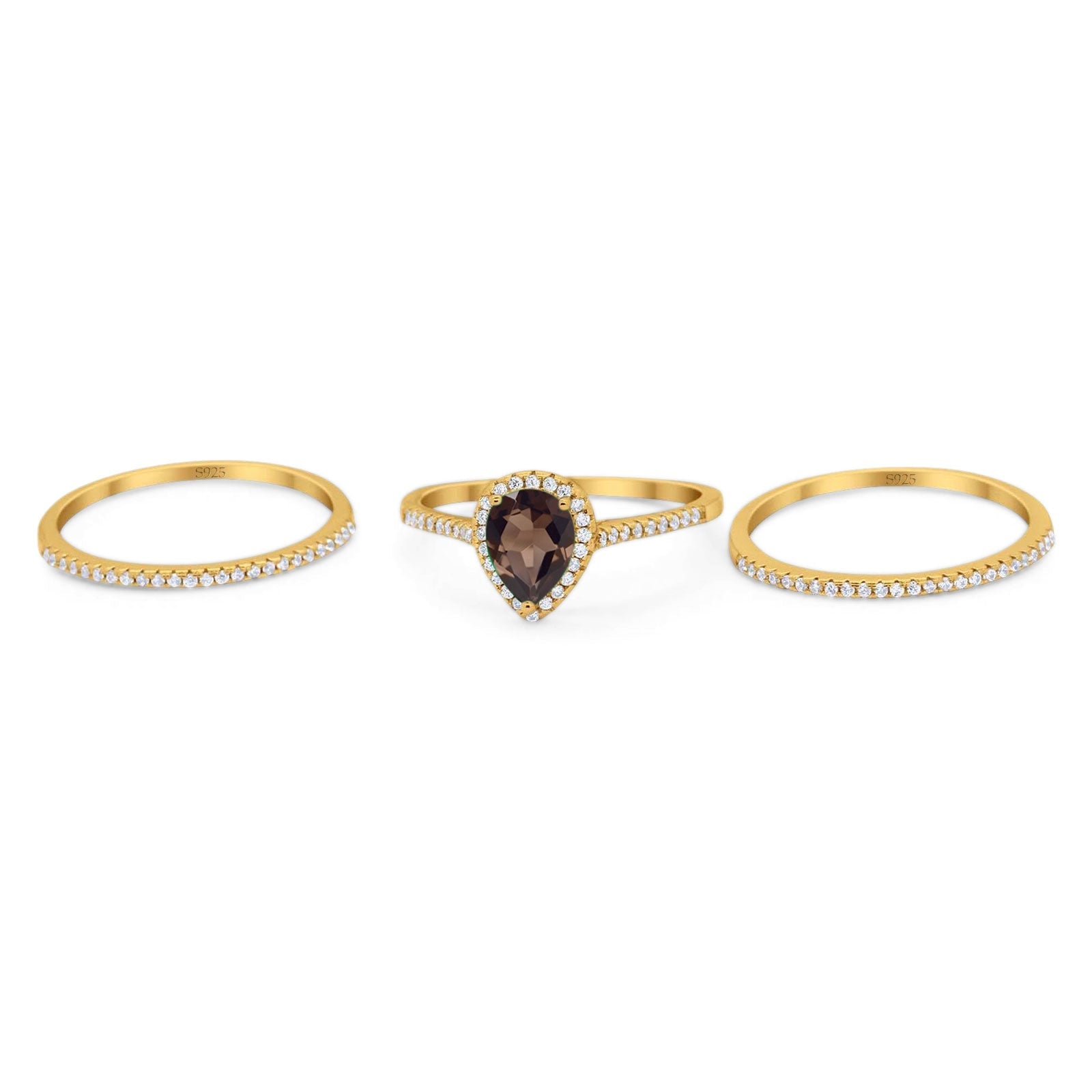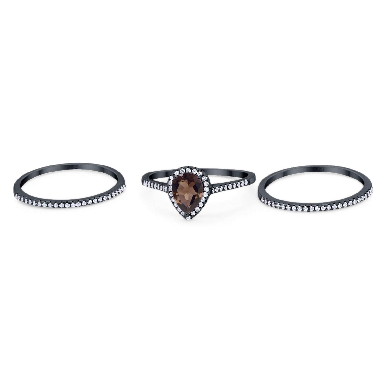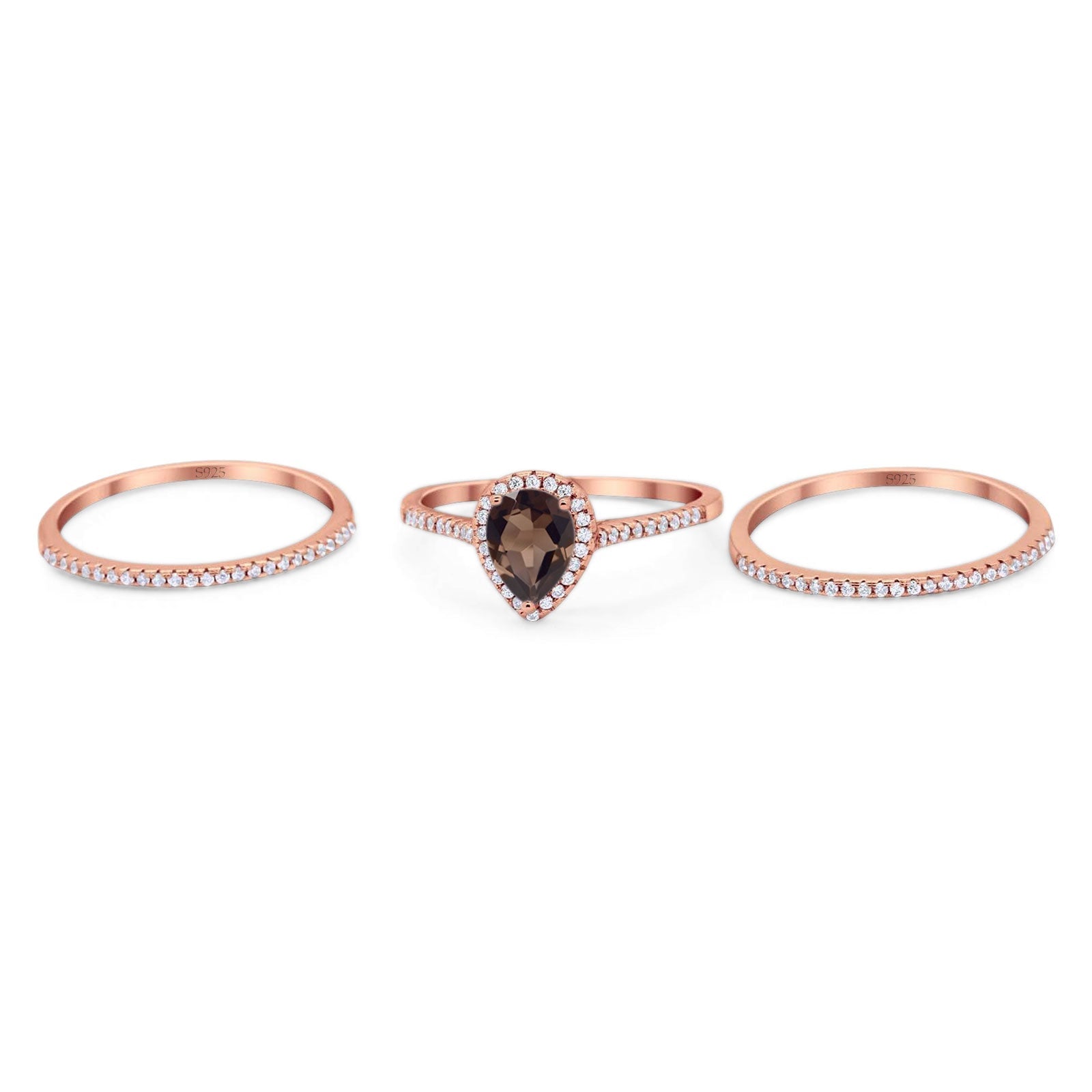 Three Piece Art Deco Pear Teardrop Natural Chocolate Smoky Quartz Bridal Ring 925 Sterling Silver