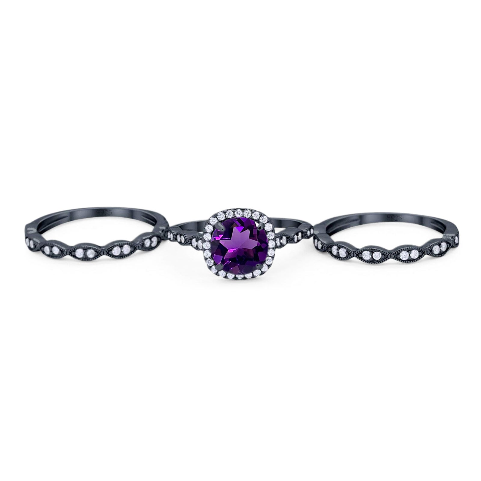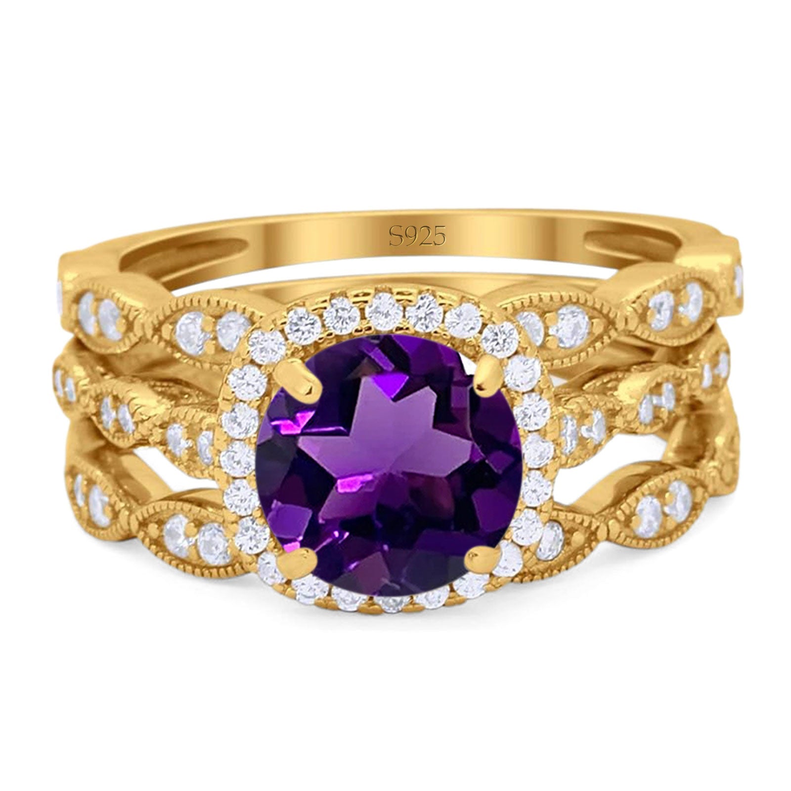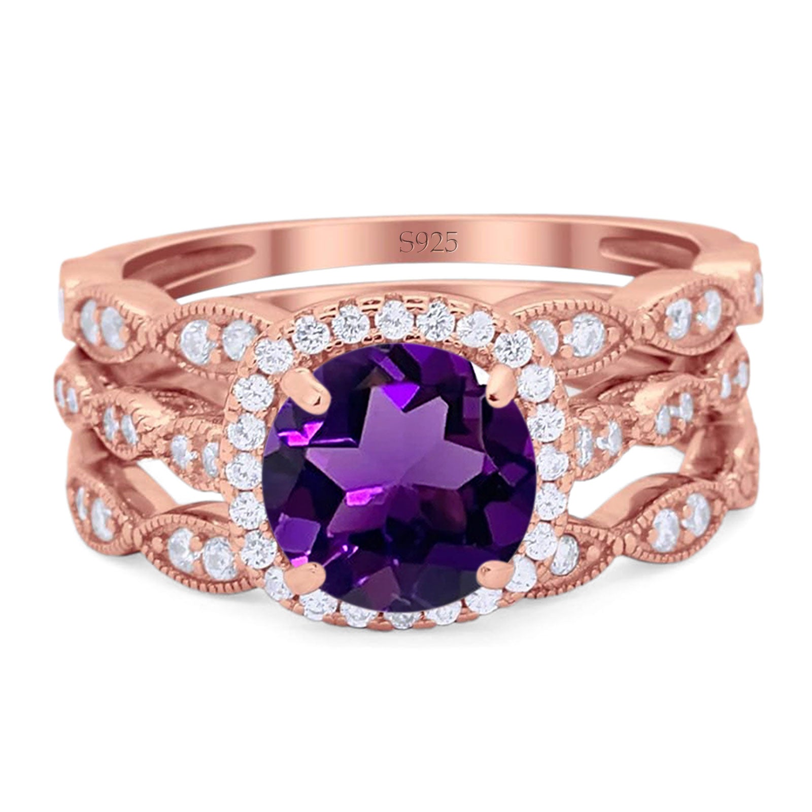 Three Piece Art Deco Round Natural Amethyst Bridal Ring 925 Sterling Silver