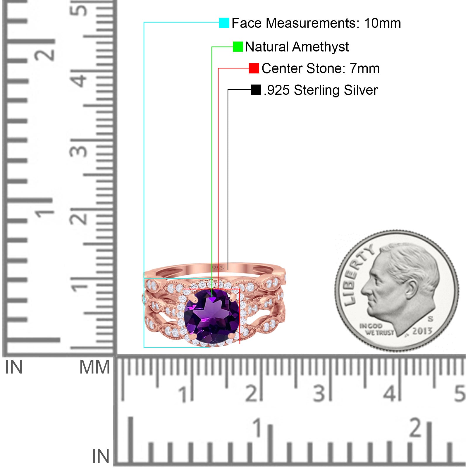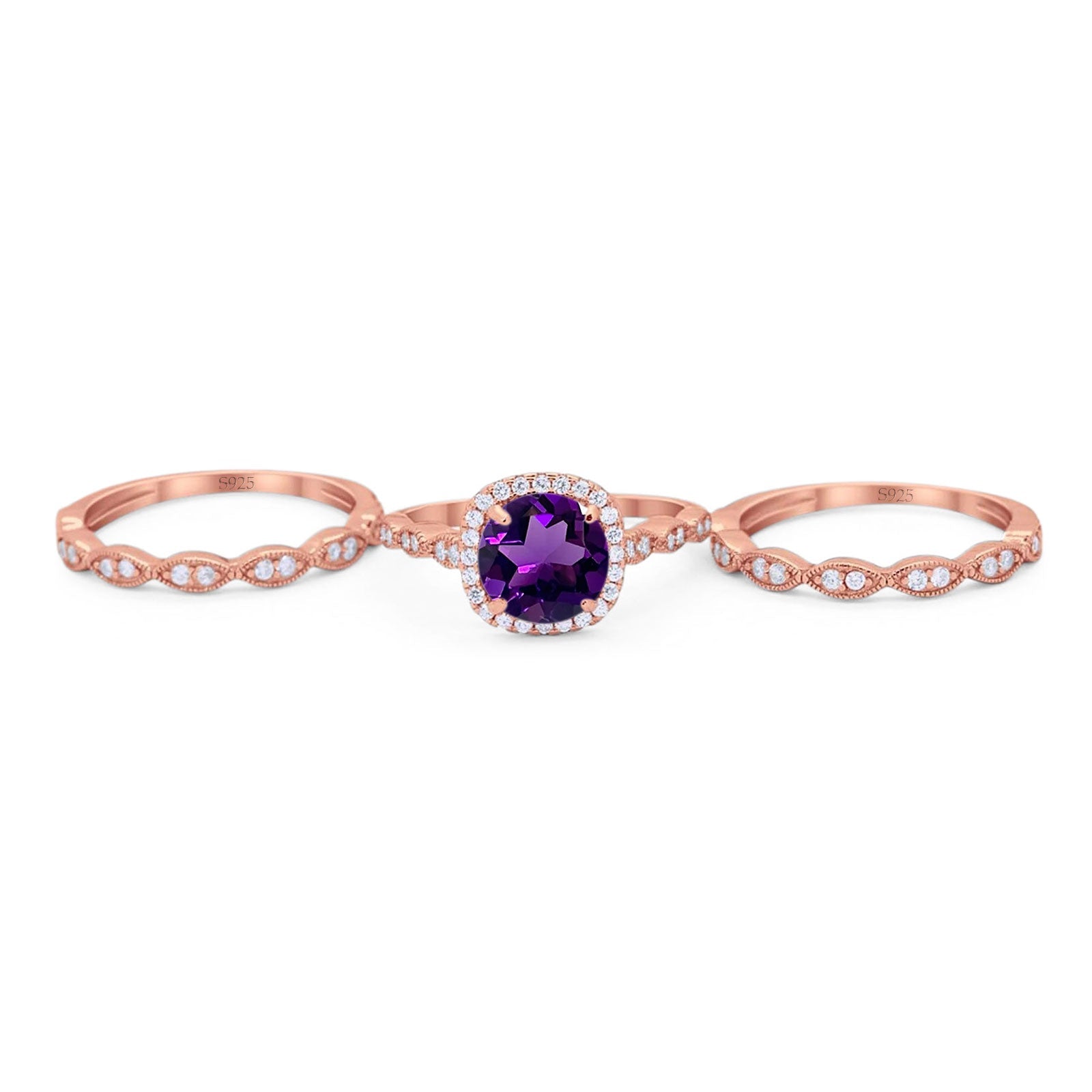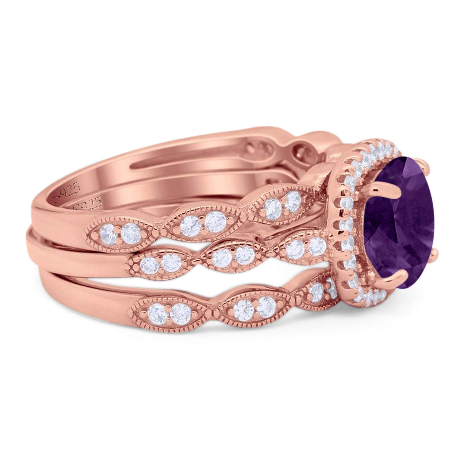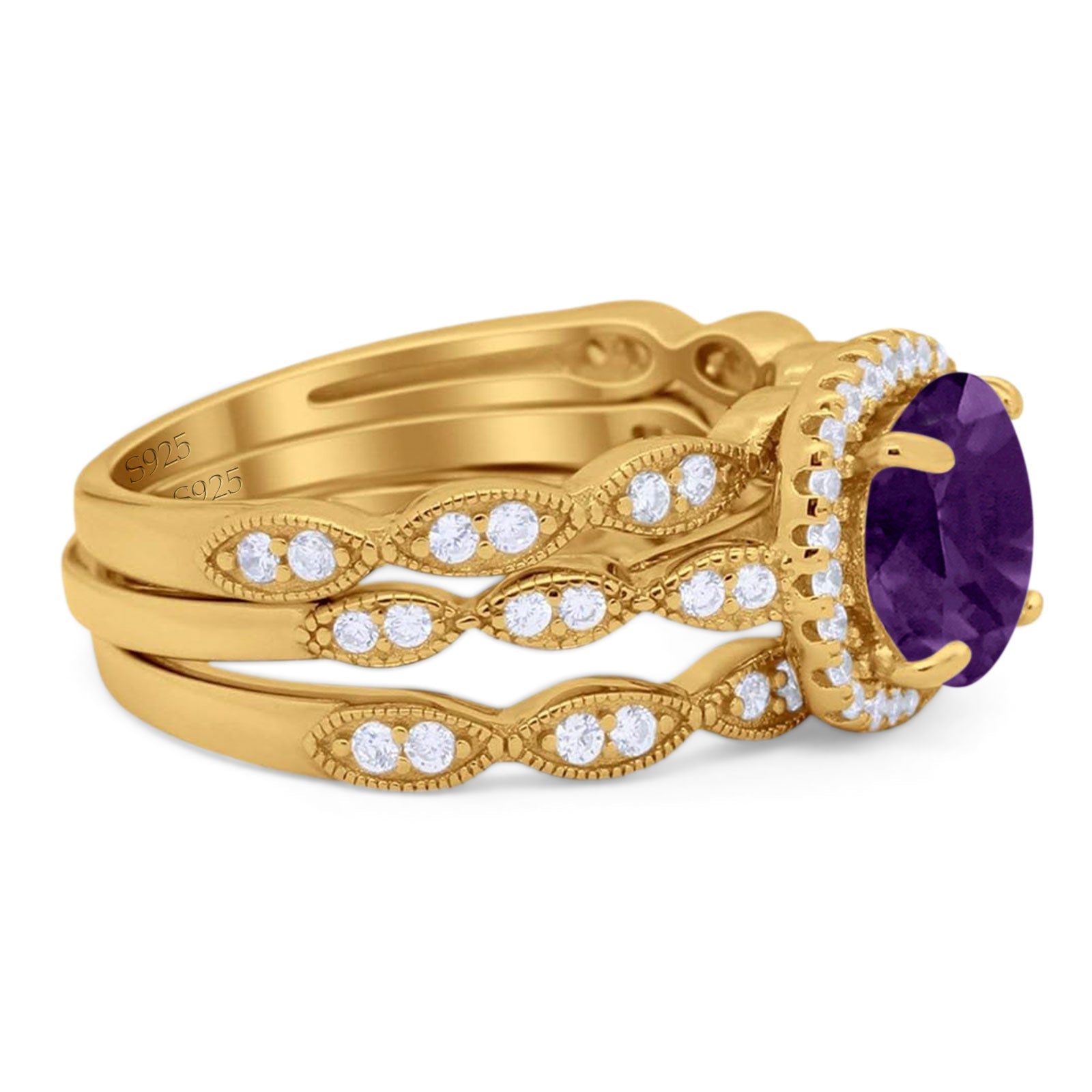 Three Piece Art Deco Round Natural Amethyst Bridal Ring 925 Sterling Silver