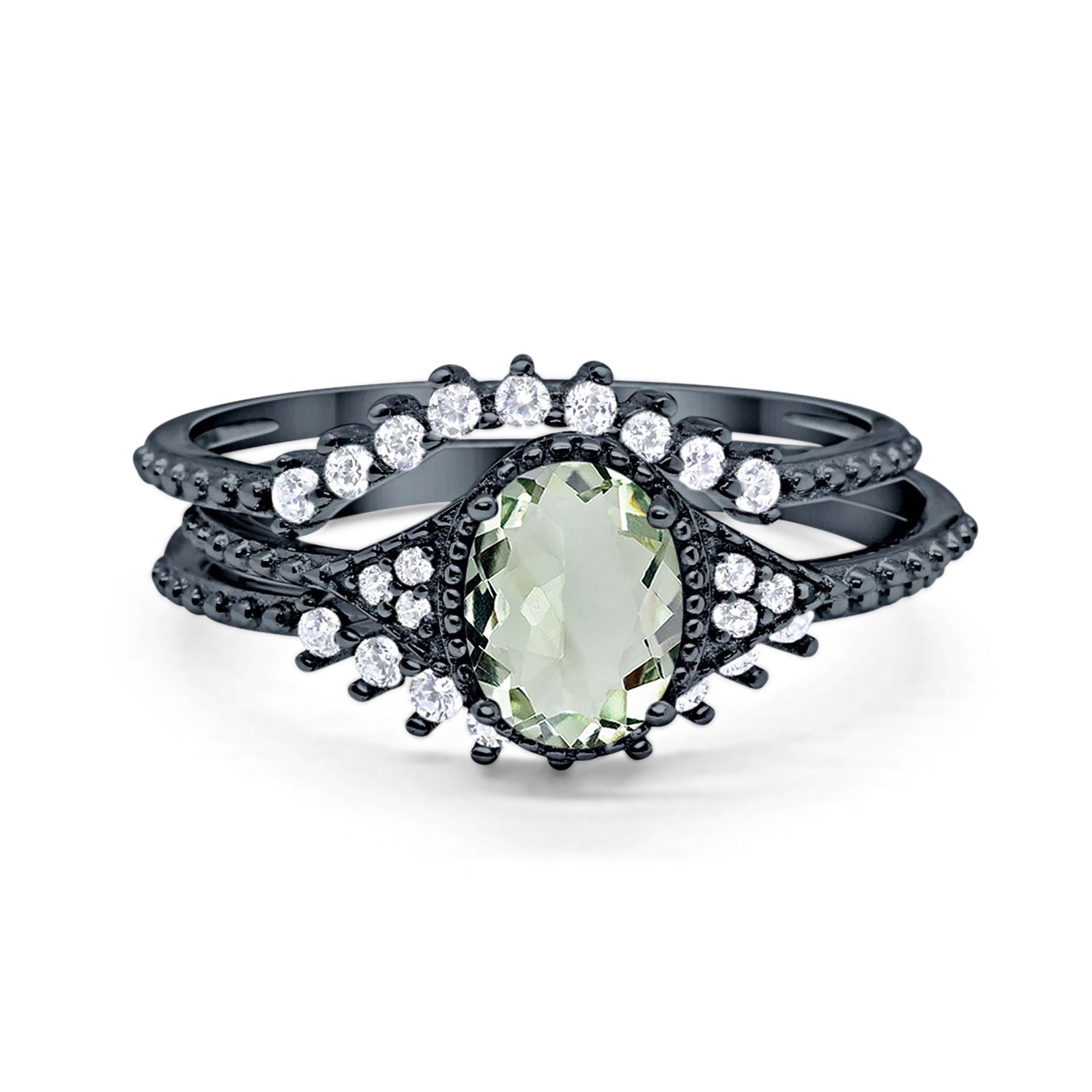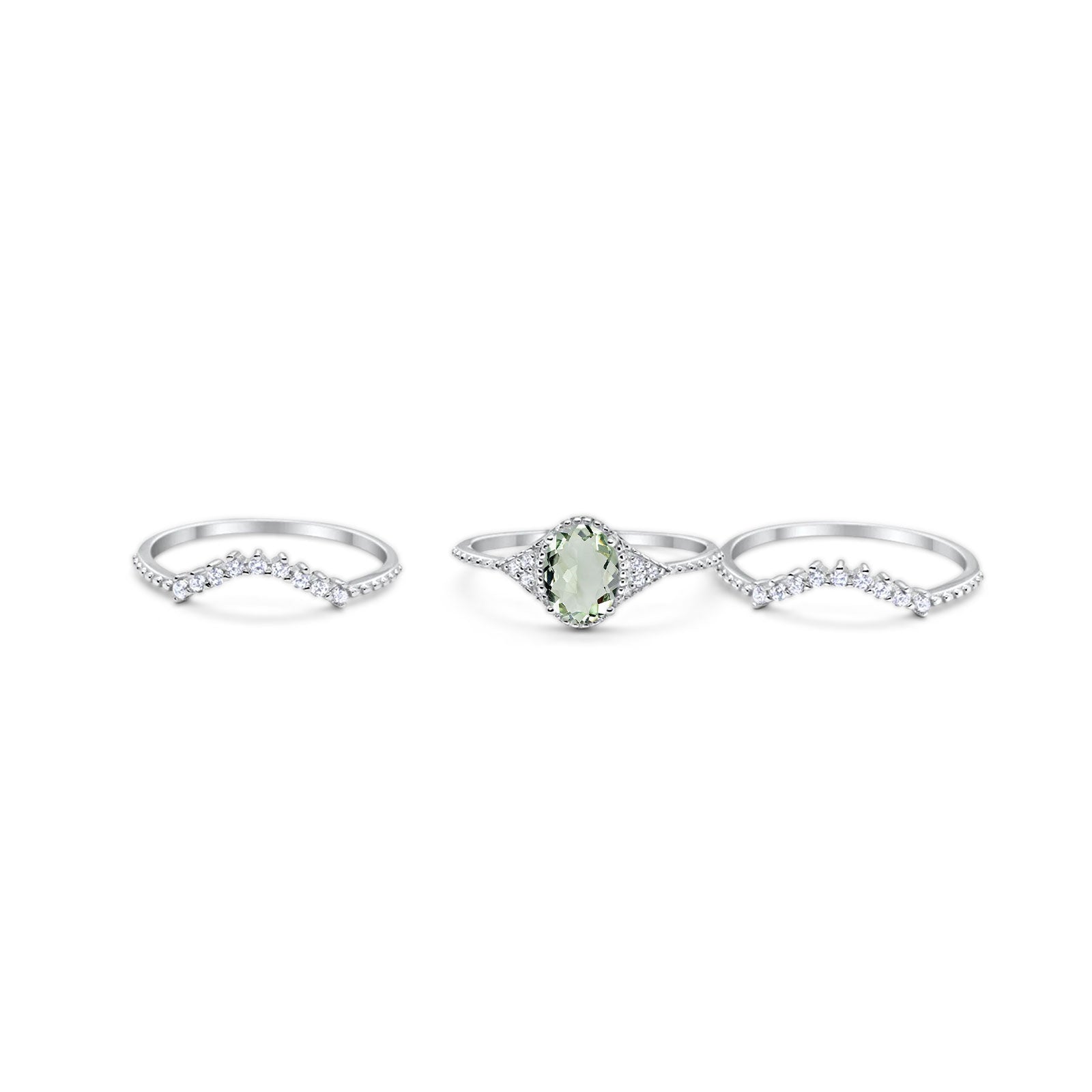 Three Piece Oval Natural Green Amethyst Prasiolite Beaded Ring 925 Sterling Silver