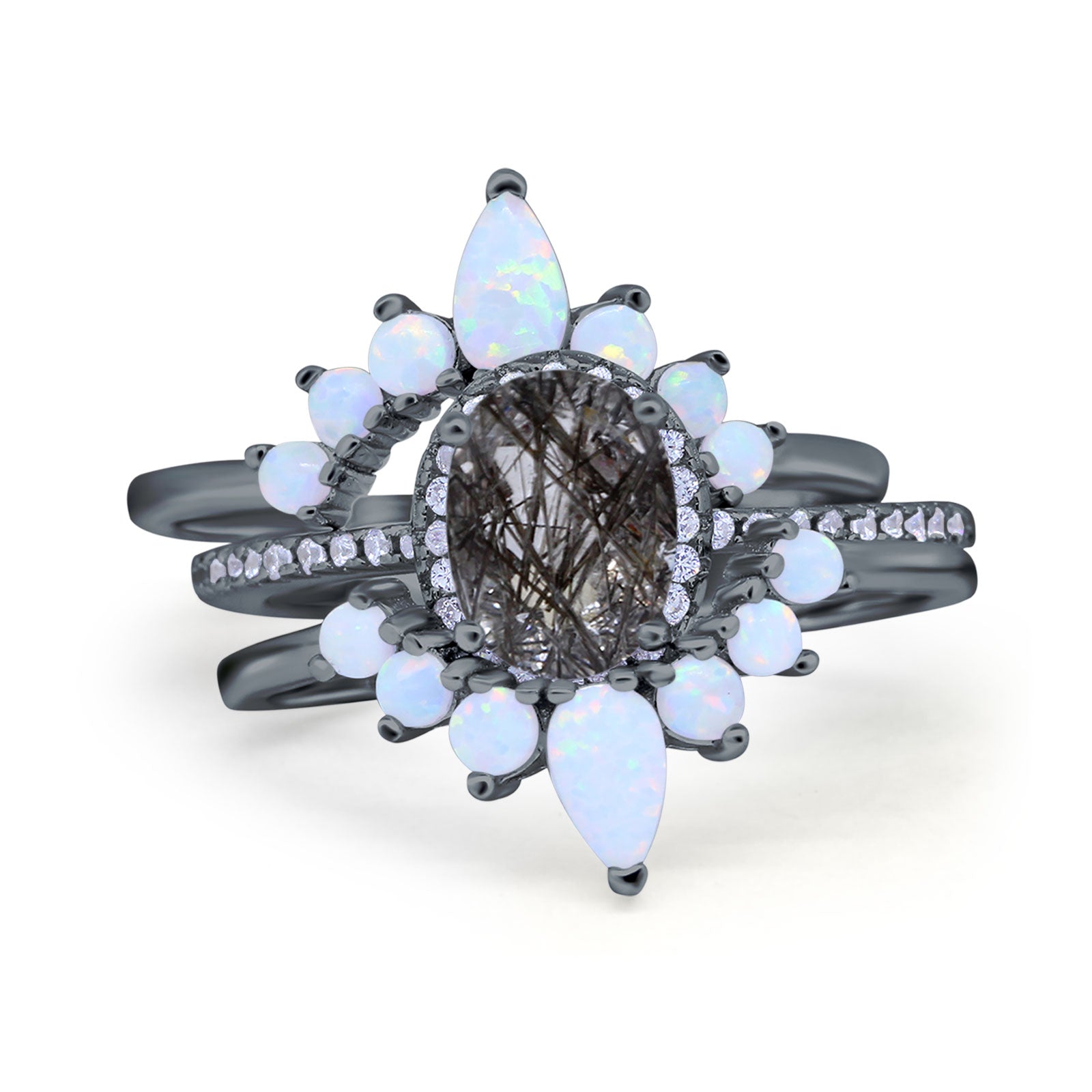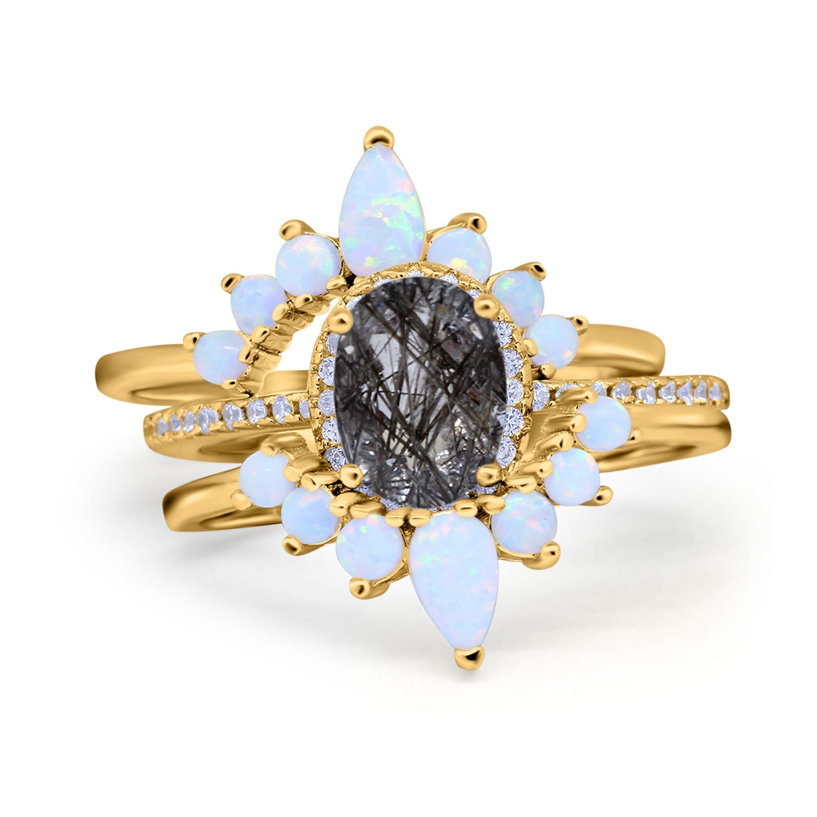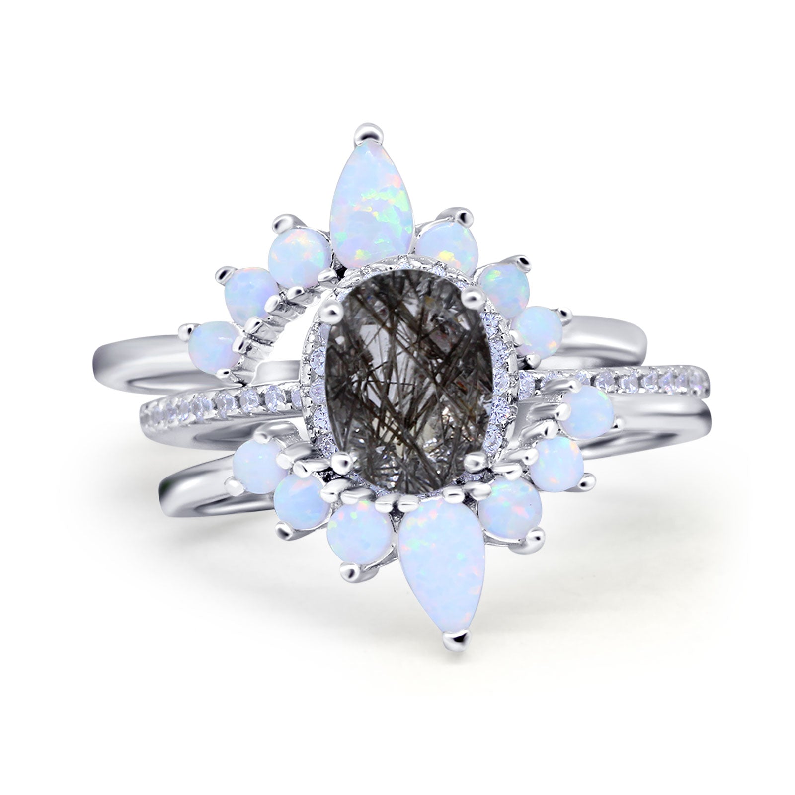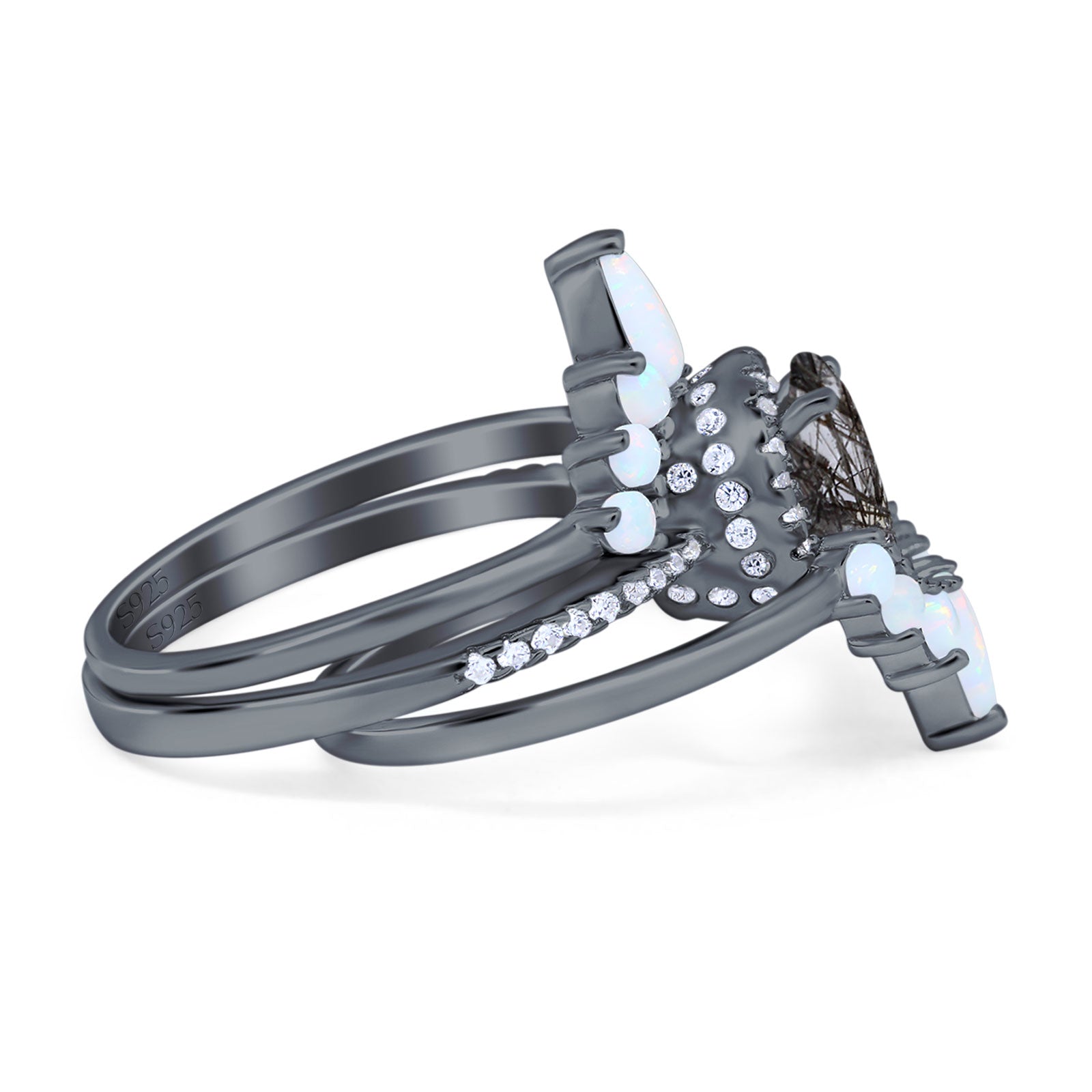 Three Piece Oval Natural Rutilated Quartz Chevron Ring 925 Sterling Silver