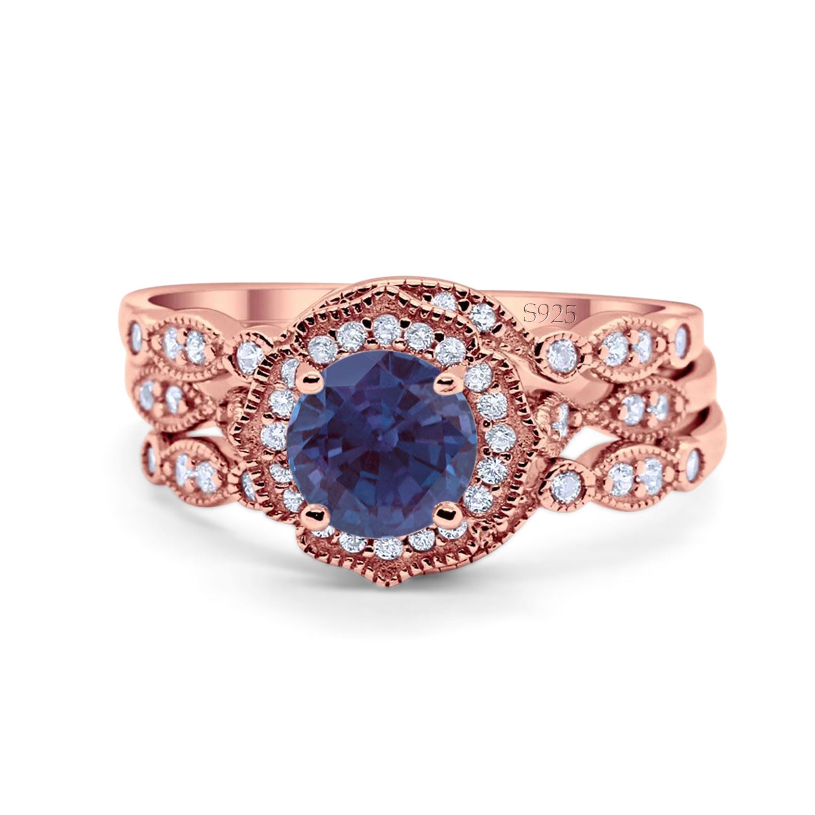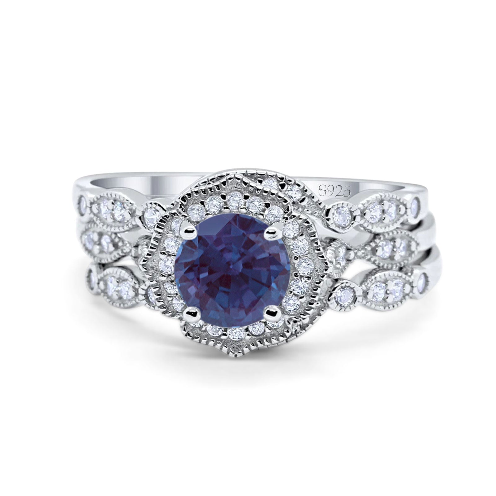 Three Piece Round Lab Alexandrite Flower Ring 925 Sterling Silver