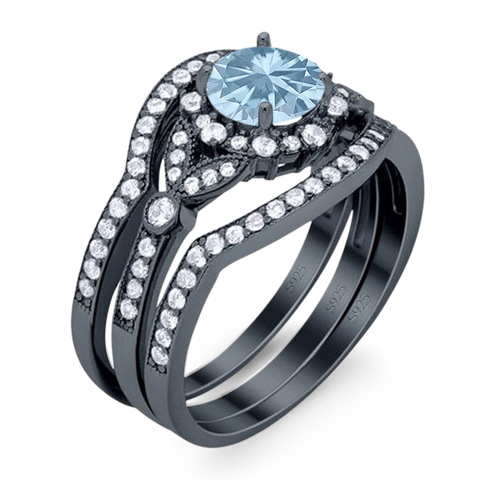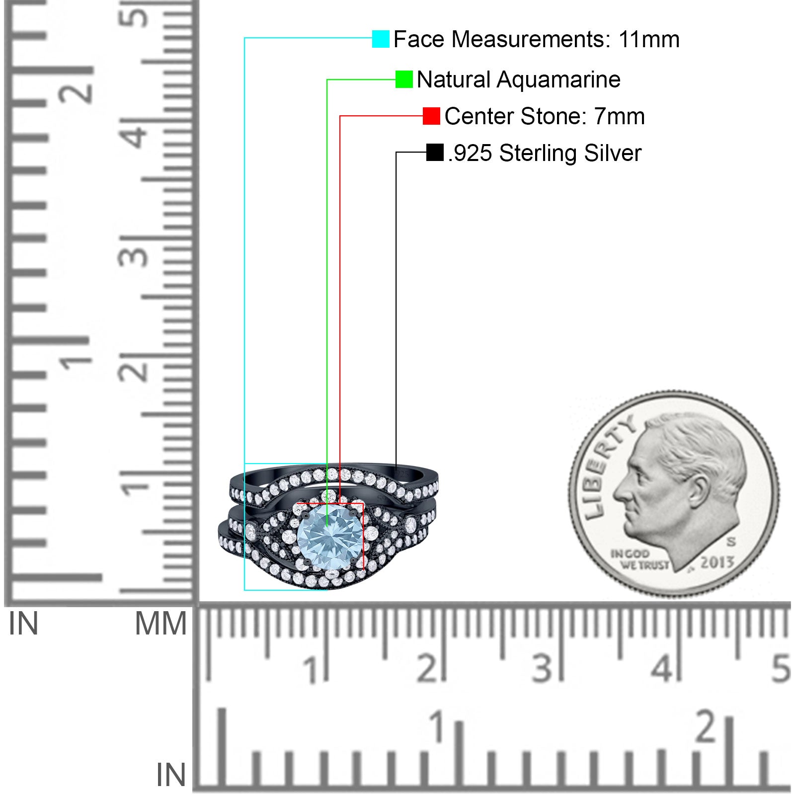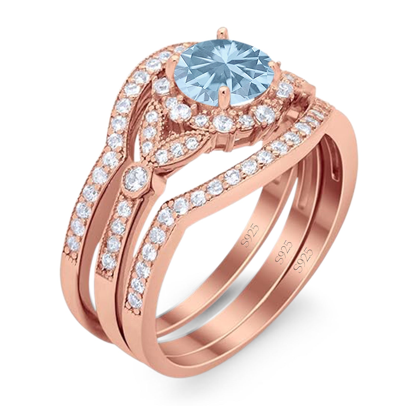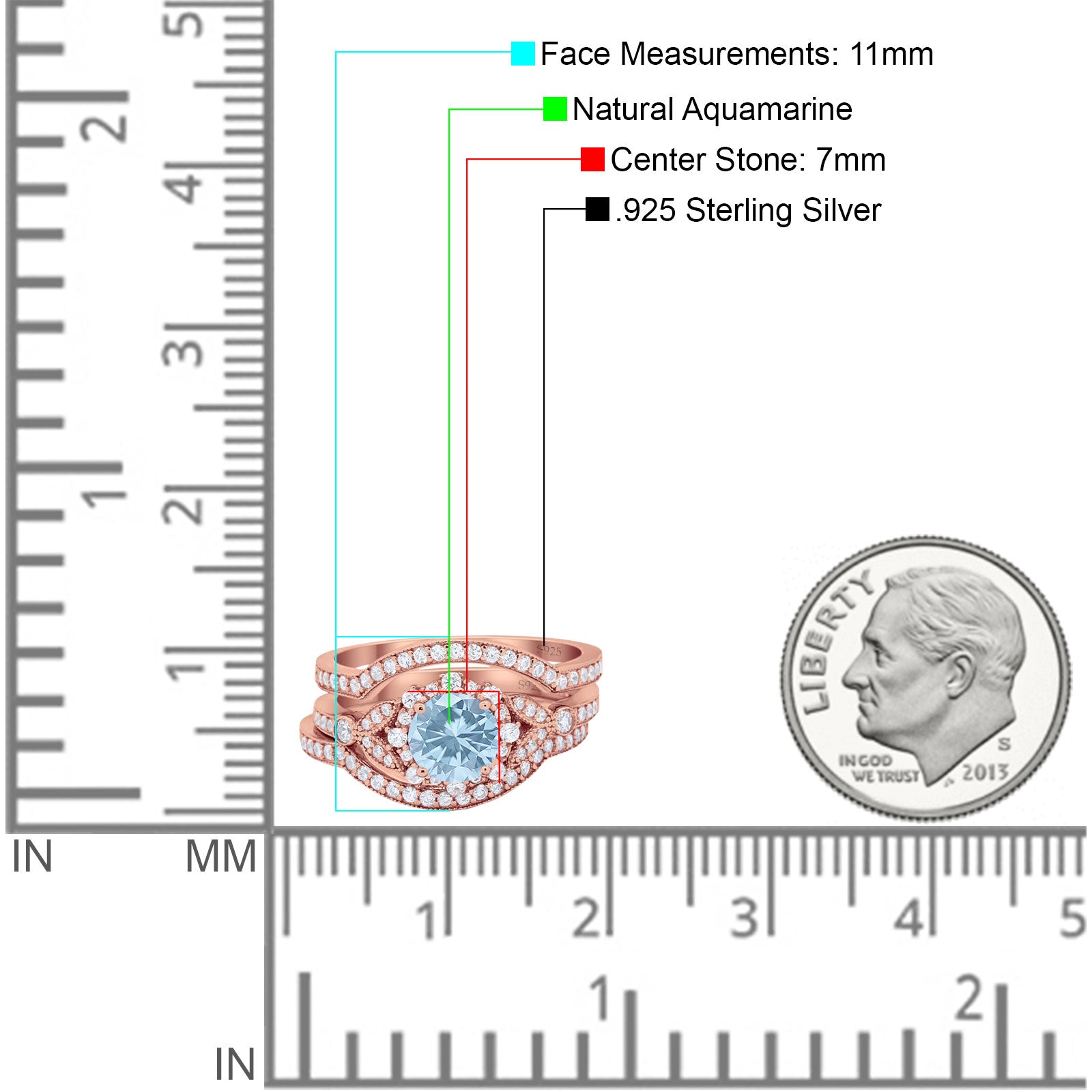 Three Piece Round Natural Aquamarine Leaf Style Bridal Ring 925 Sterling Silver