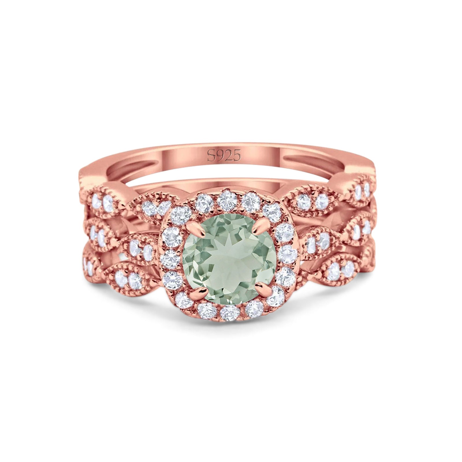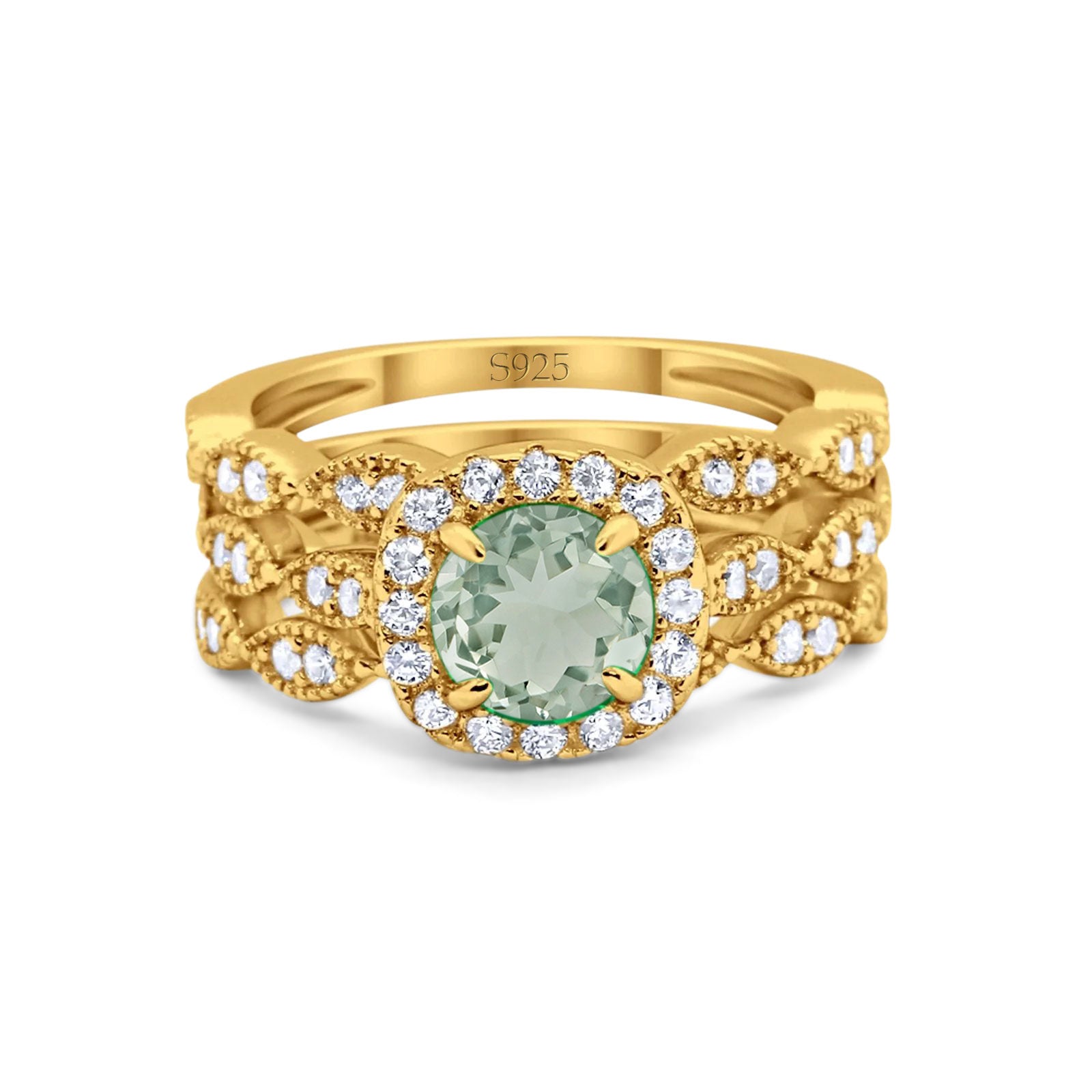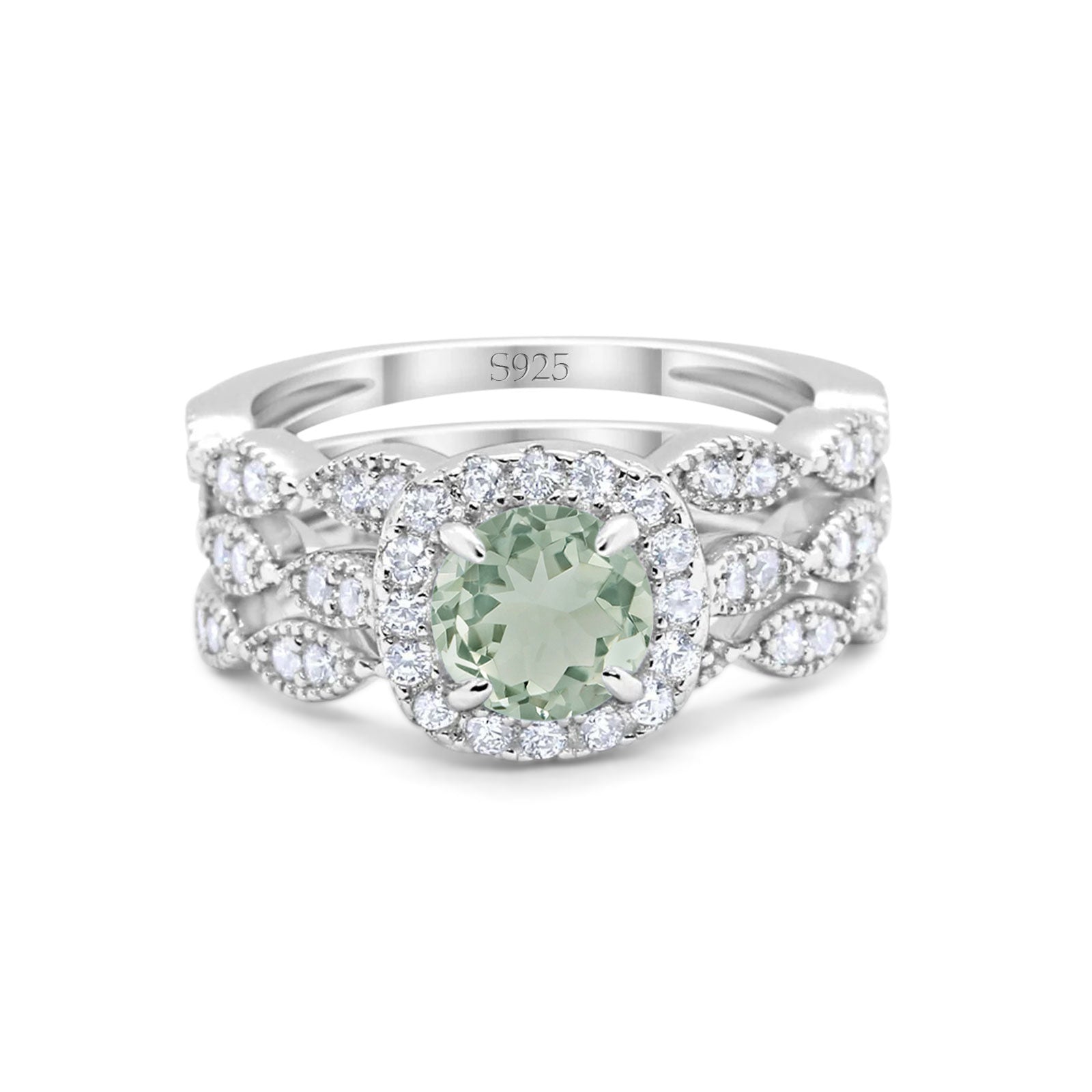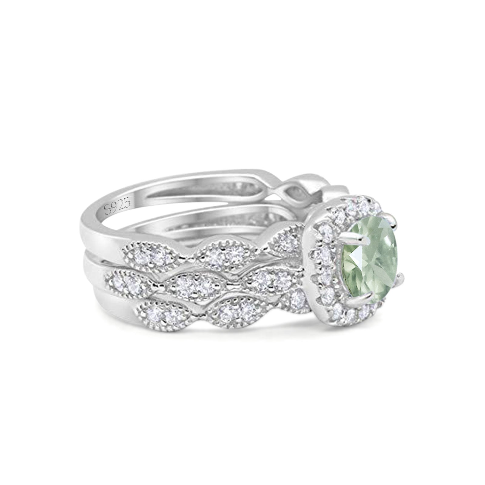Three Piece Round Natural Green Amethyst Prasiolite Wedding Set Ring 925 Sterling Silver