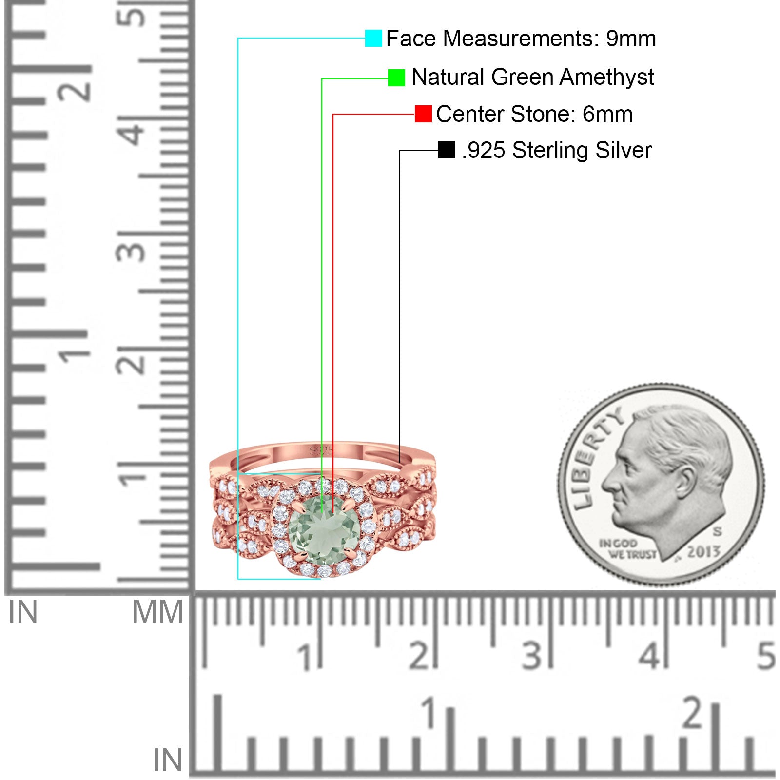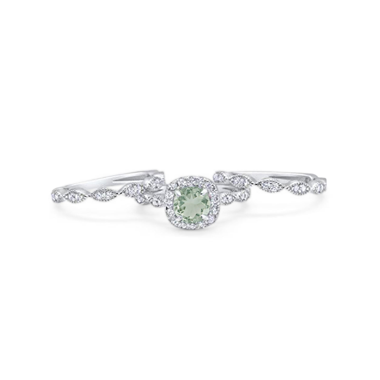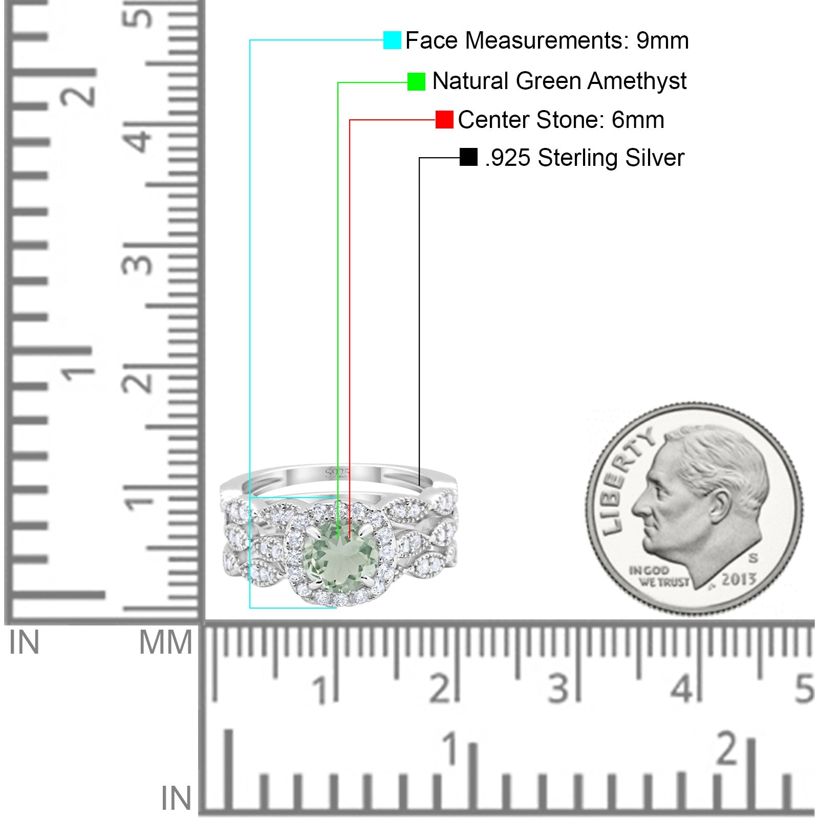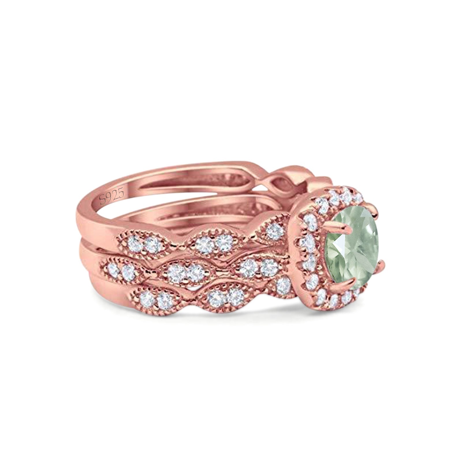 Three Piece Round Natural Green Amethyst Prasiolite Wedding Set Ring 925 Sterling Silver