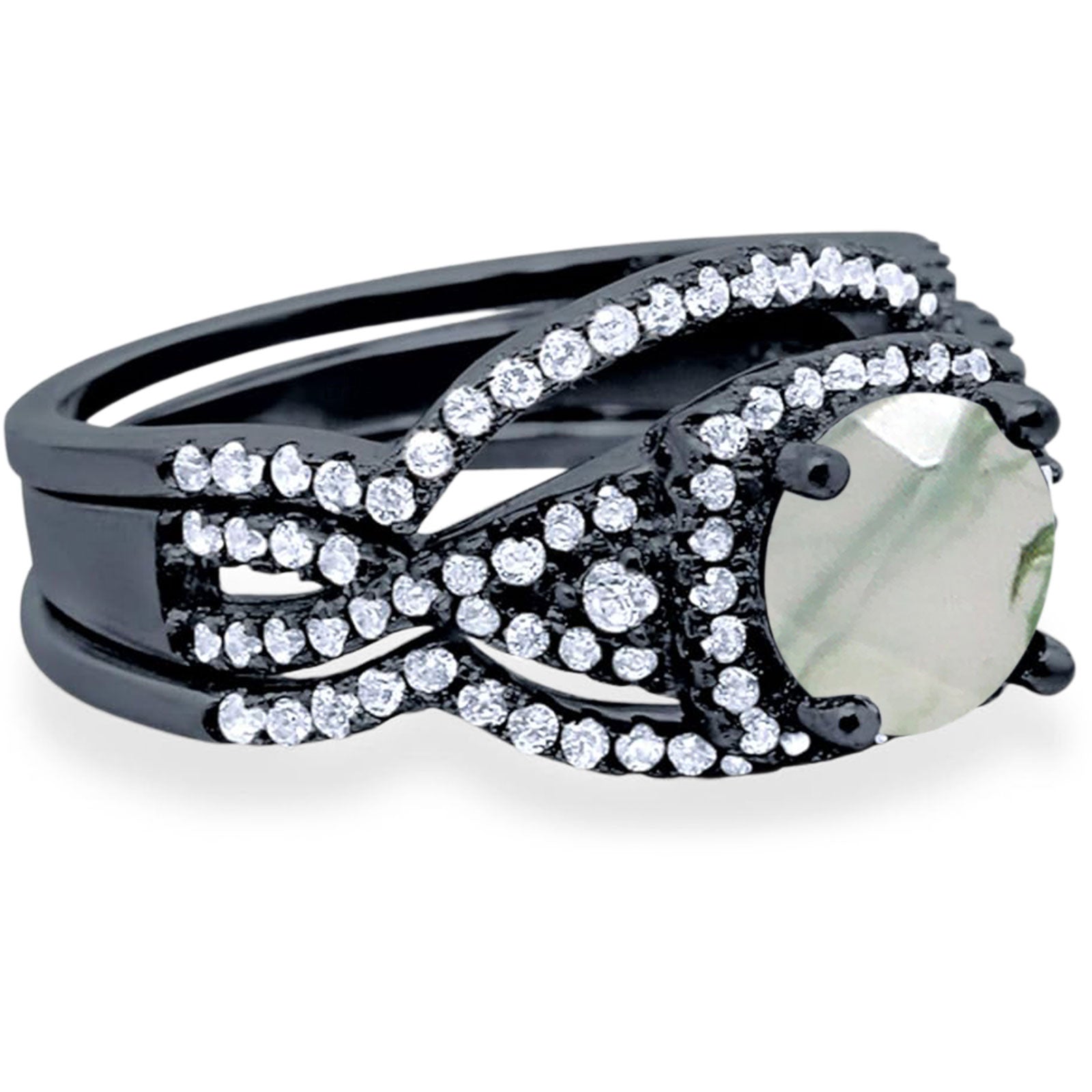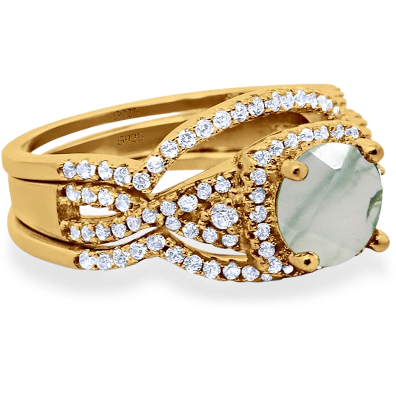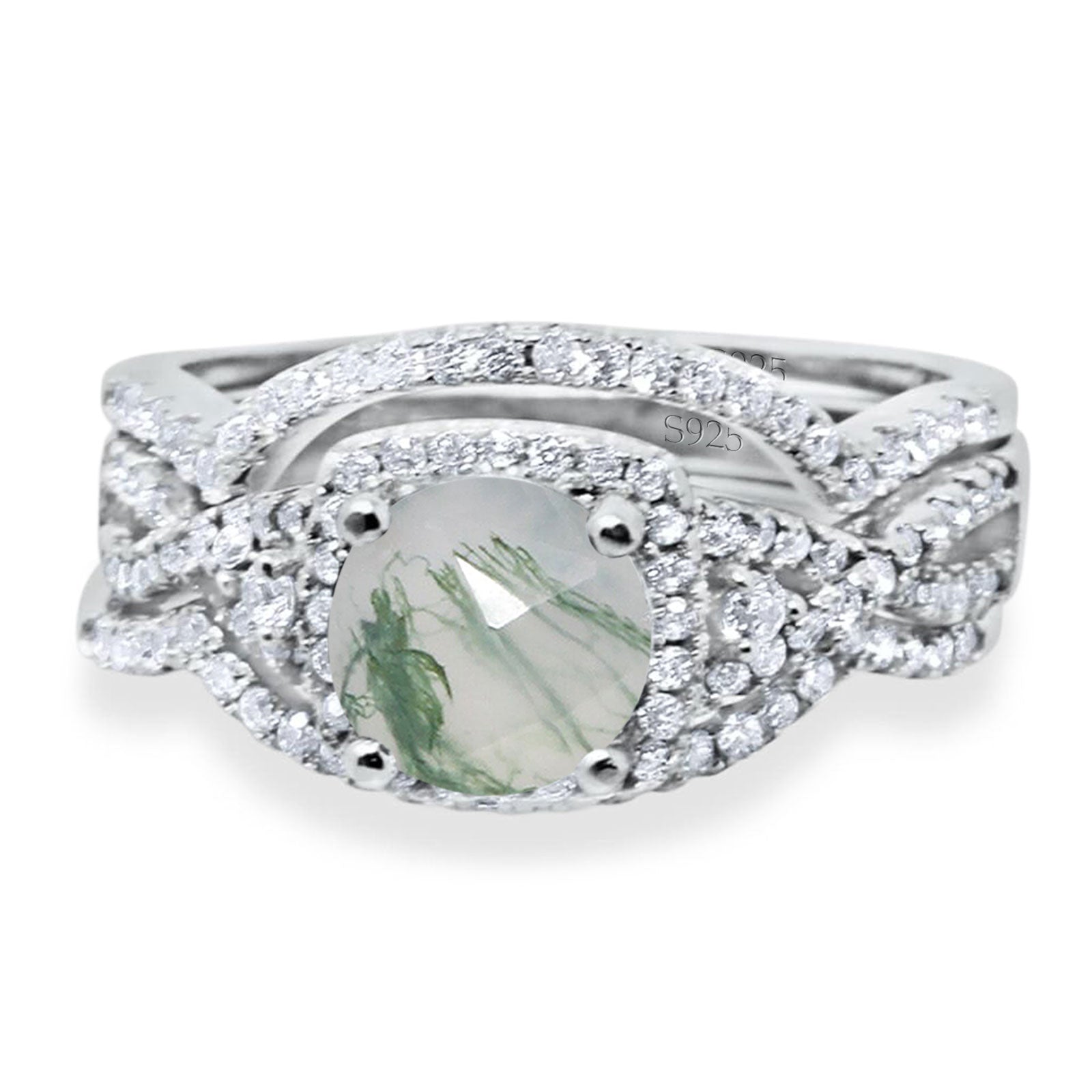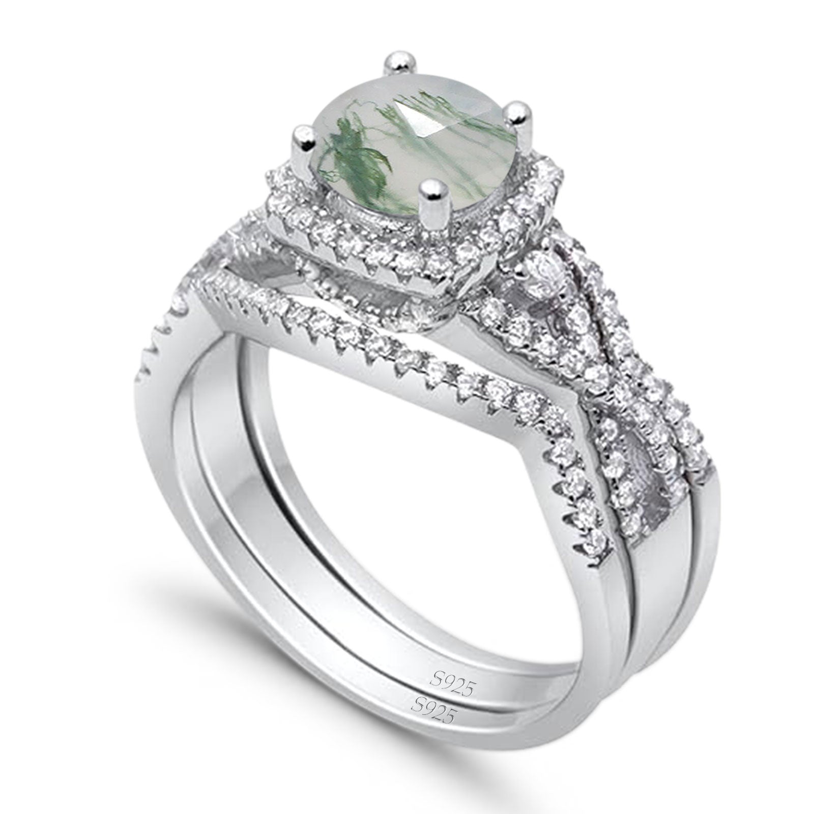 Three Piece Round Natural Green Moss Agate Infinity Shank Ring 925 Sterling Silver