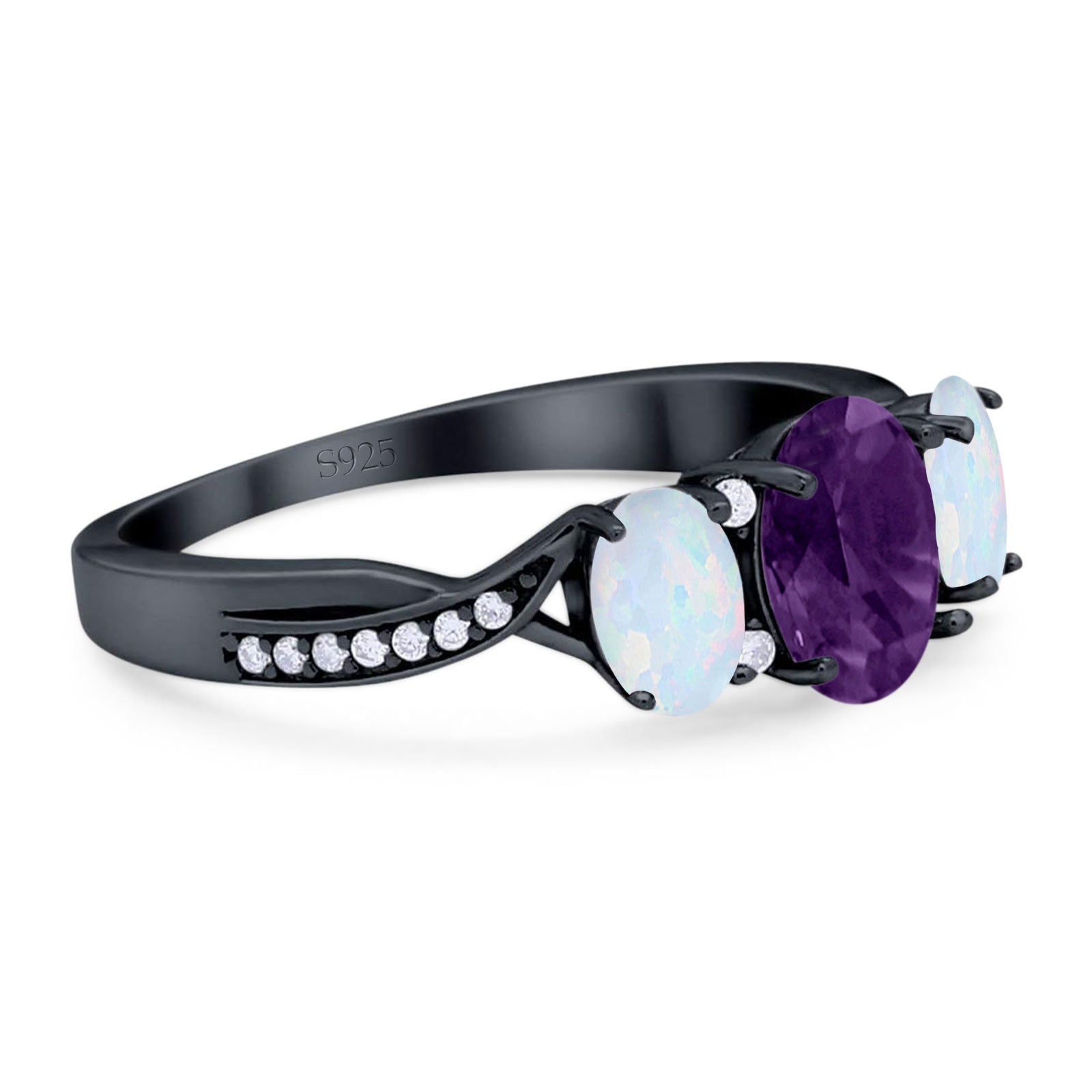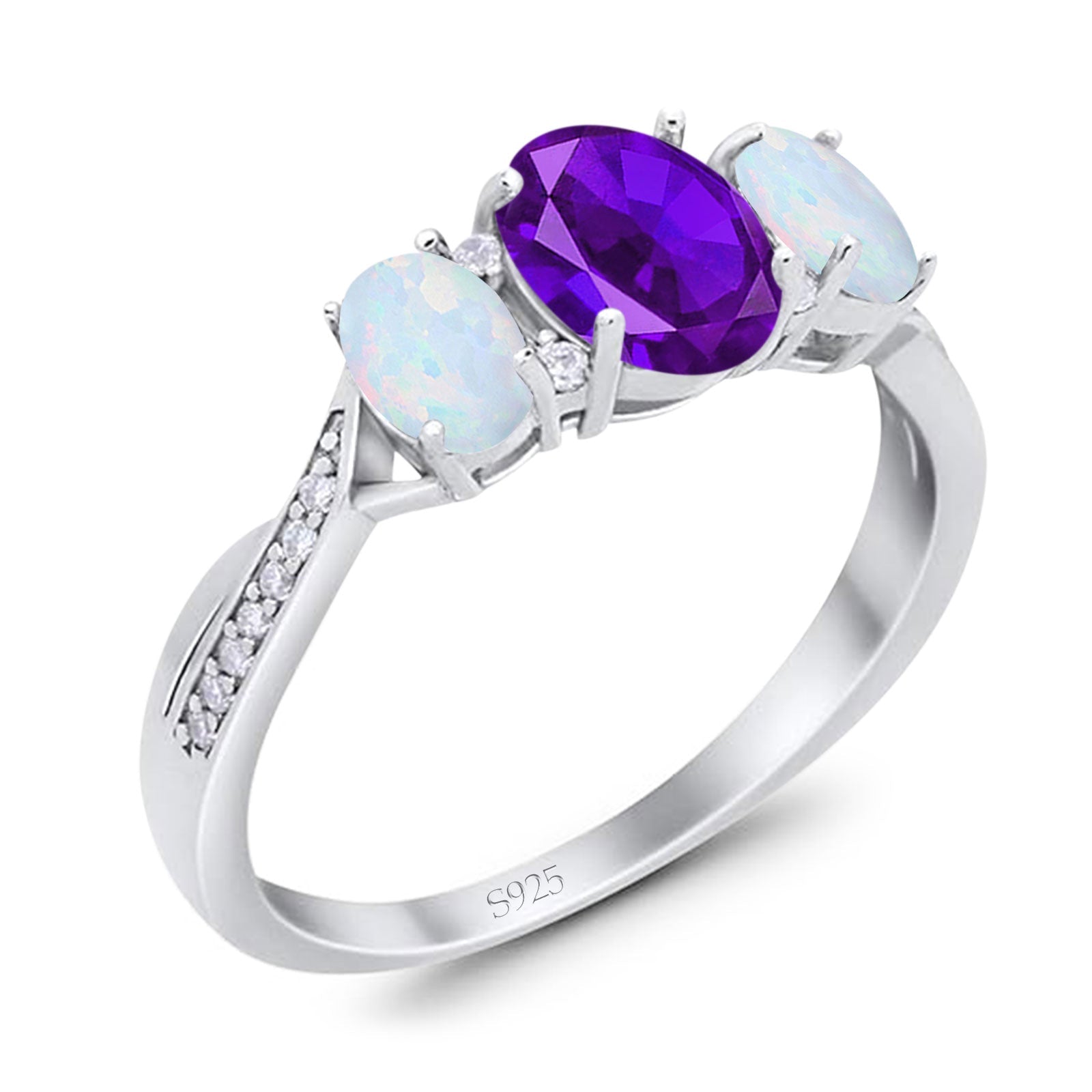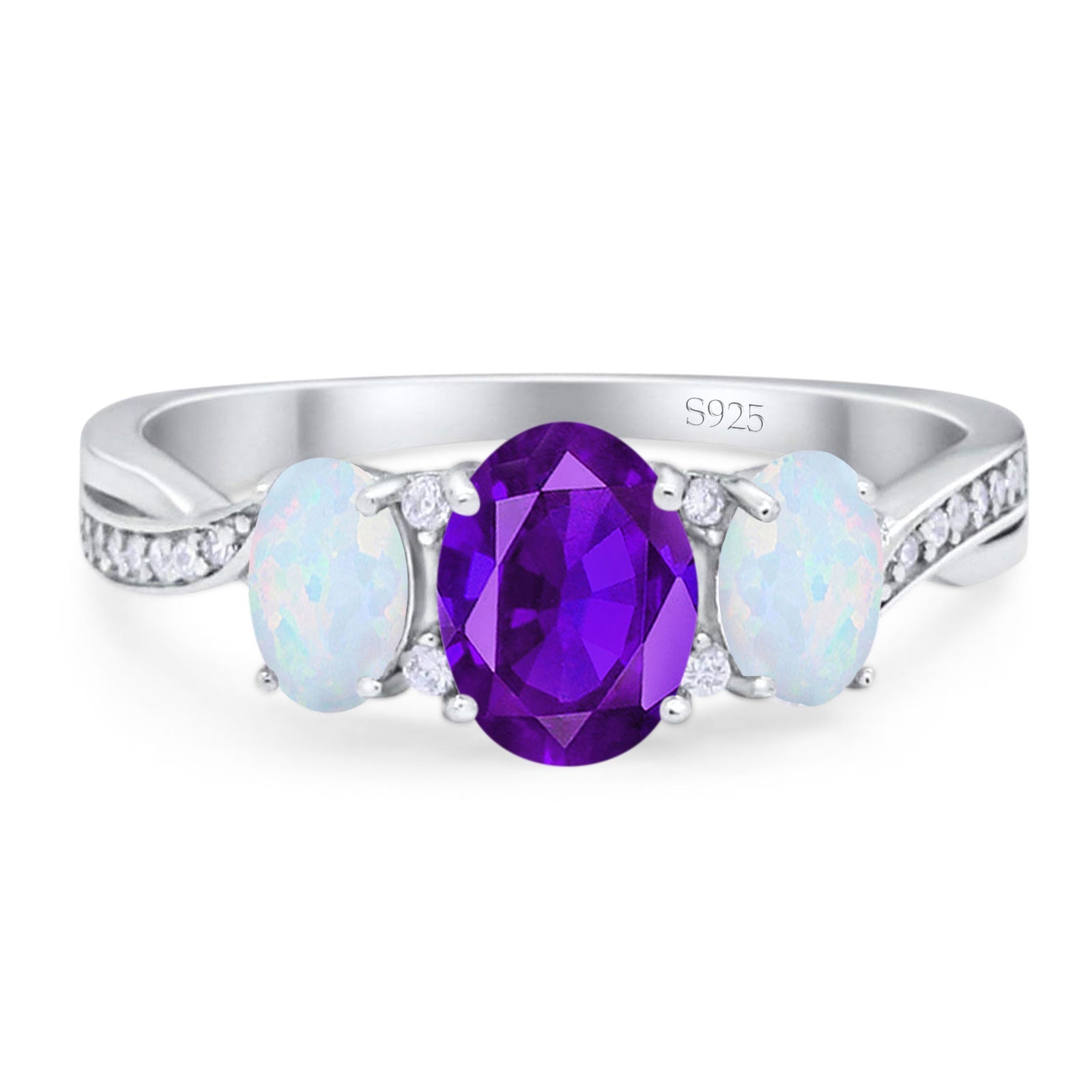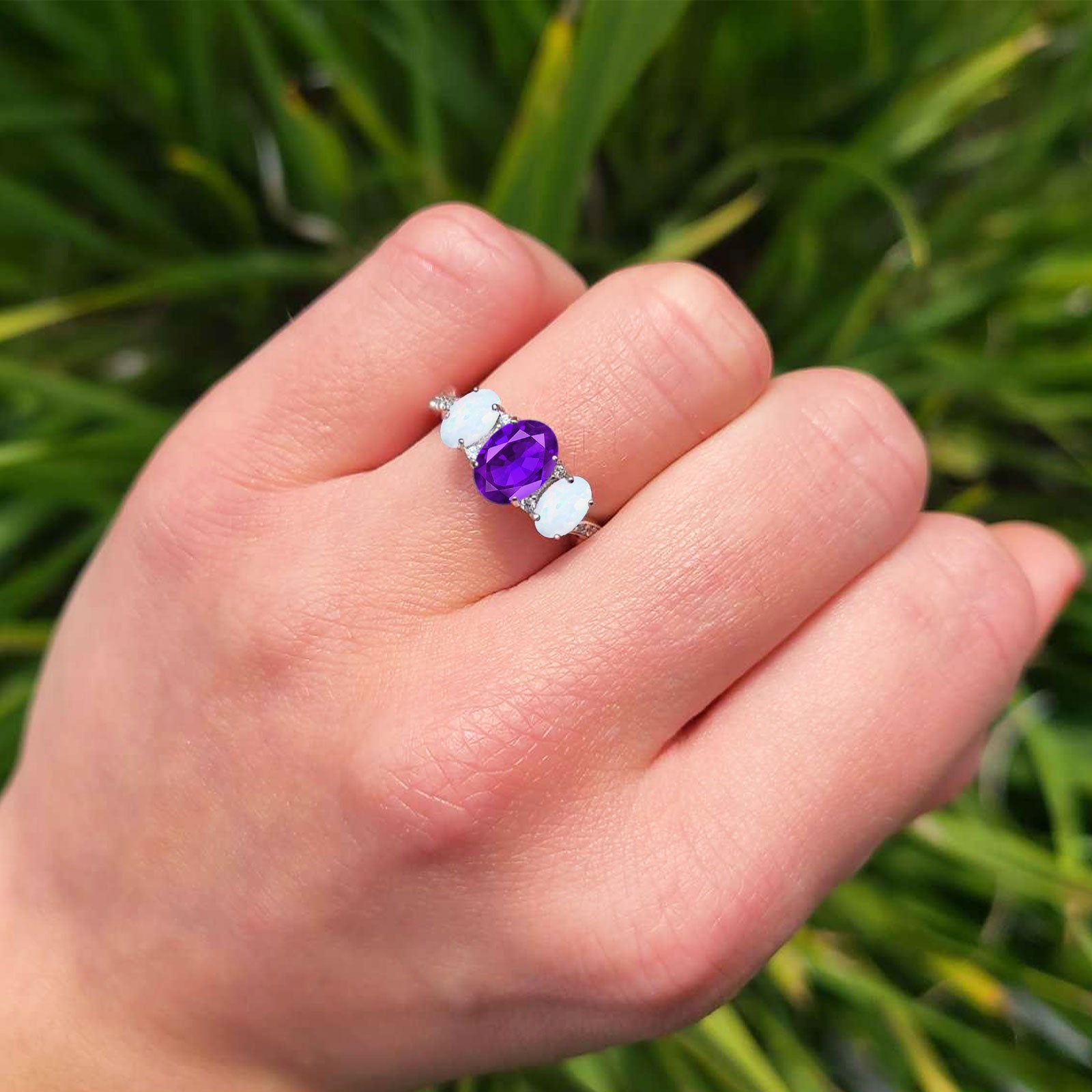 Three Stone Oval Natural Amethyst Art Deco Ring 925 Sterling Silver