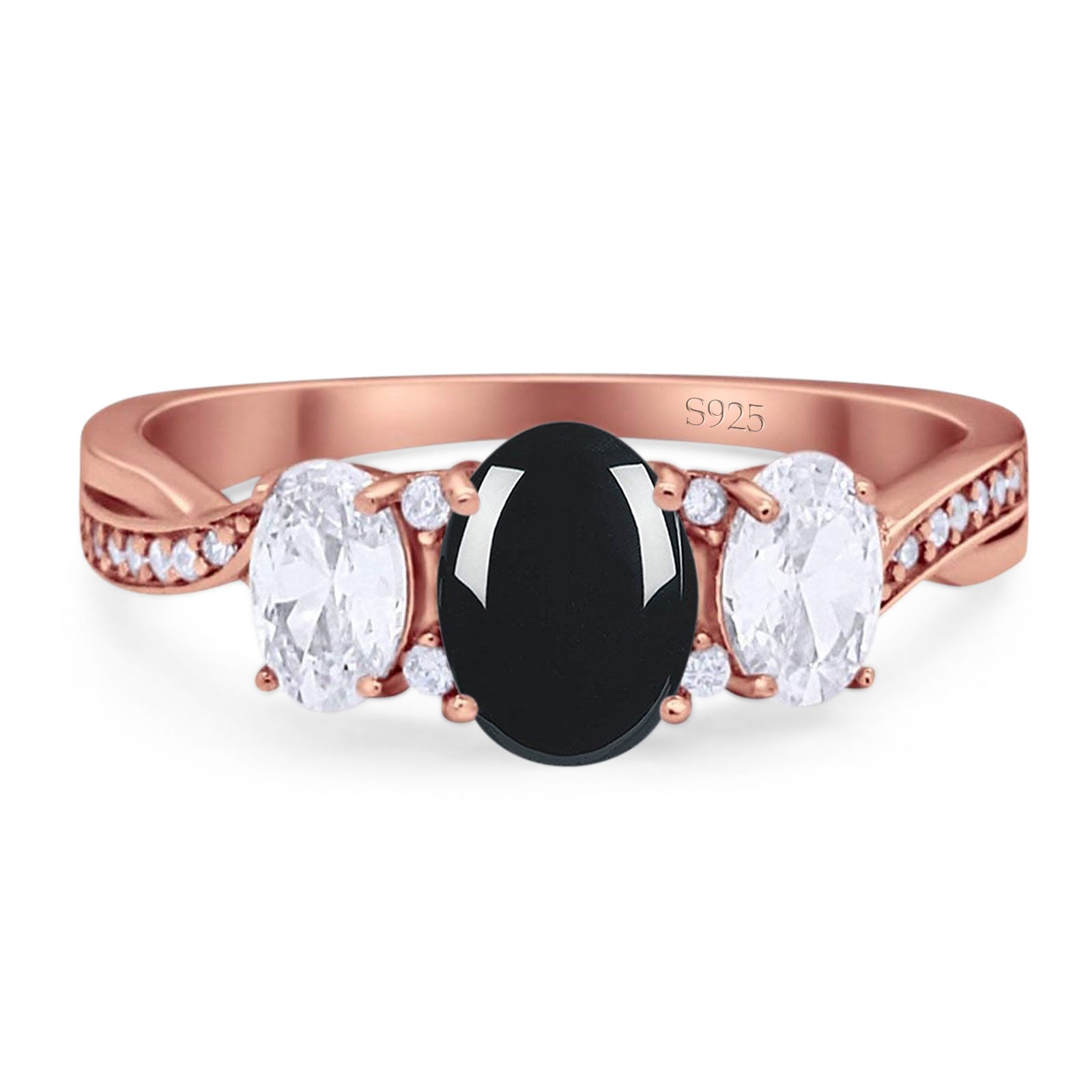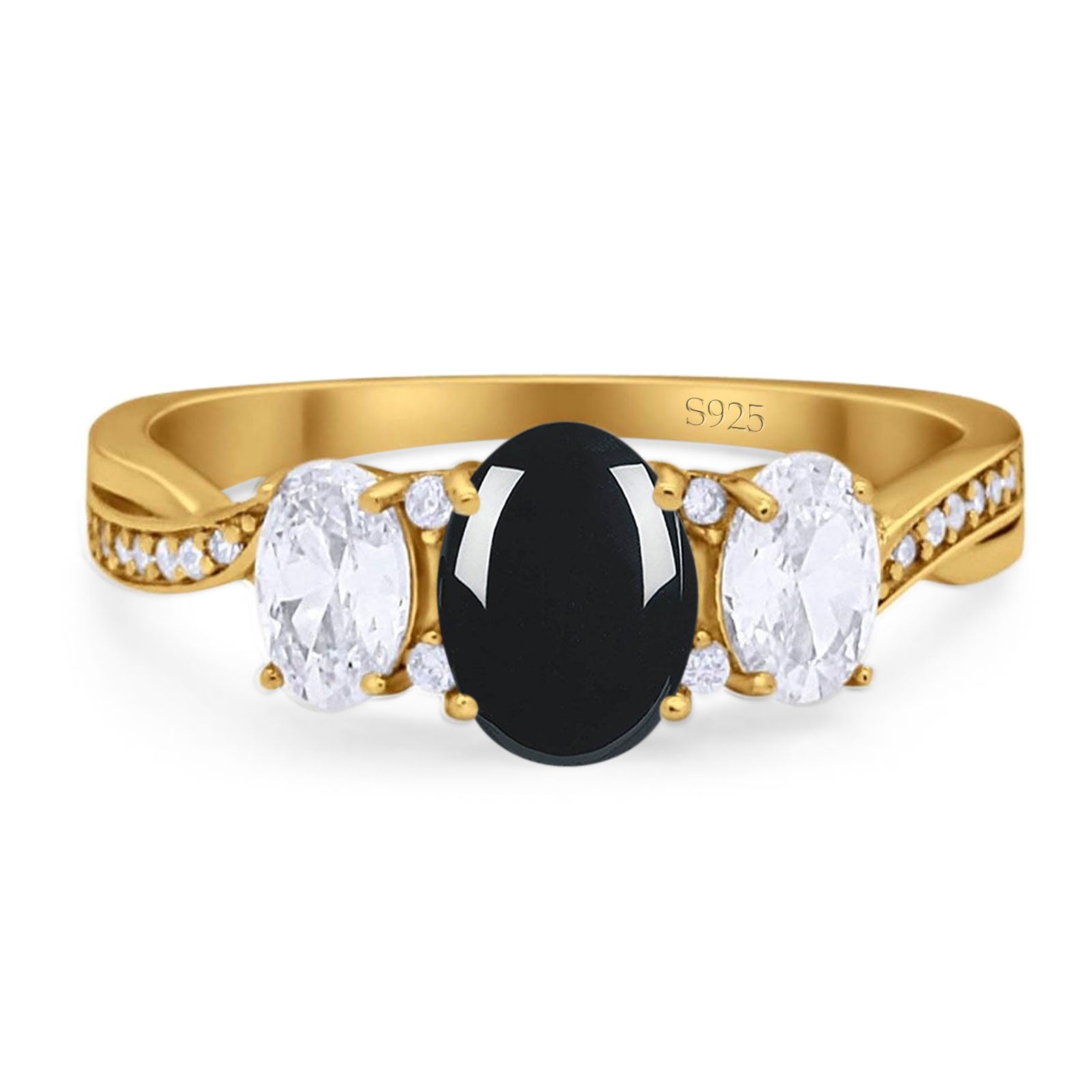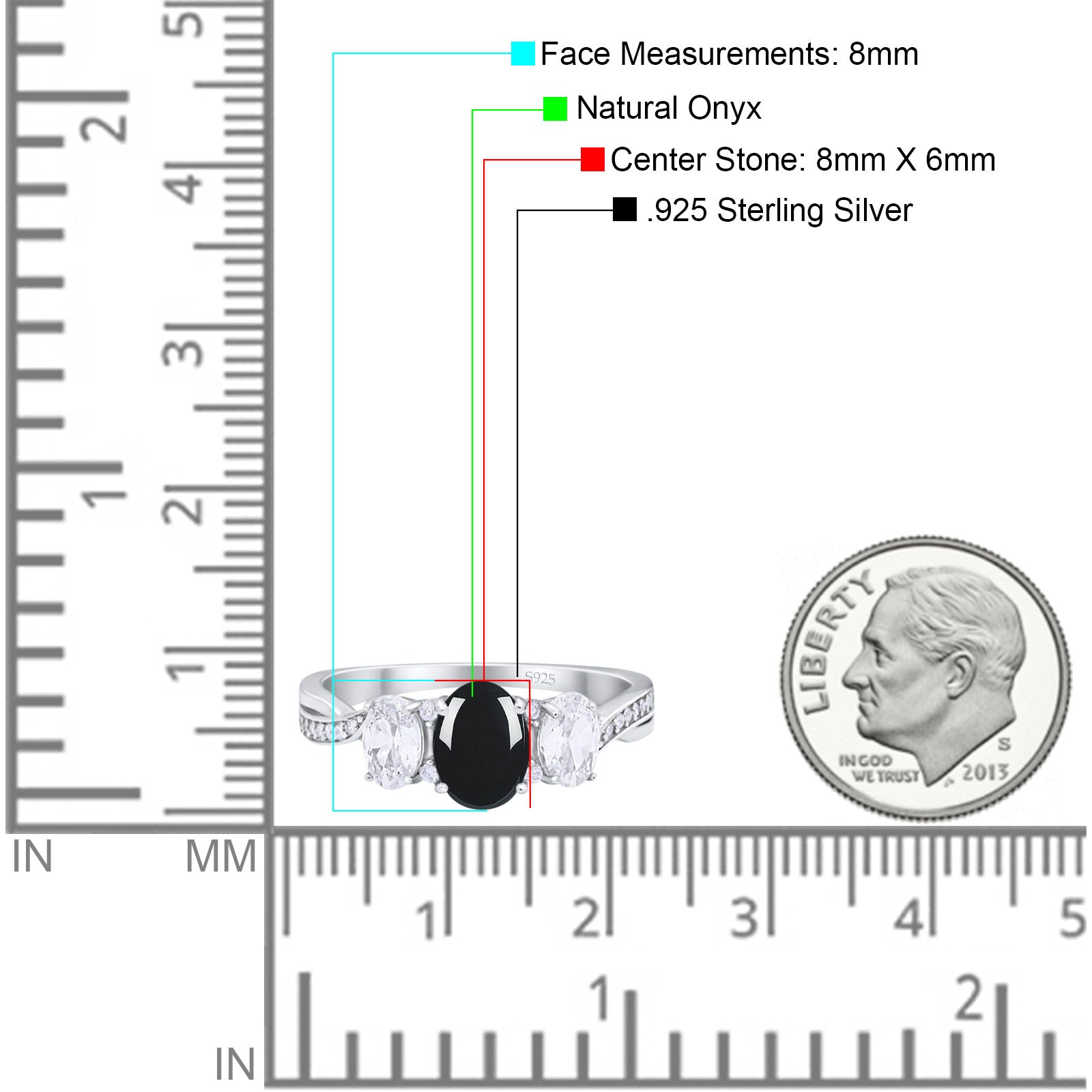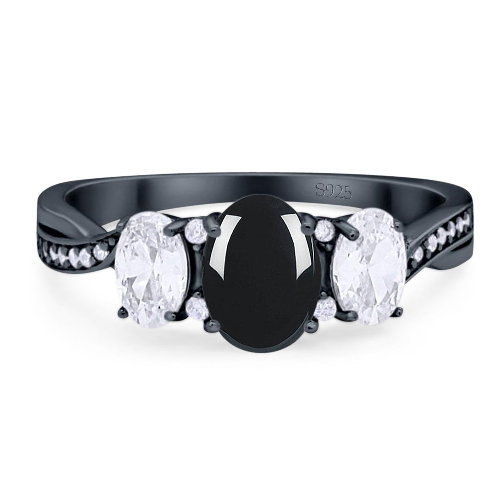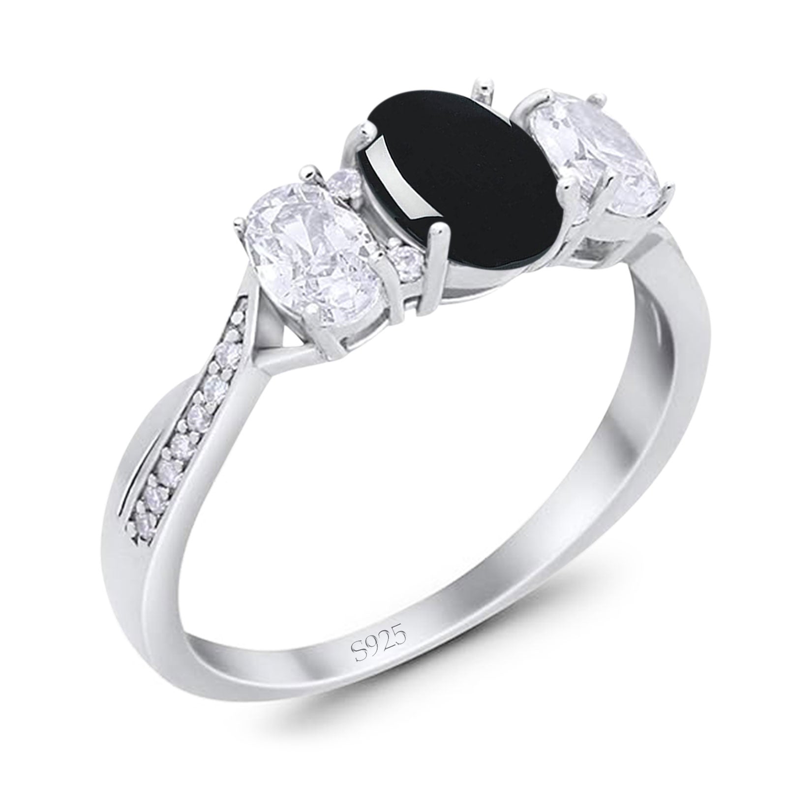 Three Stone Oval Natural Black Onyx Art Deco Ring 925 Sterling Silver