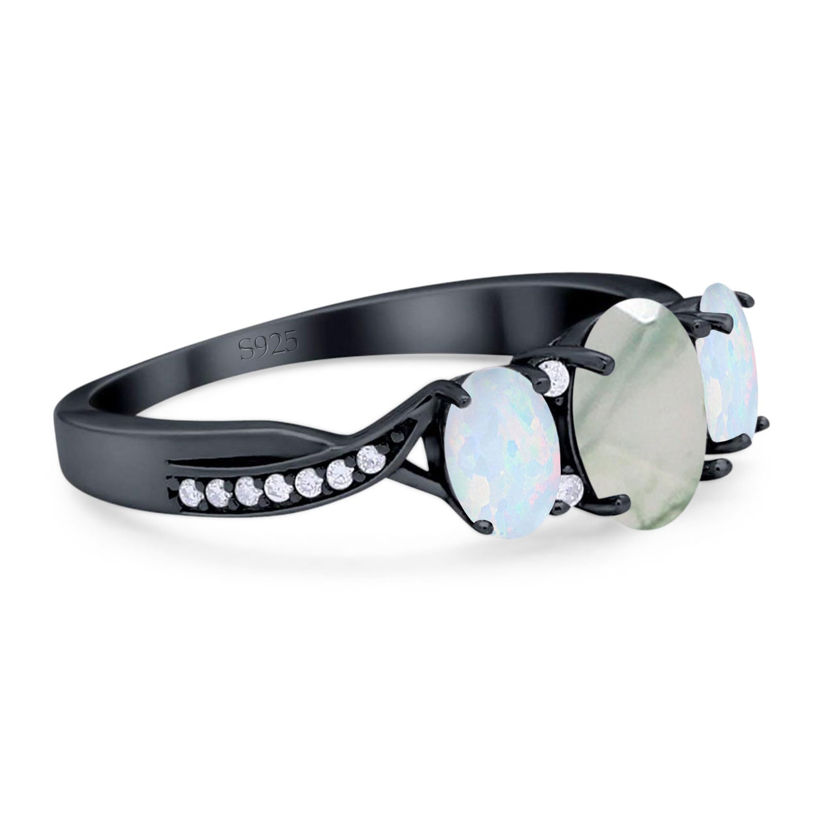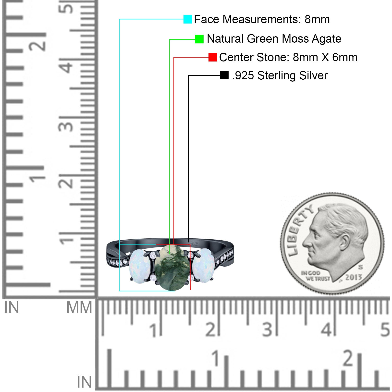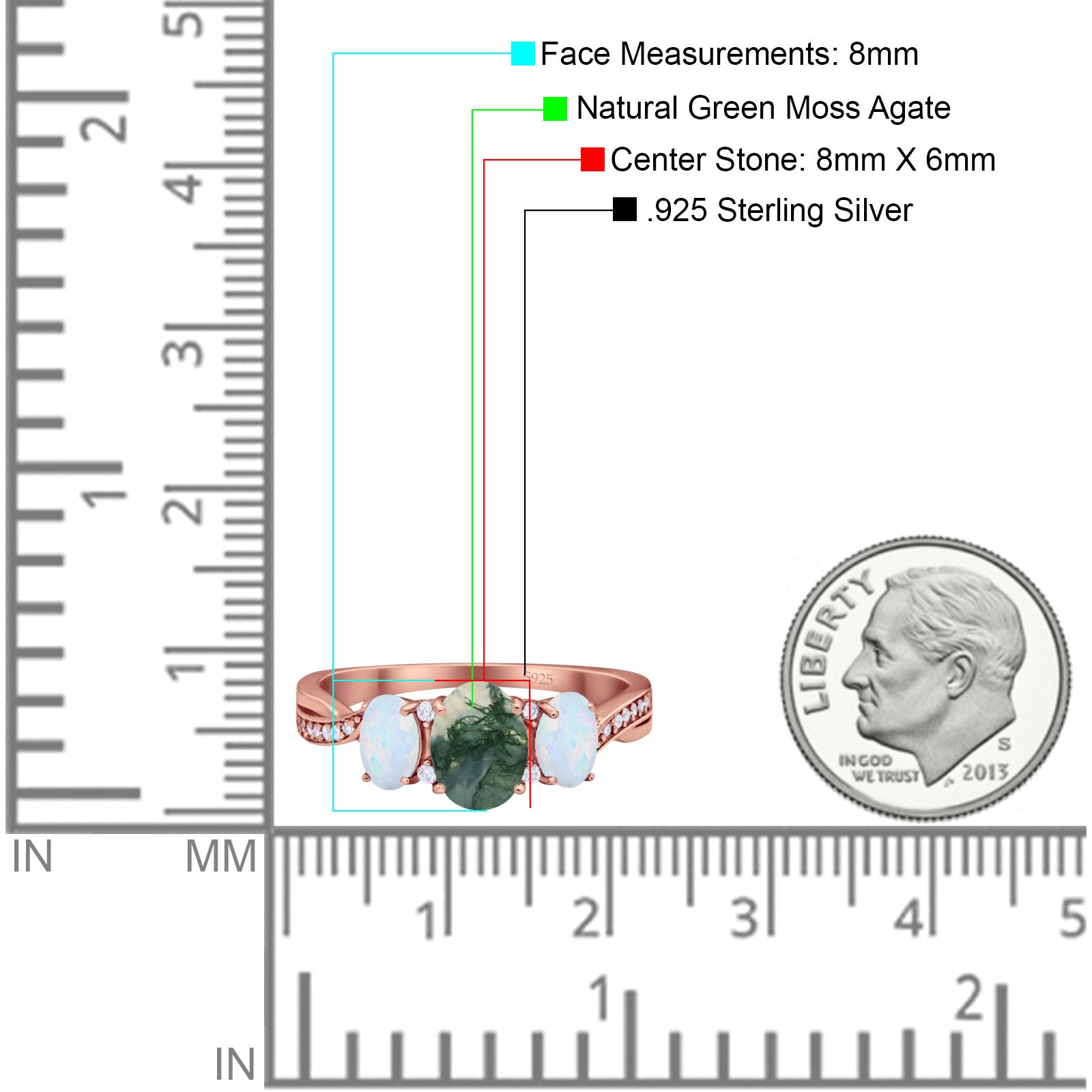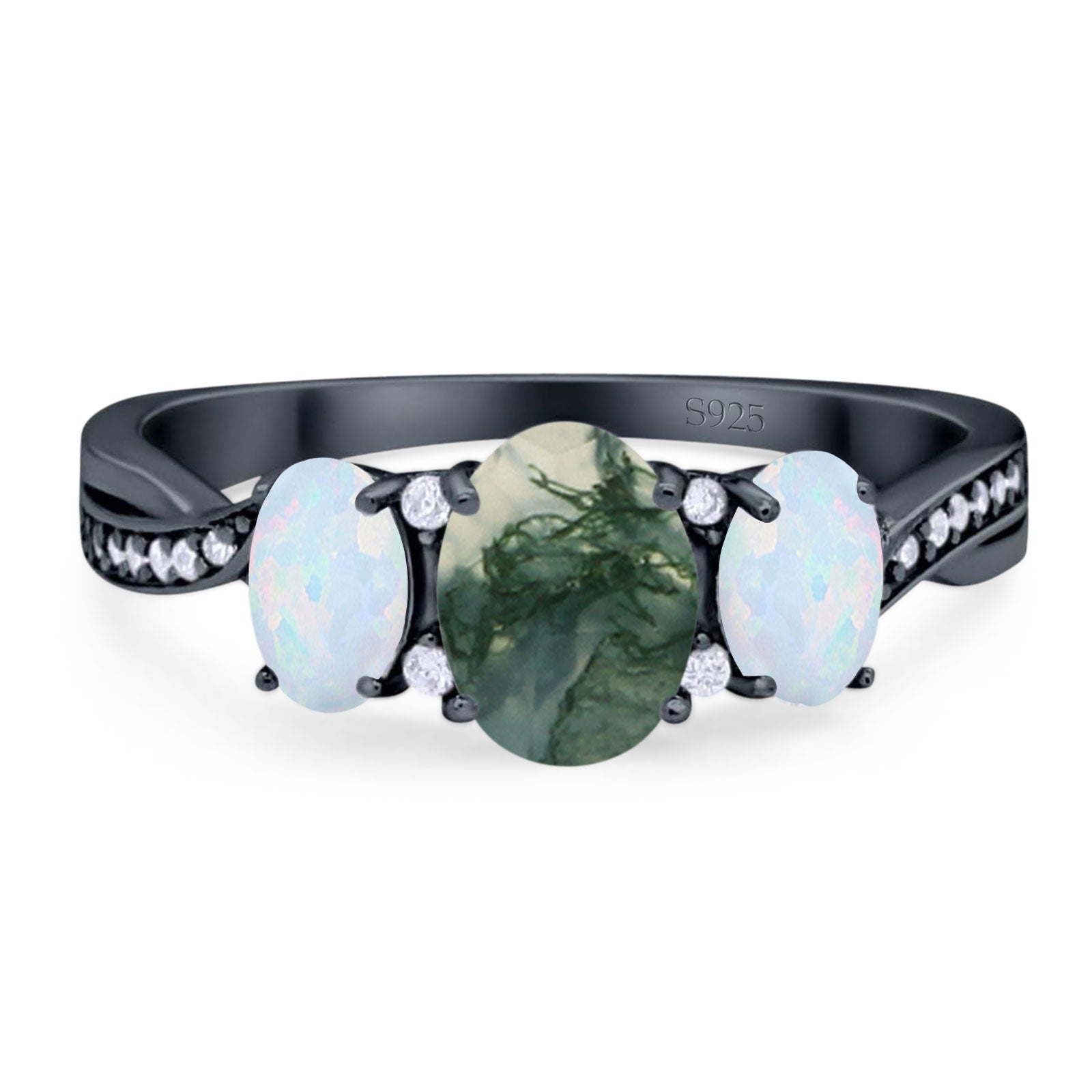 Three Stone Oval Natural Green Moss Agate Art Deco Ring 925 Sterling Silver