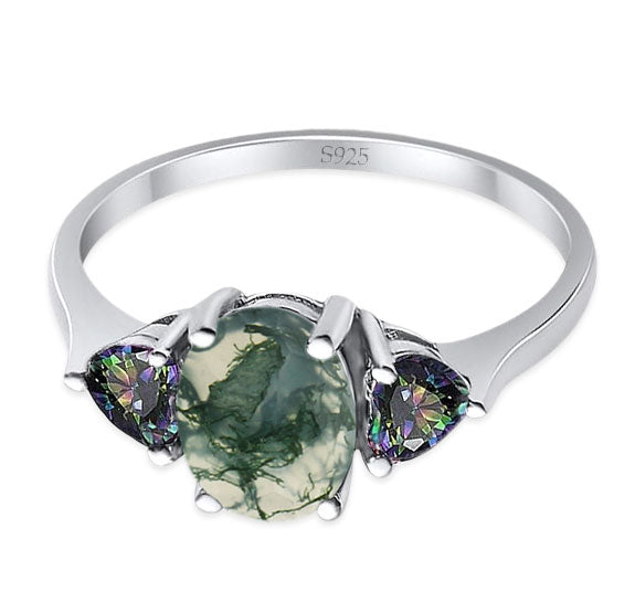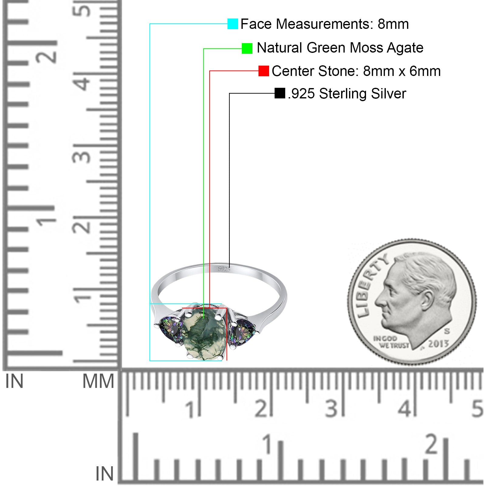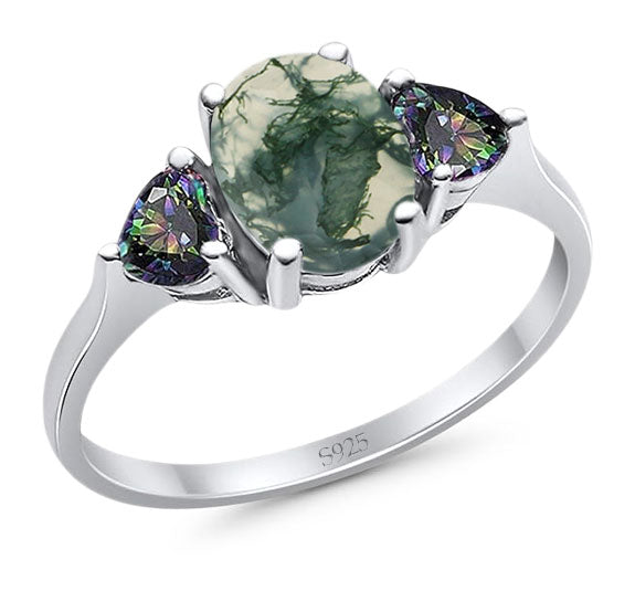 Three Stone Oval Natural Green Moss Agate Trellis Ring 925 Sterling Silver