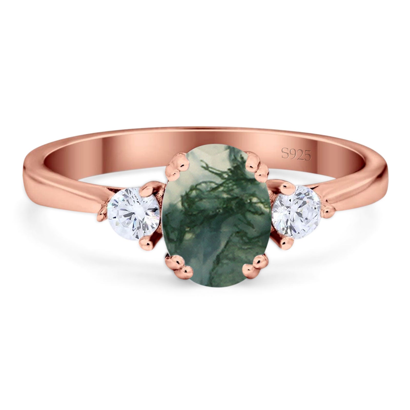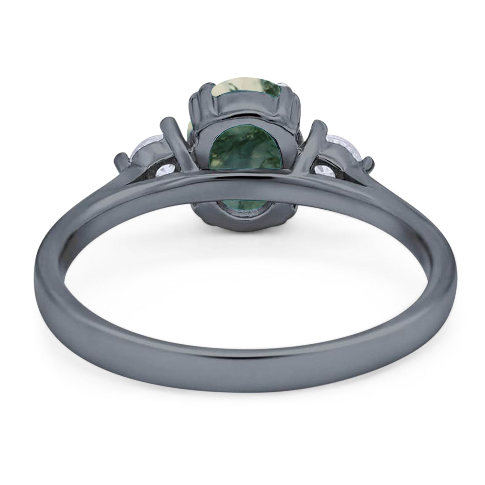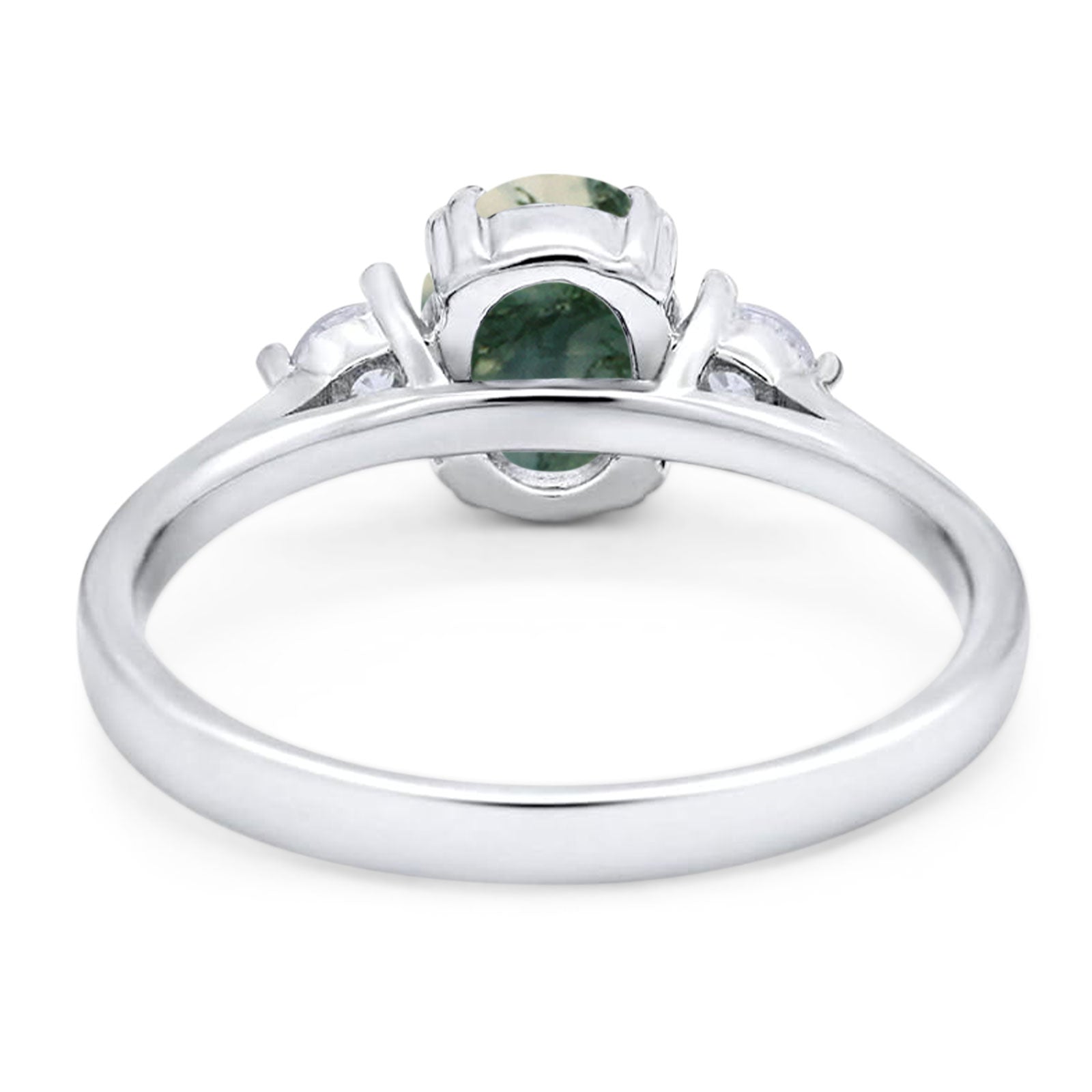 Three Stone Oval Natural Green Moss Agate Wedding Ring 925 Sterling Silver