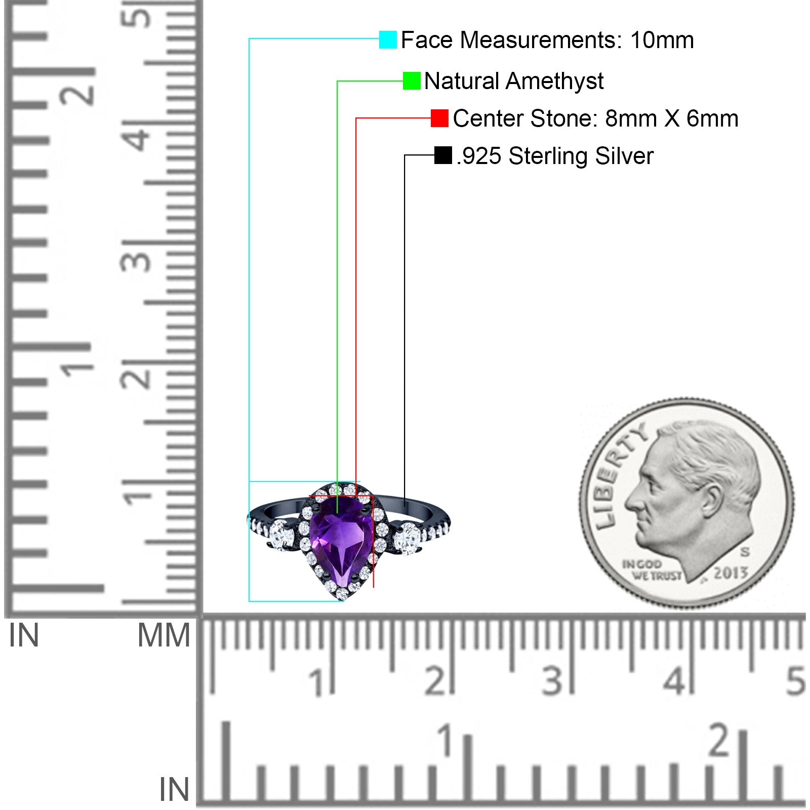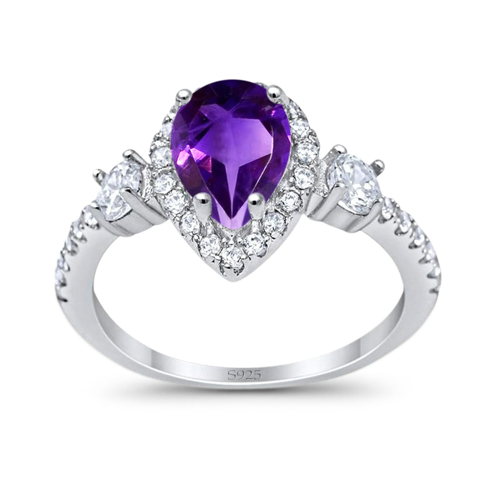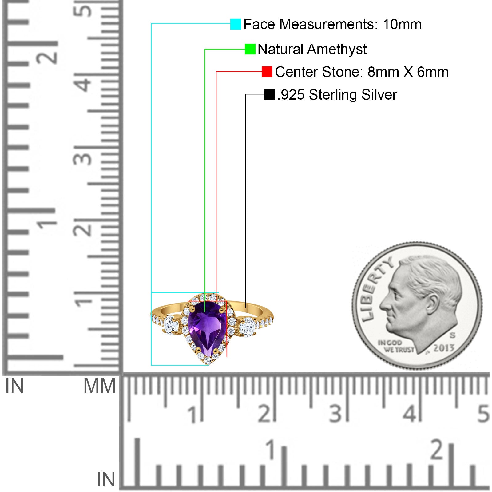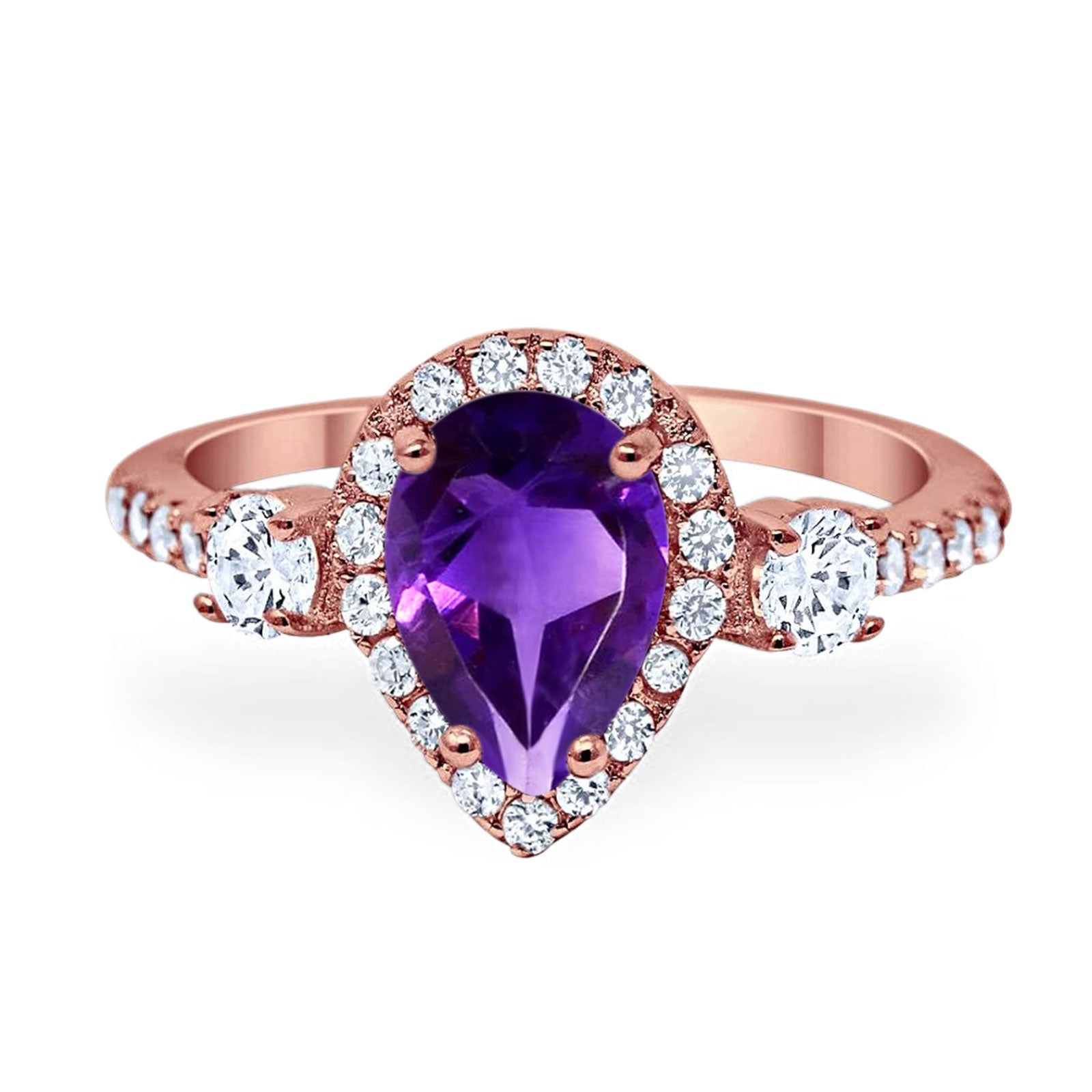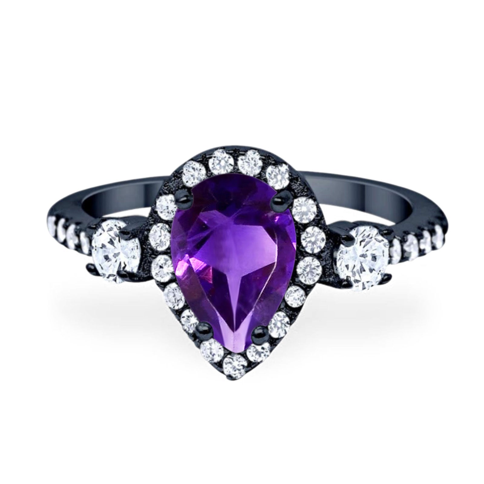 Three Stone Pear Teardrop Natural Amethyst Halo Ring 925 Sterling Silver