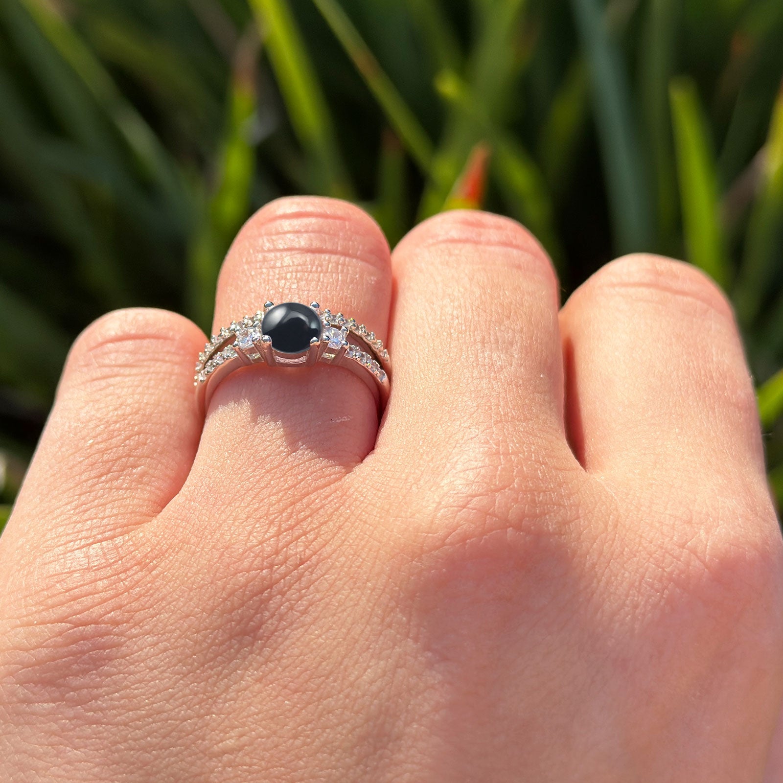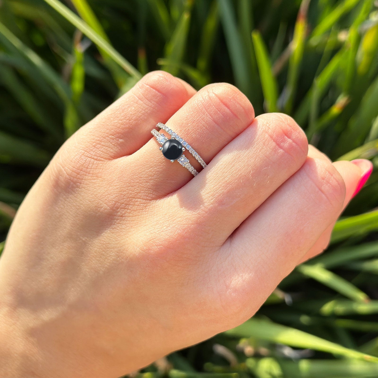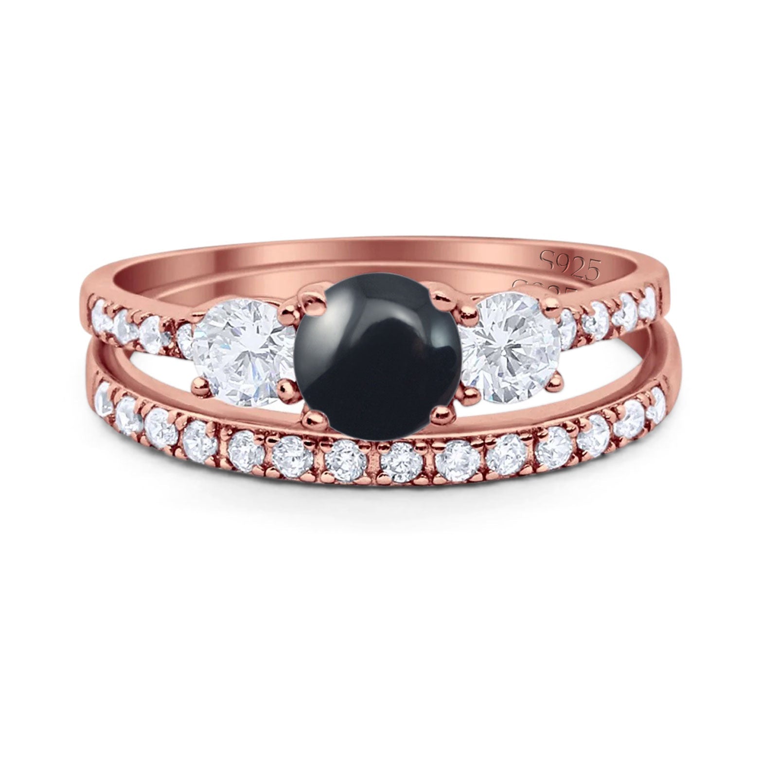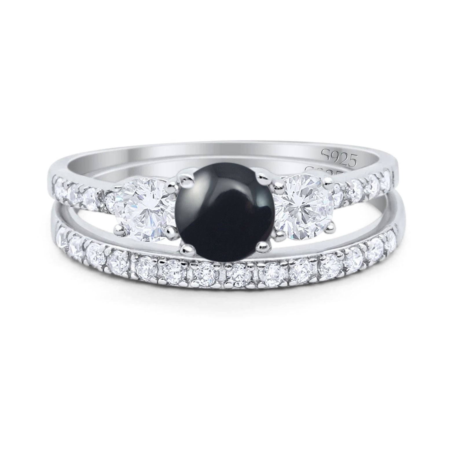Three Stone Ring Round Natural Black Onyx Two-Piece Bridal 925 Sterling Silver