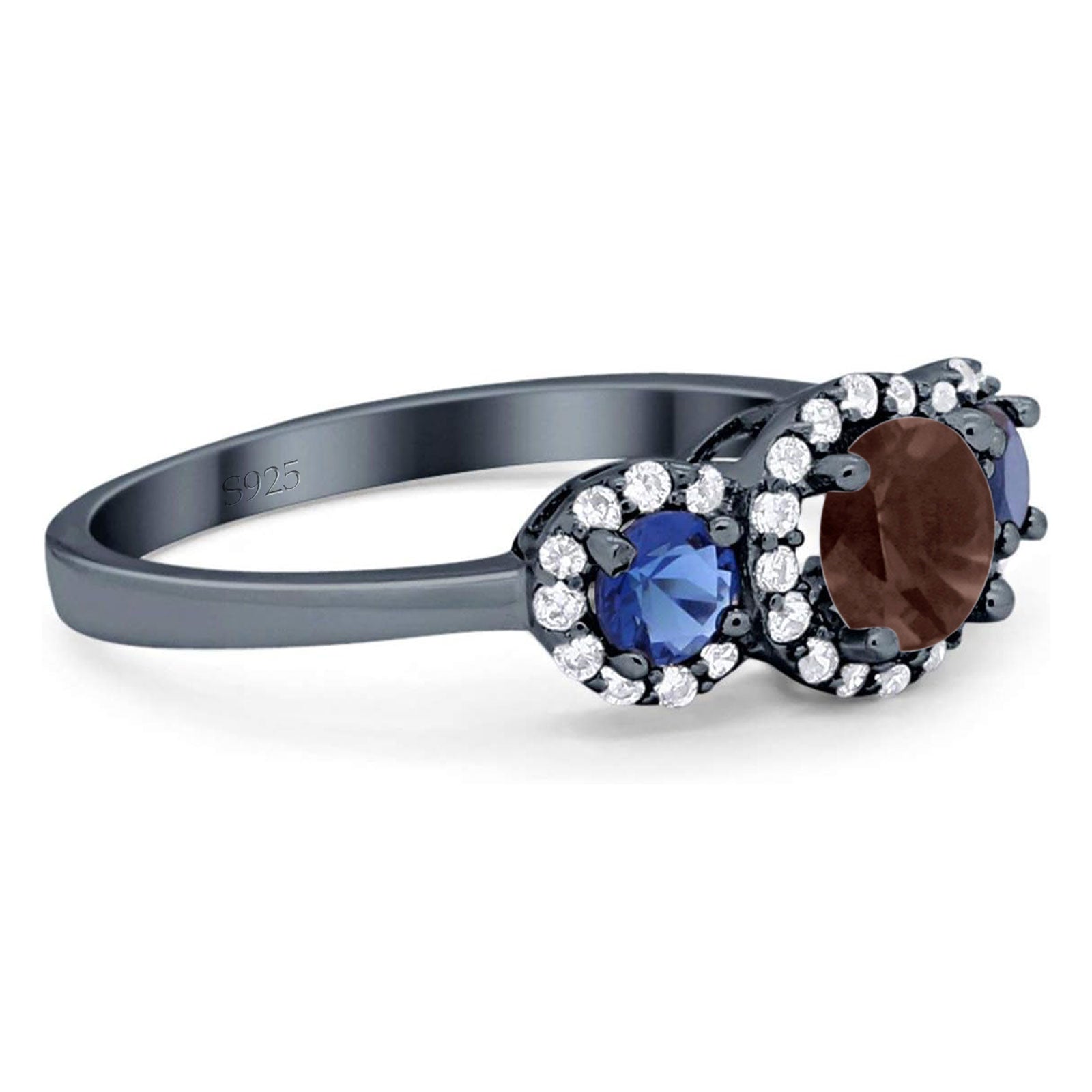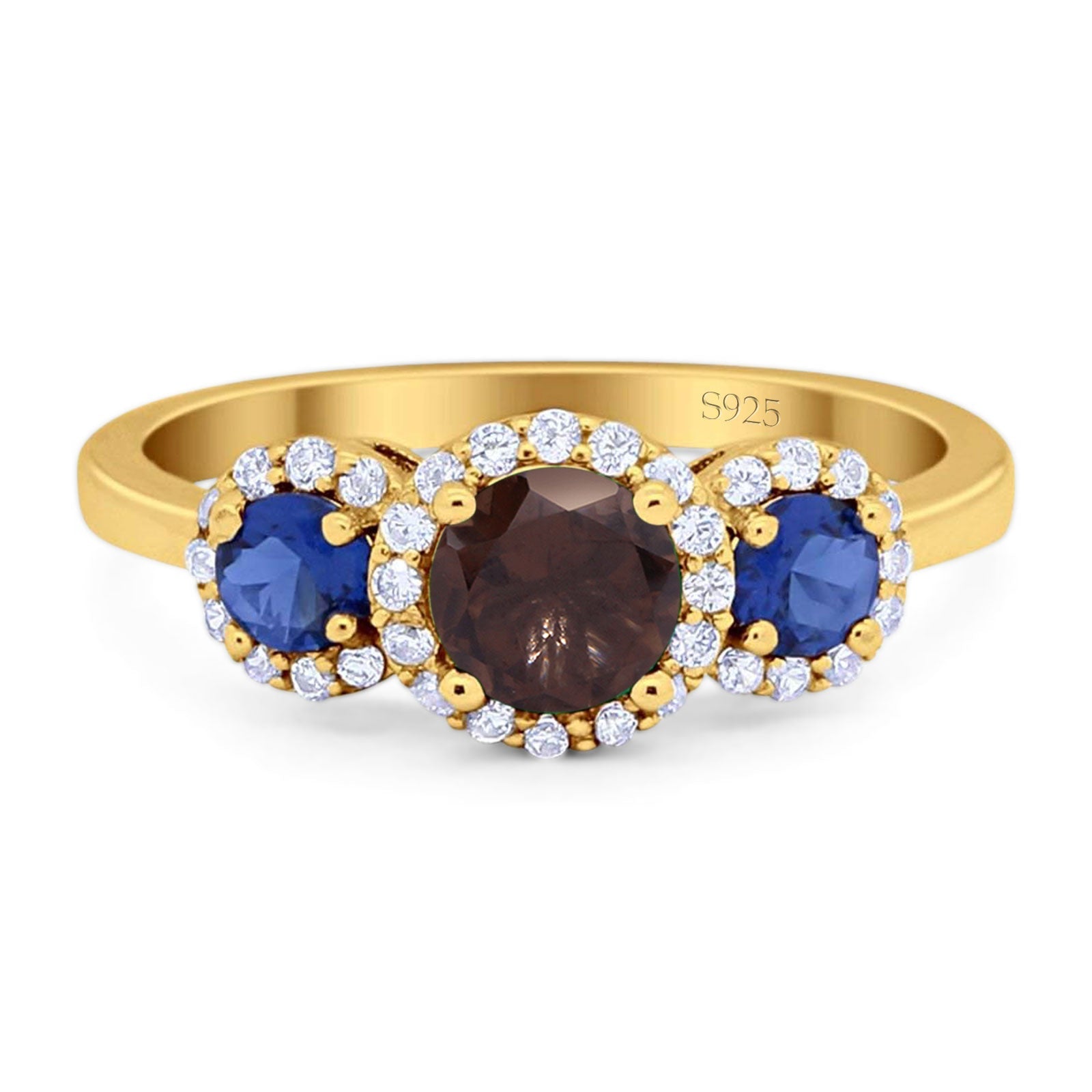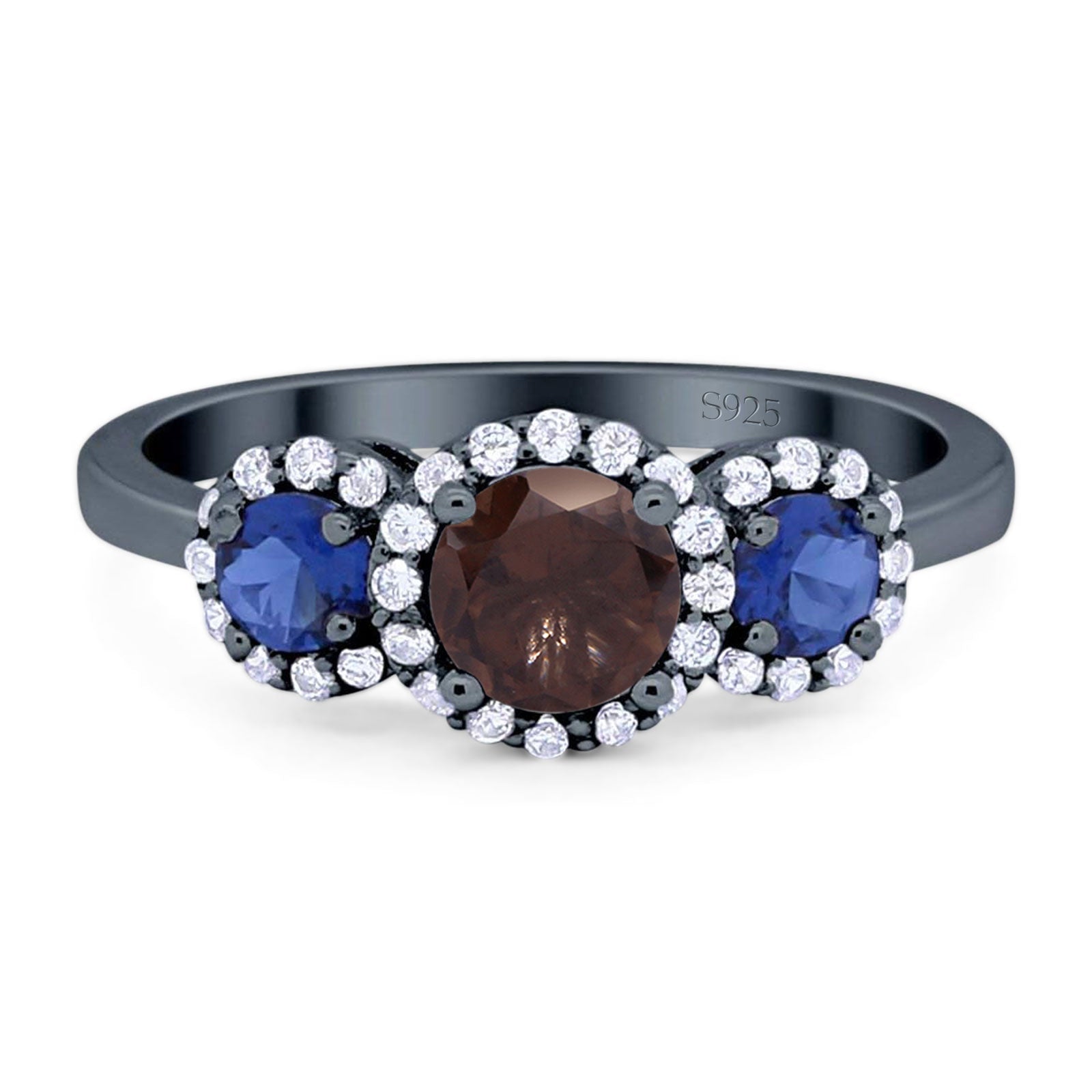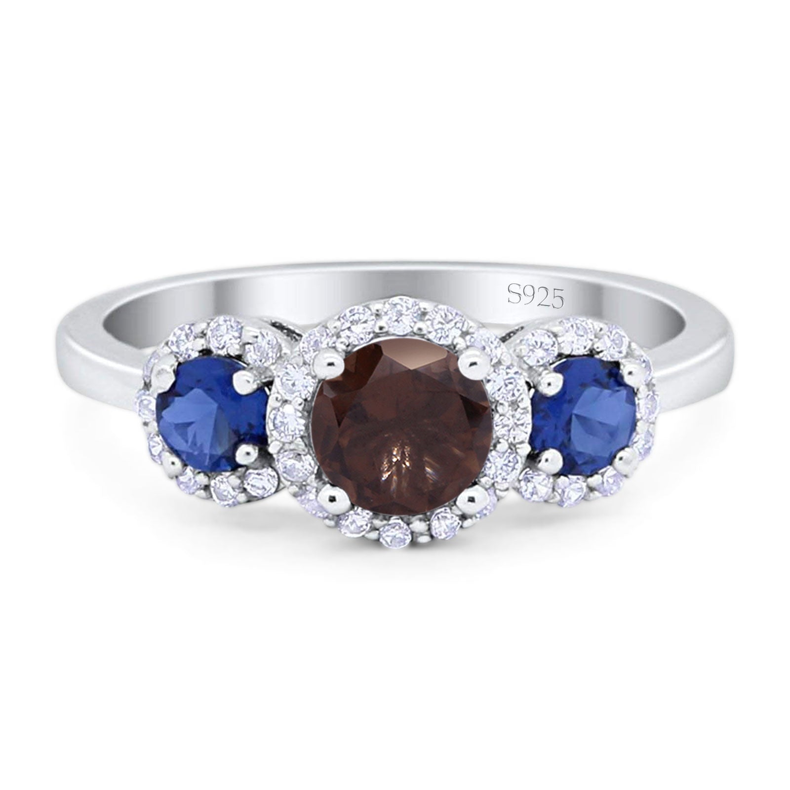 Three Stone Round Natural Chocolate Smoky Quartz Art Deco Ring 925 Sterling Silver