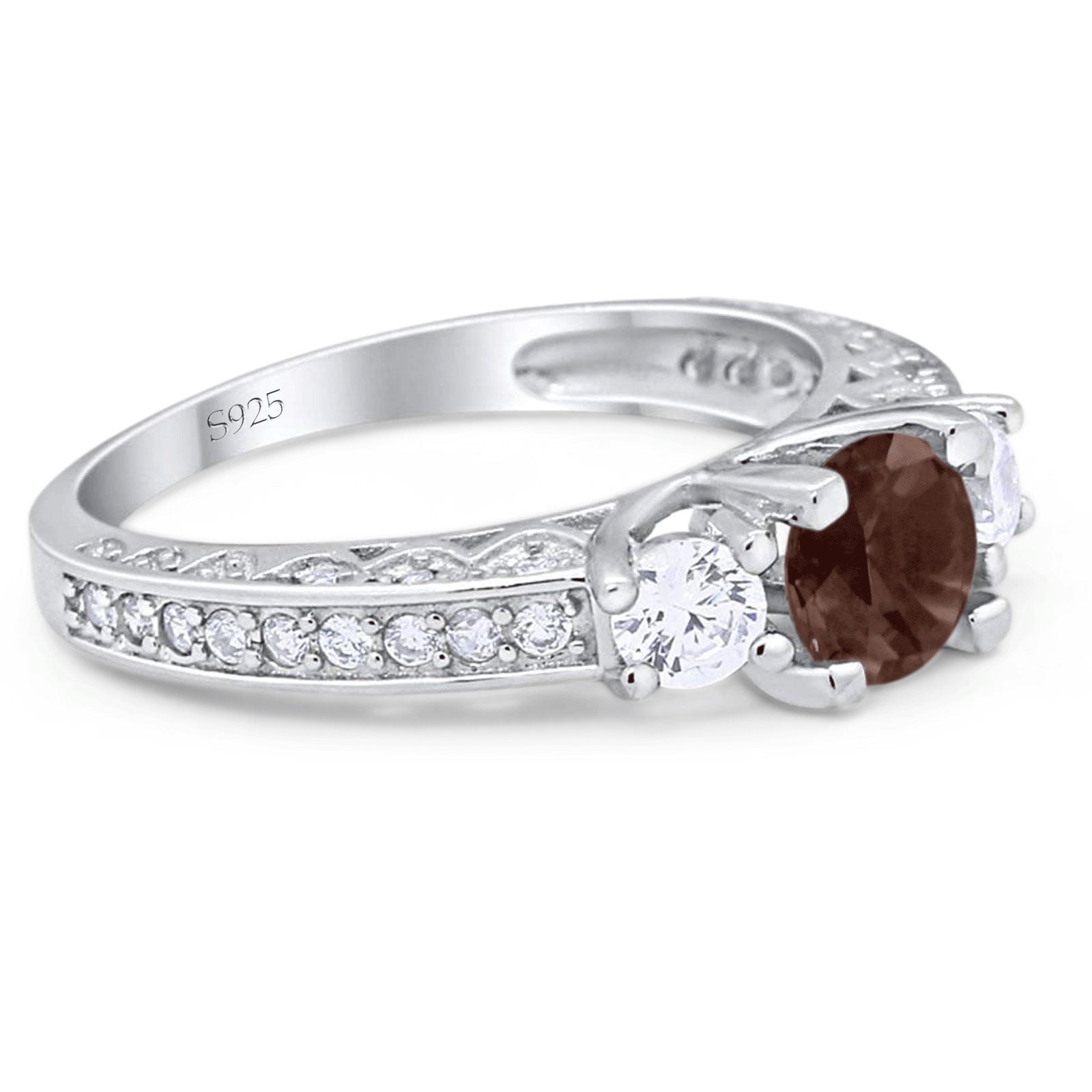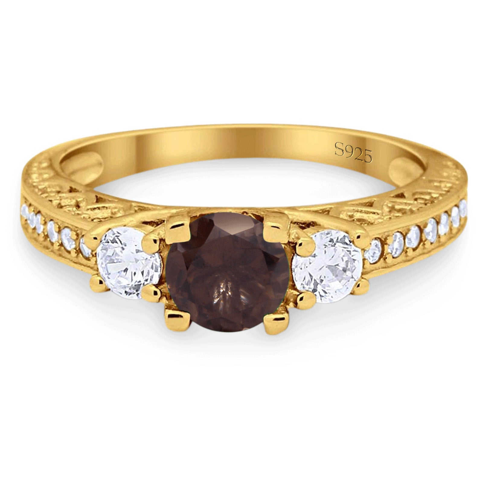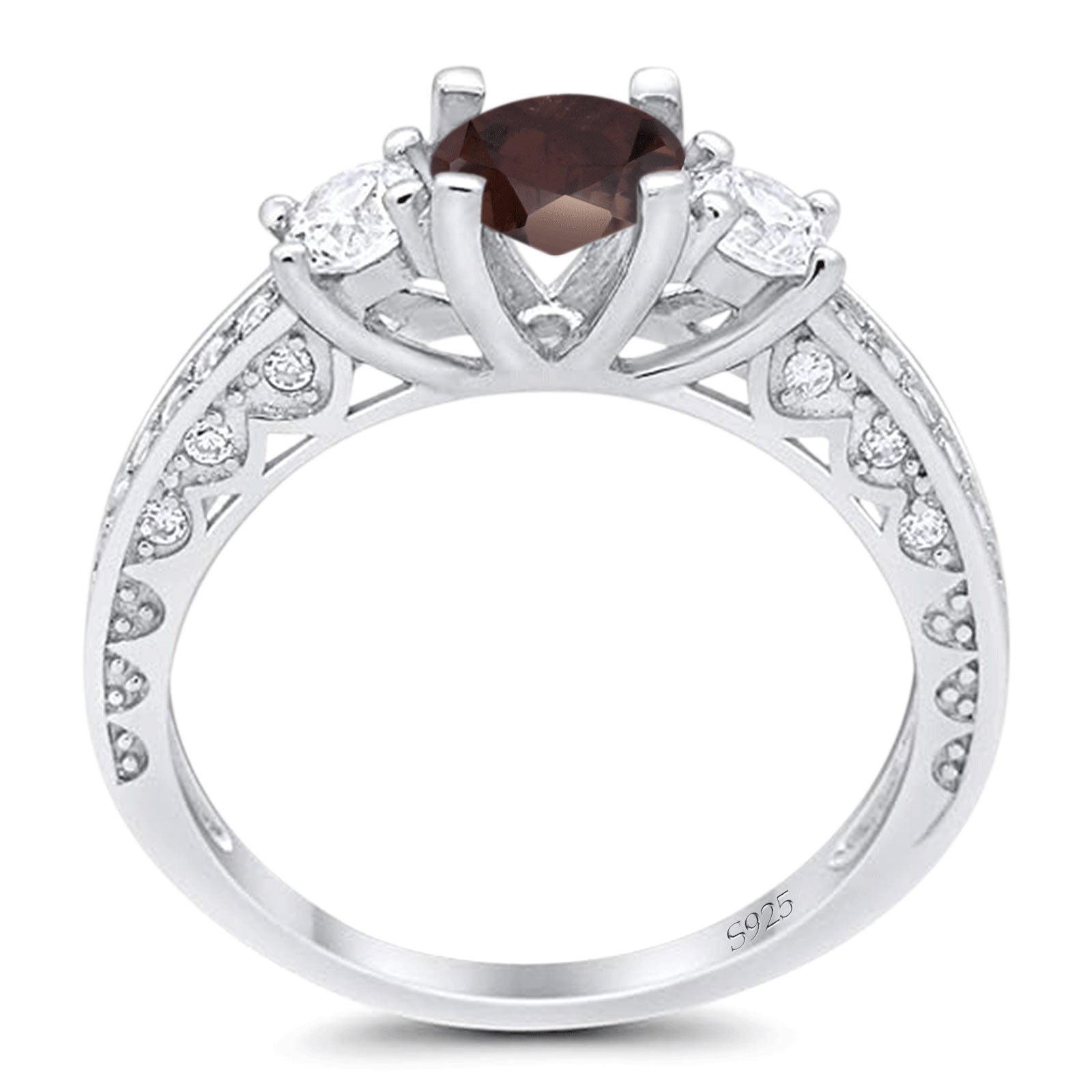 Three Stone Round Natural Chocolate Smoky Quartz Wedding Ring 925 Sterling Silver