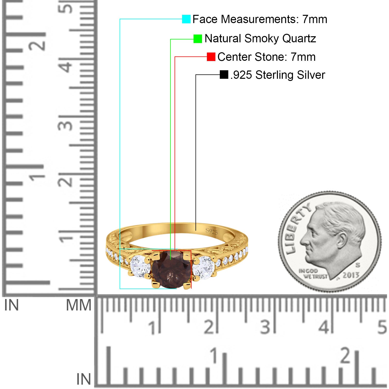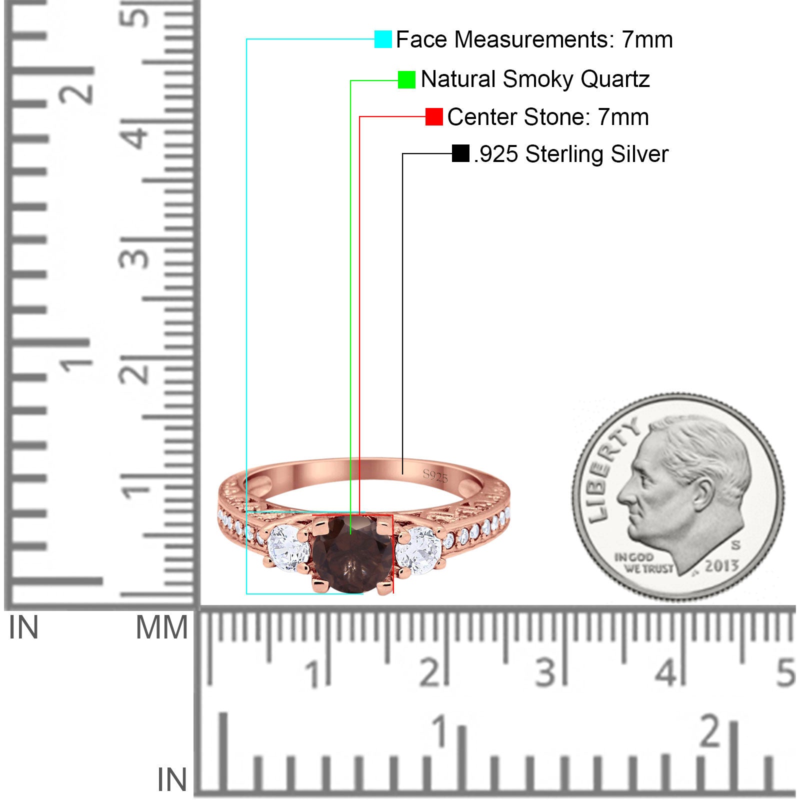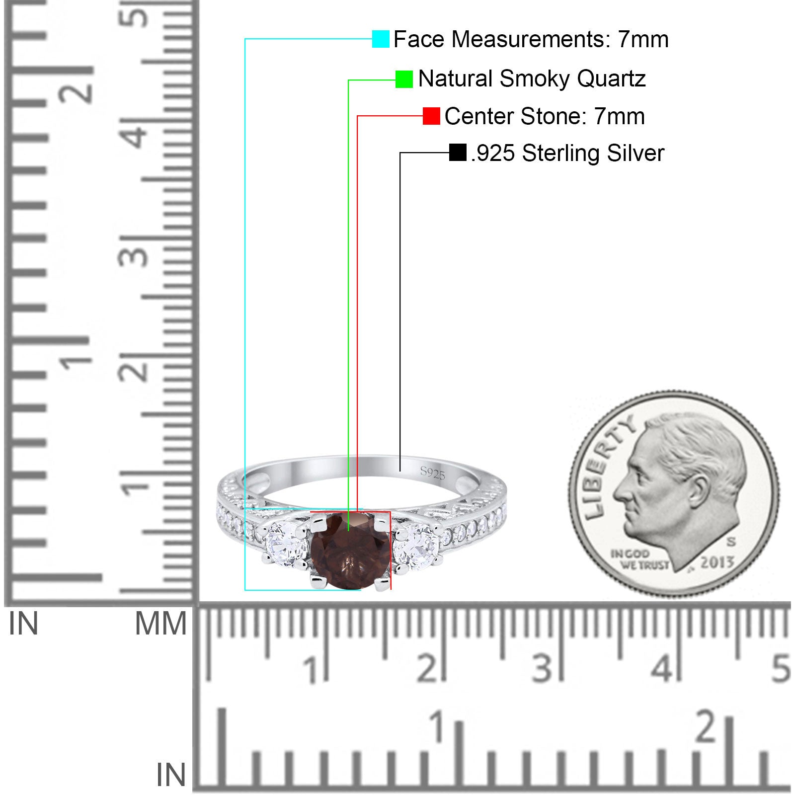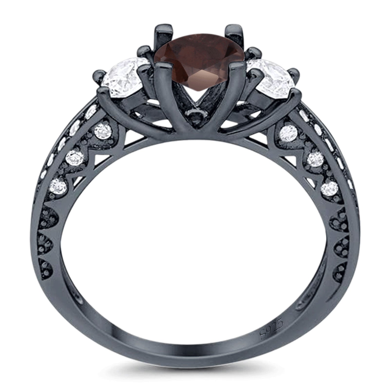 Three Stone Round Natural Chocolate Smoky Quartz Wedding Ring 925 Sterling Silver