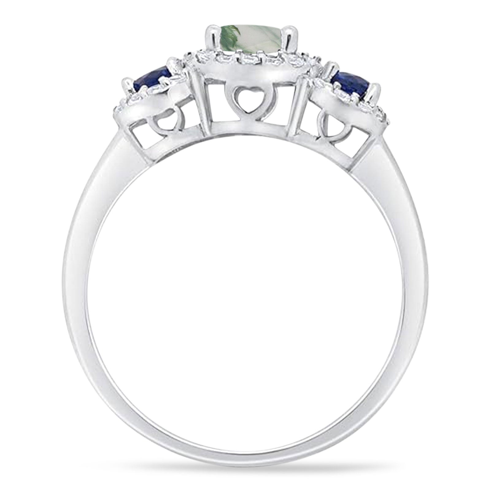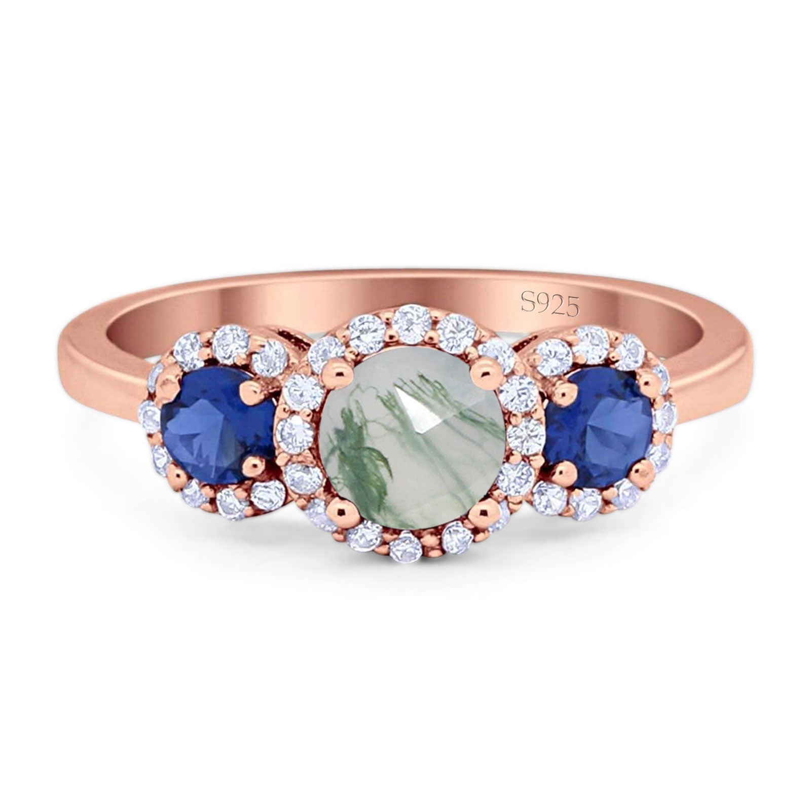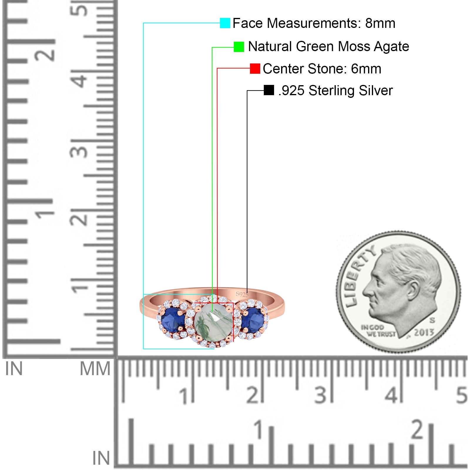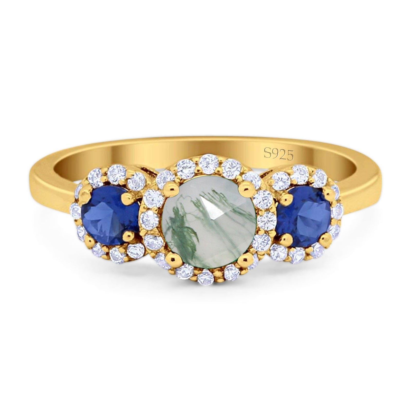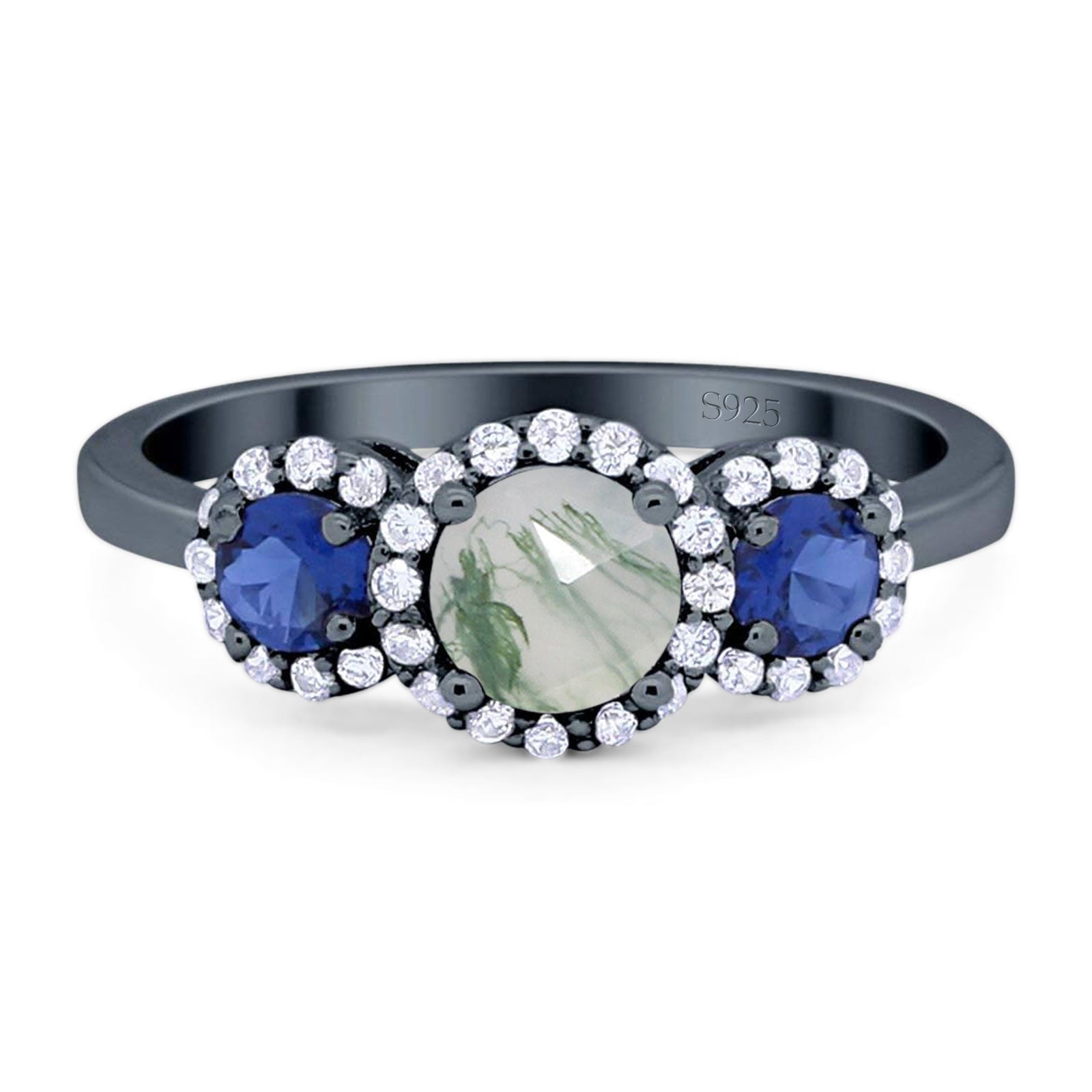 Three Stone Round Natural Green Moss Agate Art Deco Ring 925 Sterling Silver