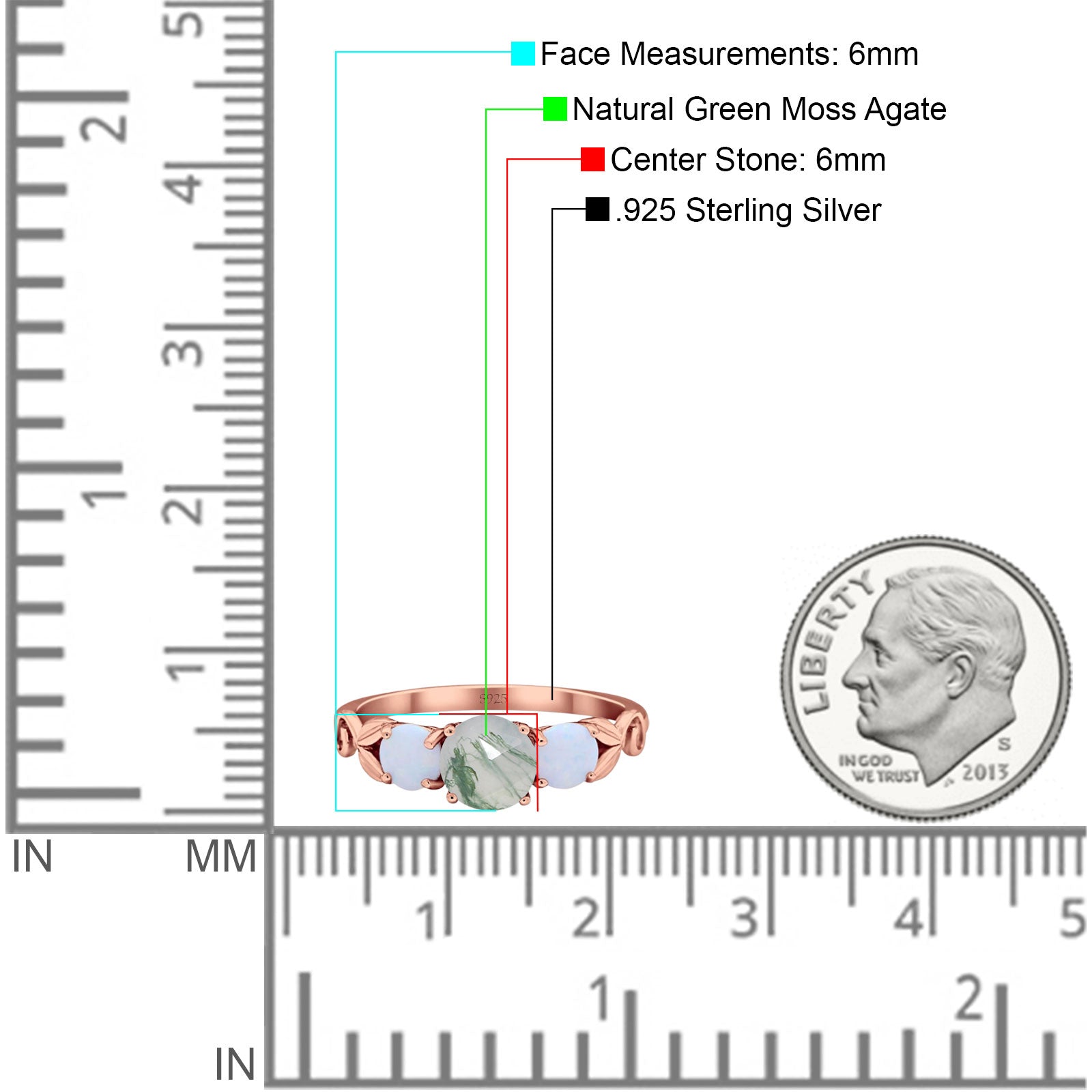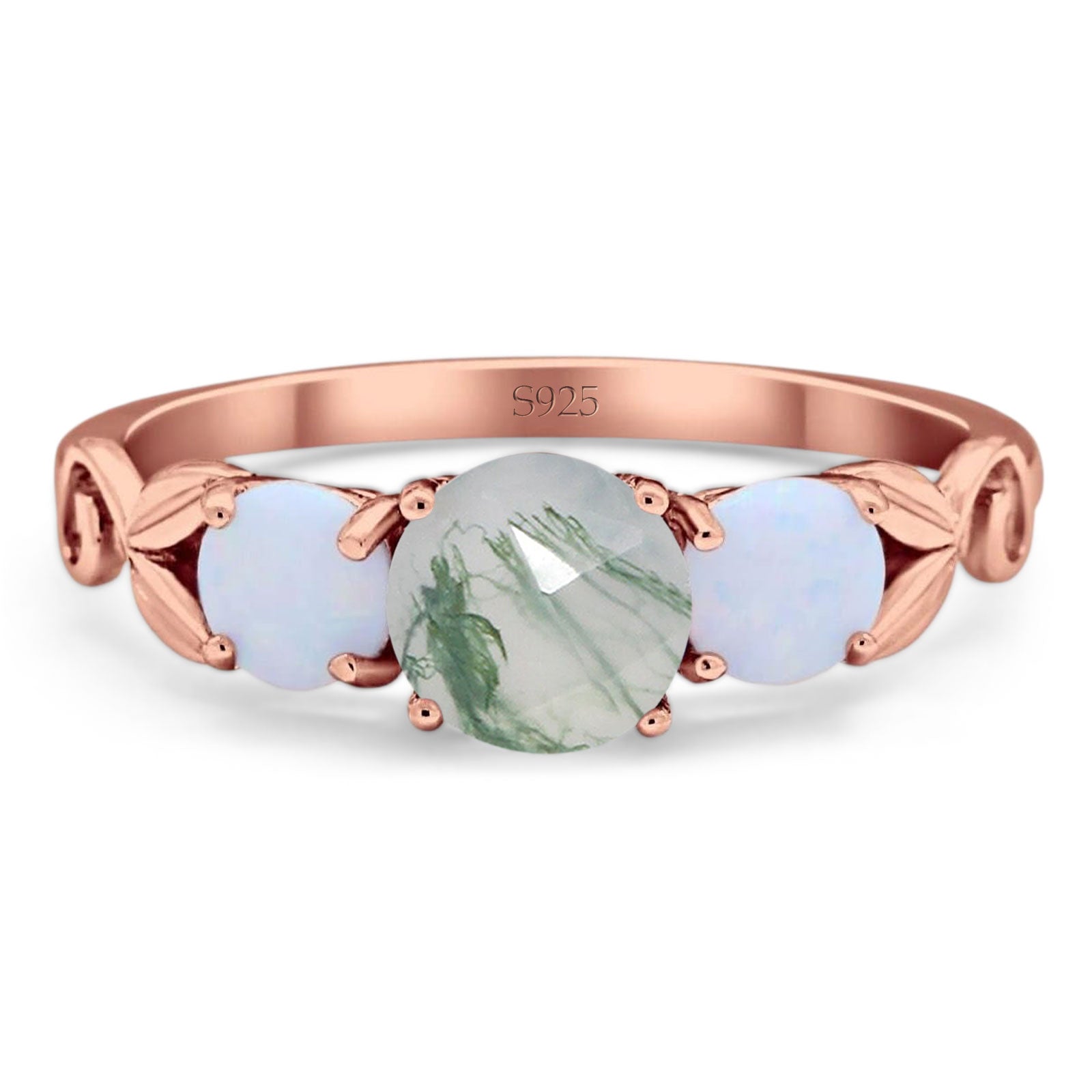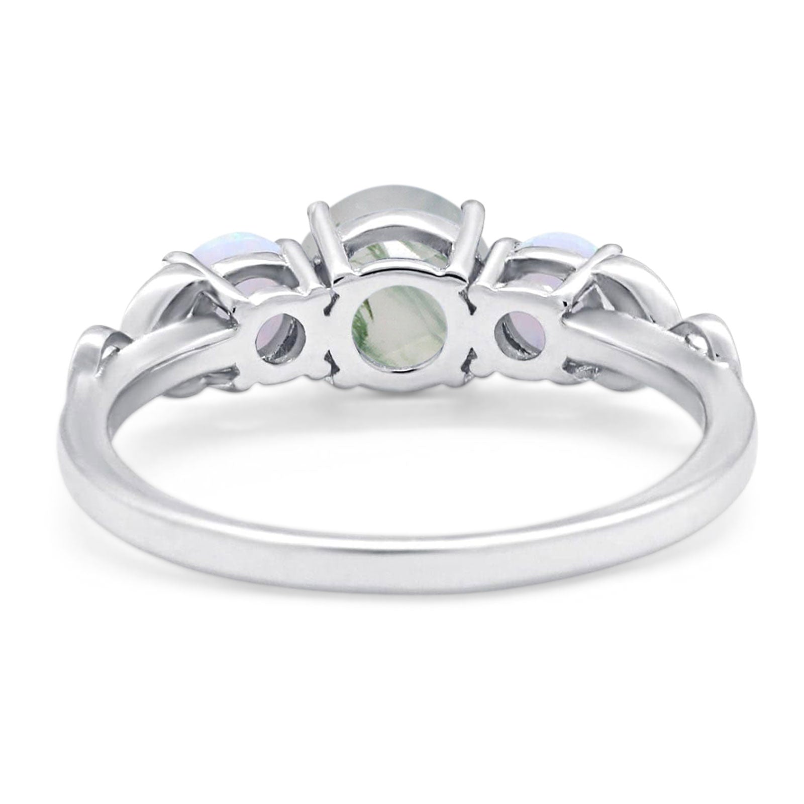 Three Stone Round Natural Green Moss Agate Wedding Ring 925 Sterling Silver