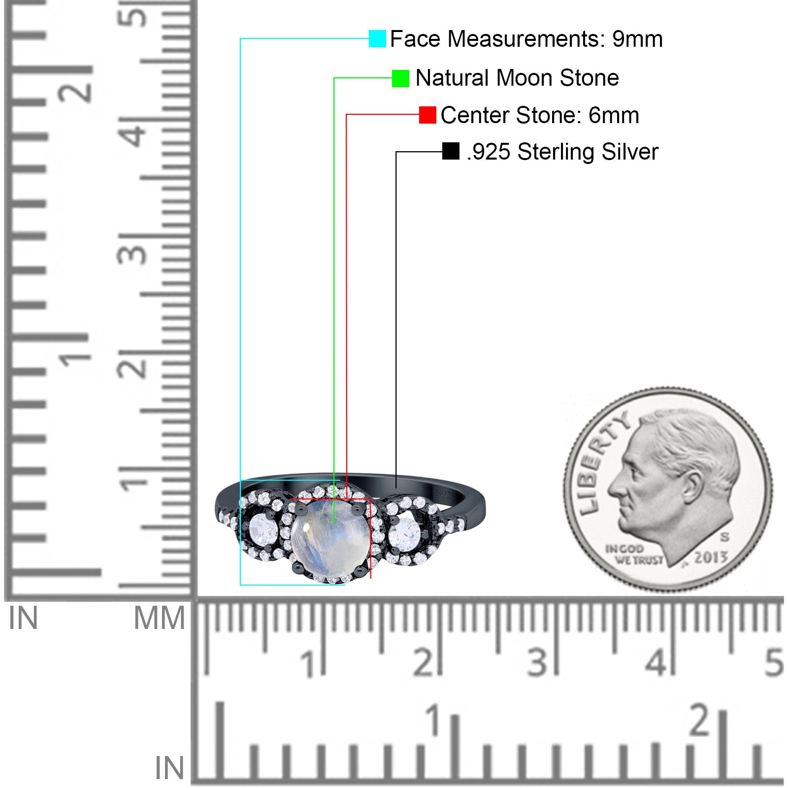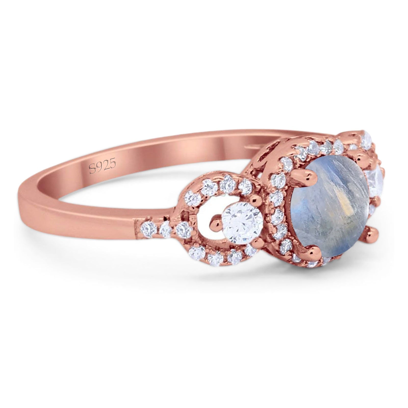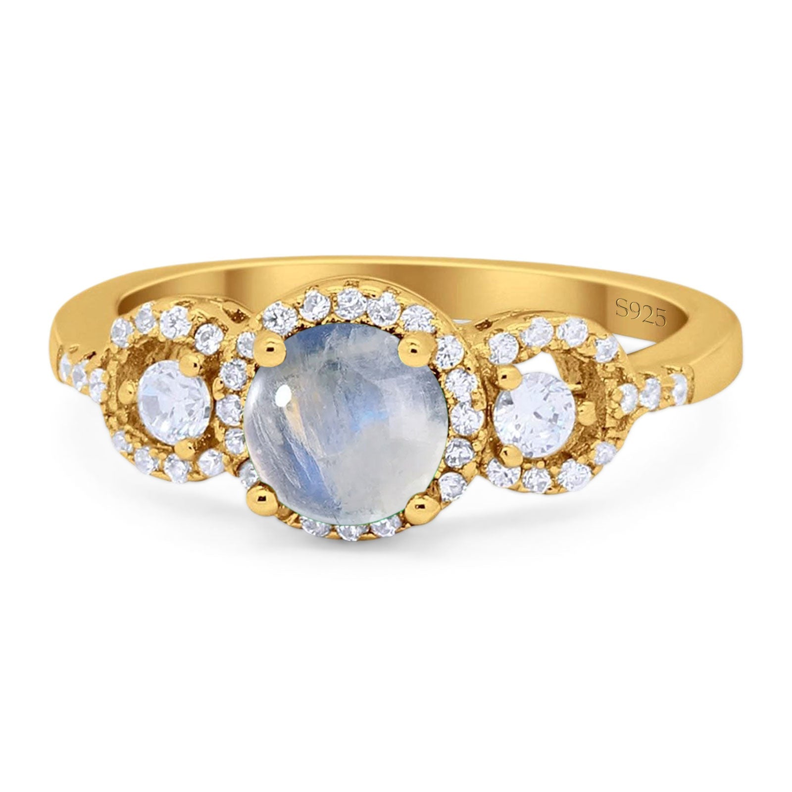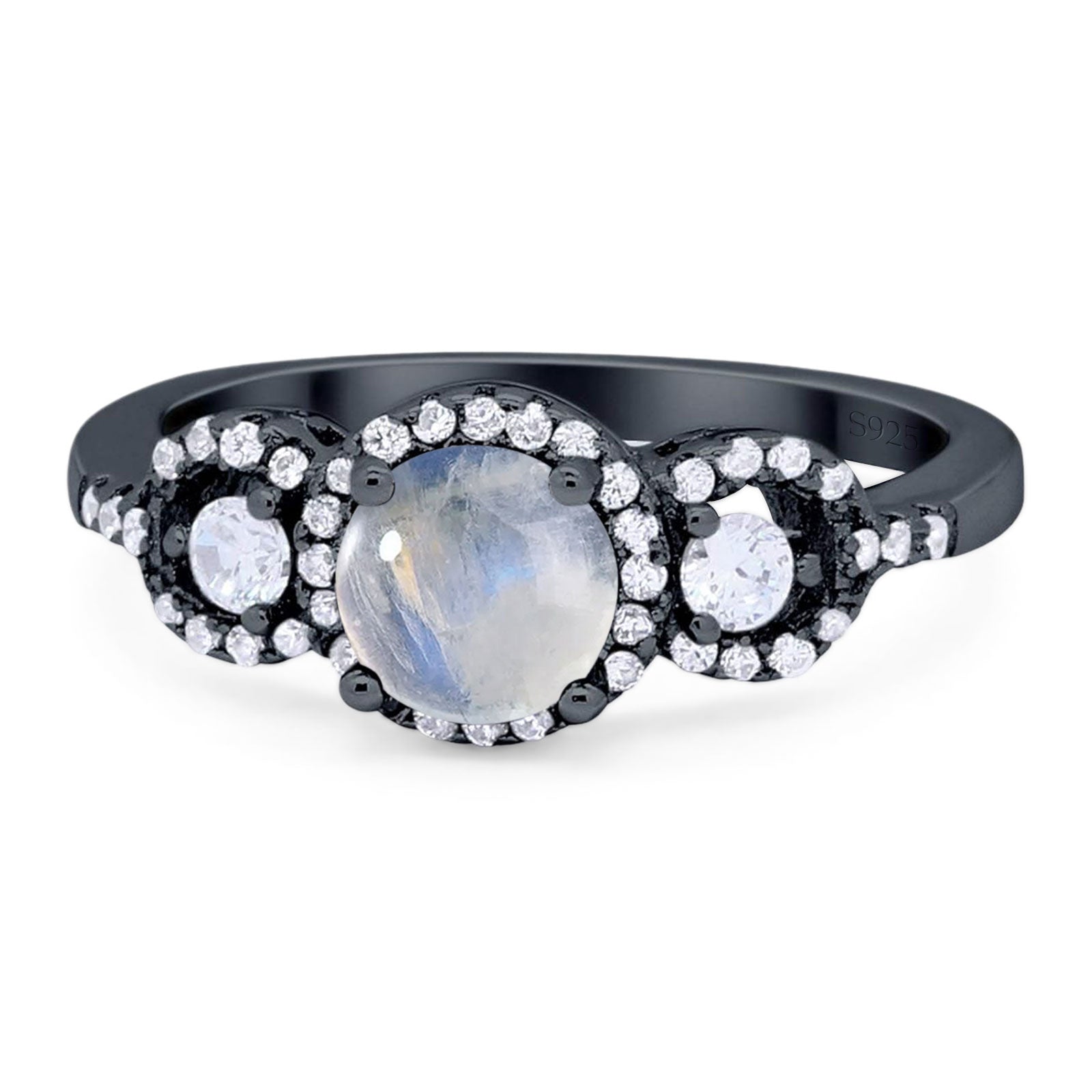 Three Stone Round Natural Moonstone Wedding Ring 925 Sterling Silver