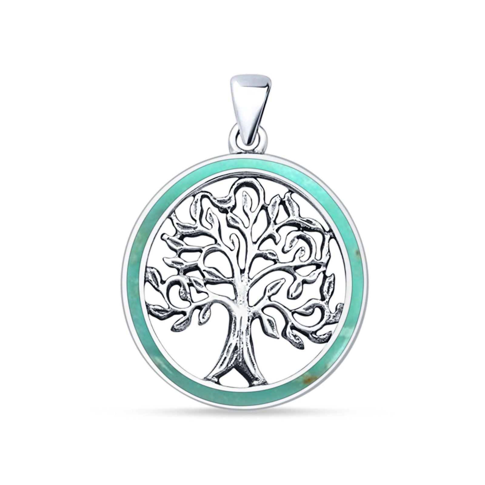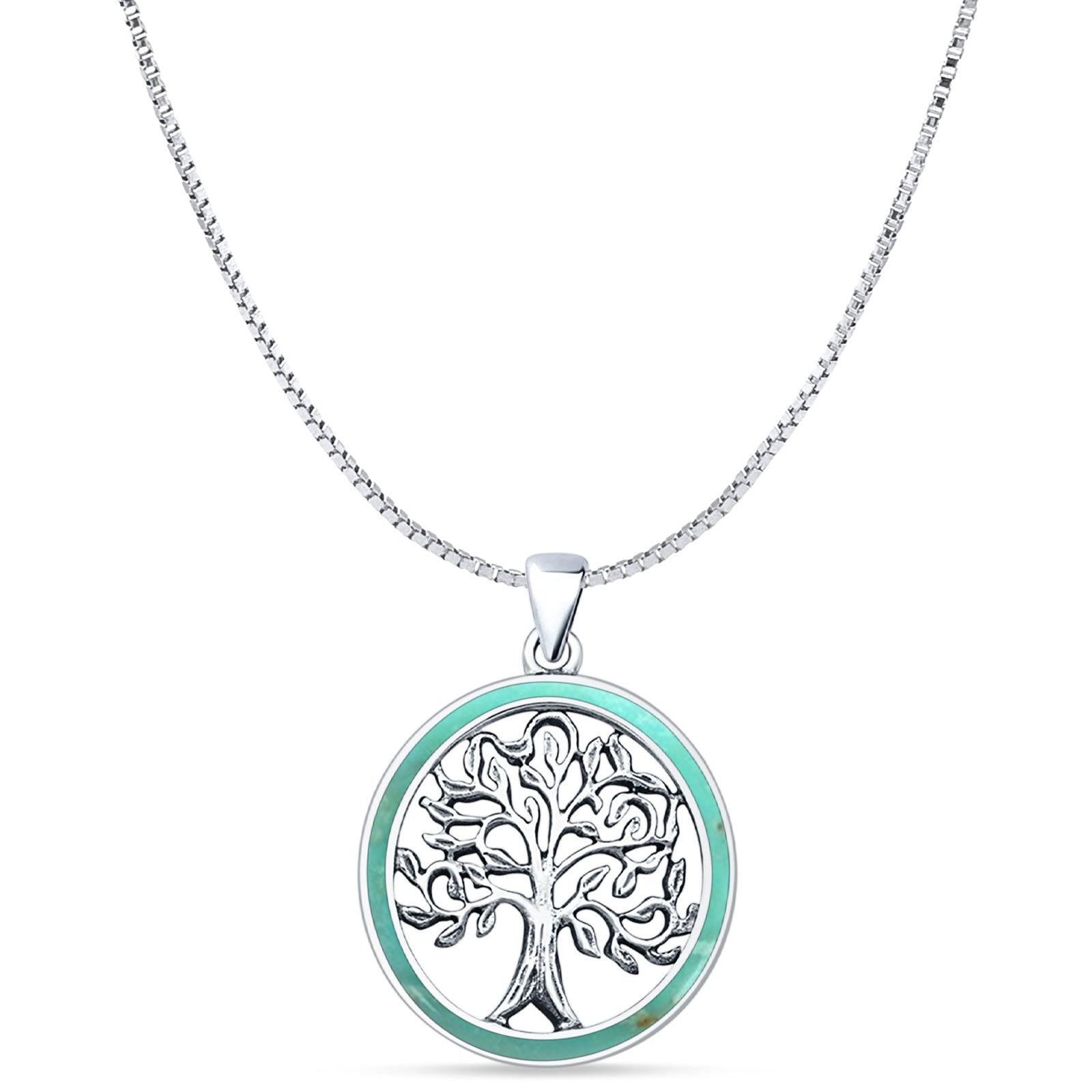 Turquoise Tree Of Life Pendant Box Chain Necklace Oxidized 925 Sterling Silver