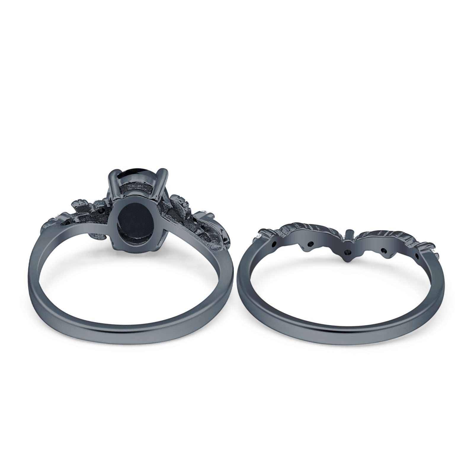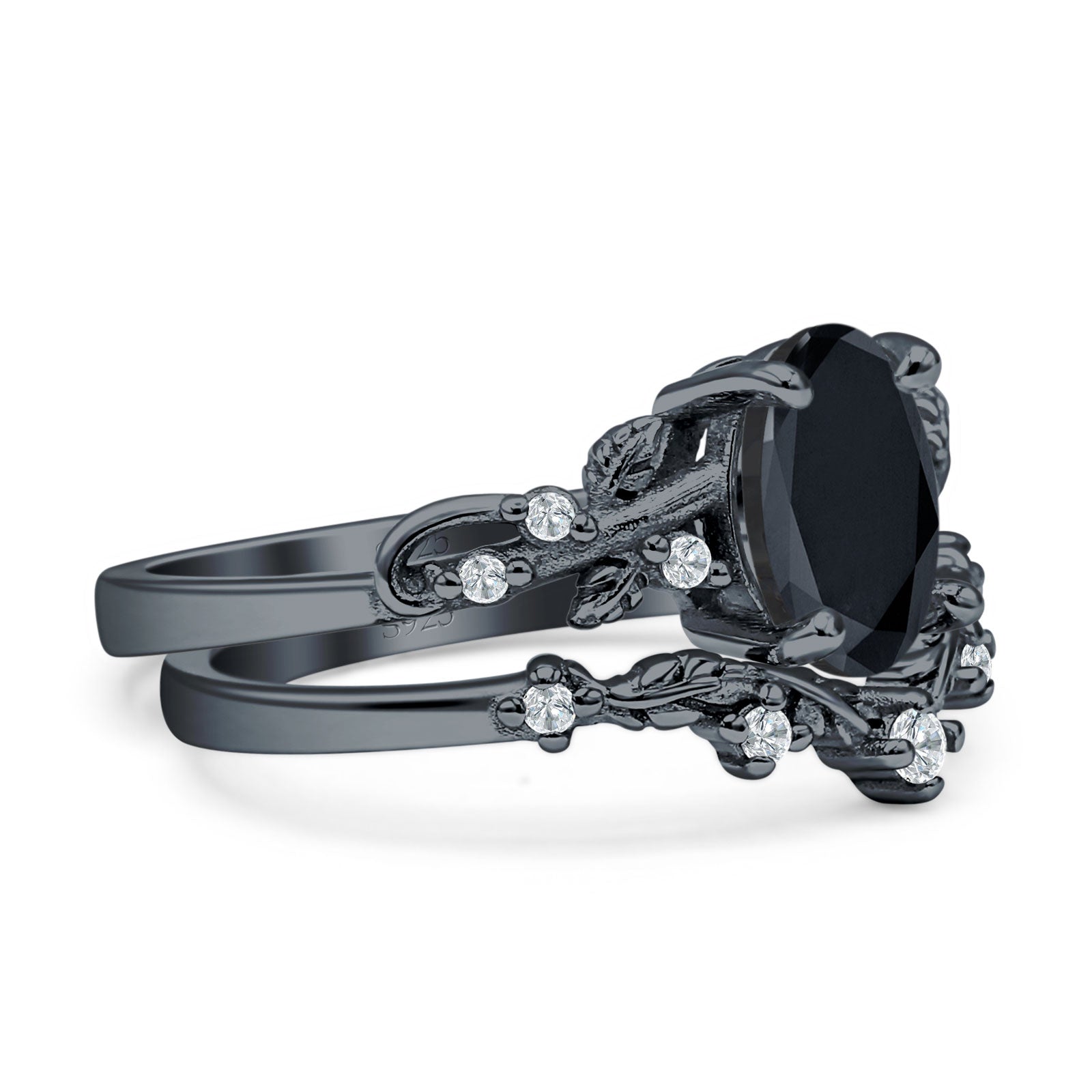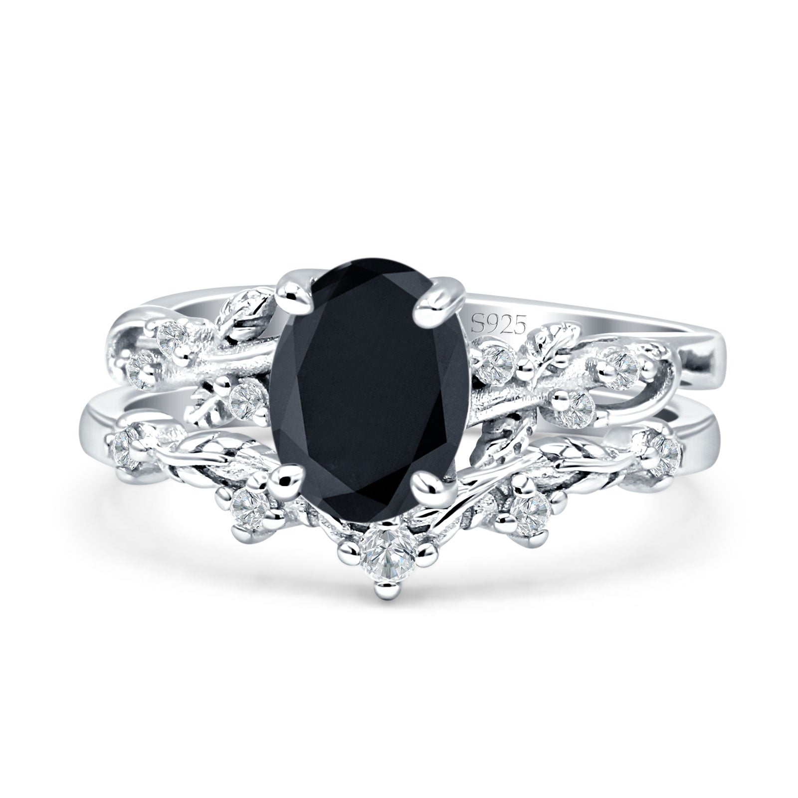 Two Piece Oval Black CZ Leaf Style Chevron Rings 925 Sterling Silver