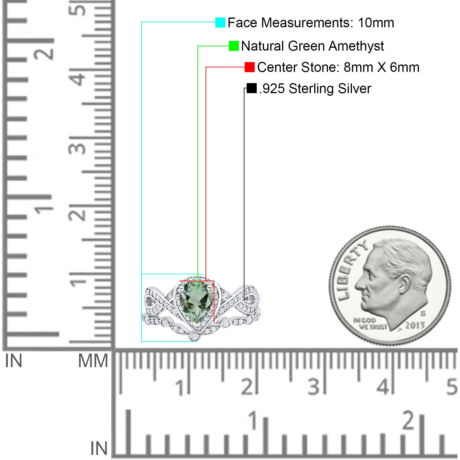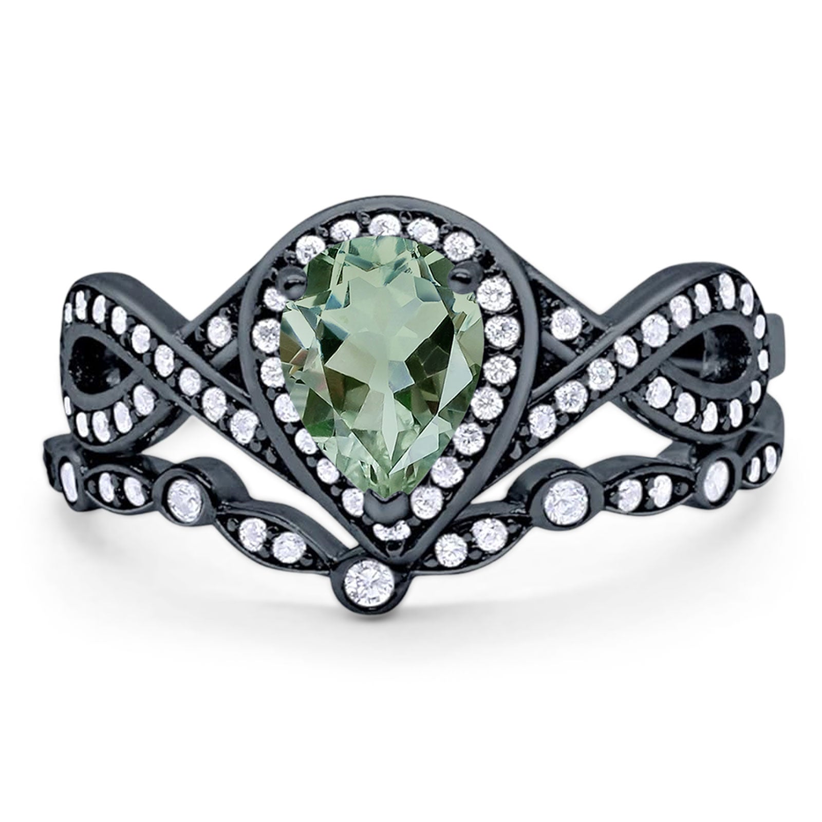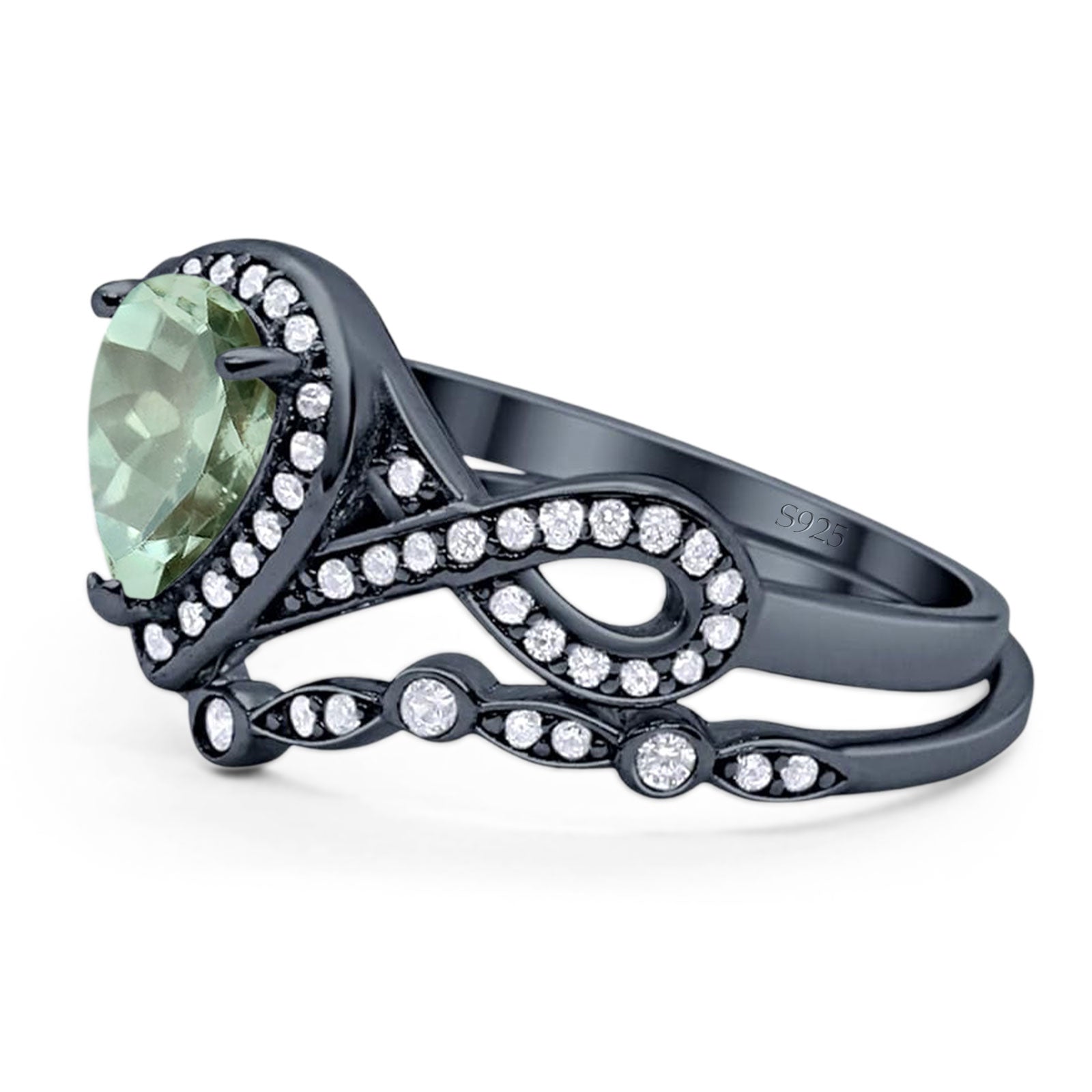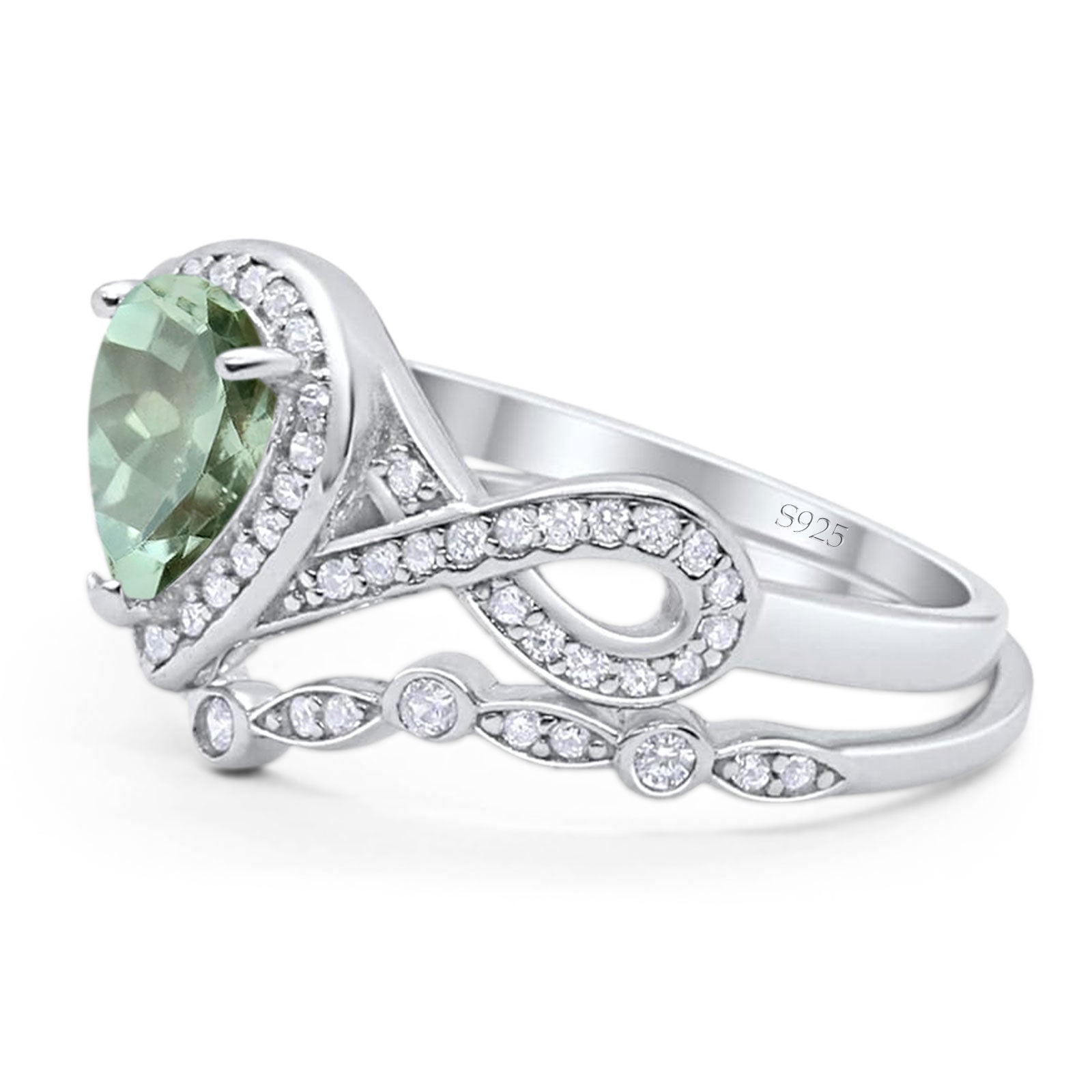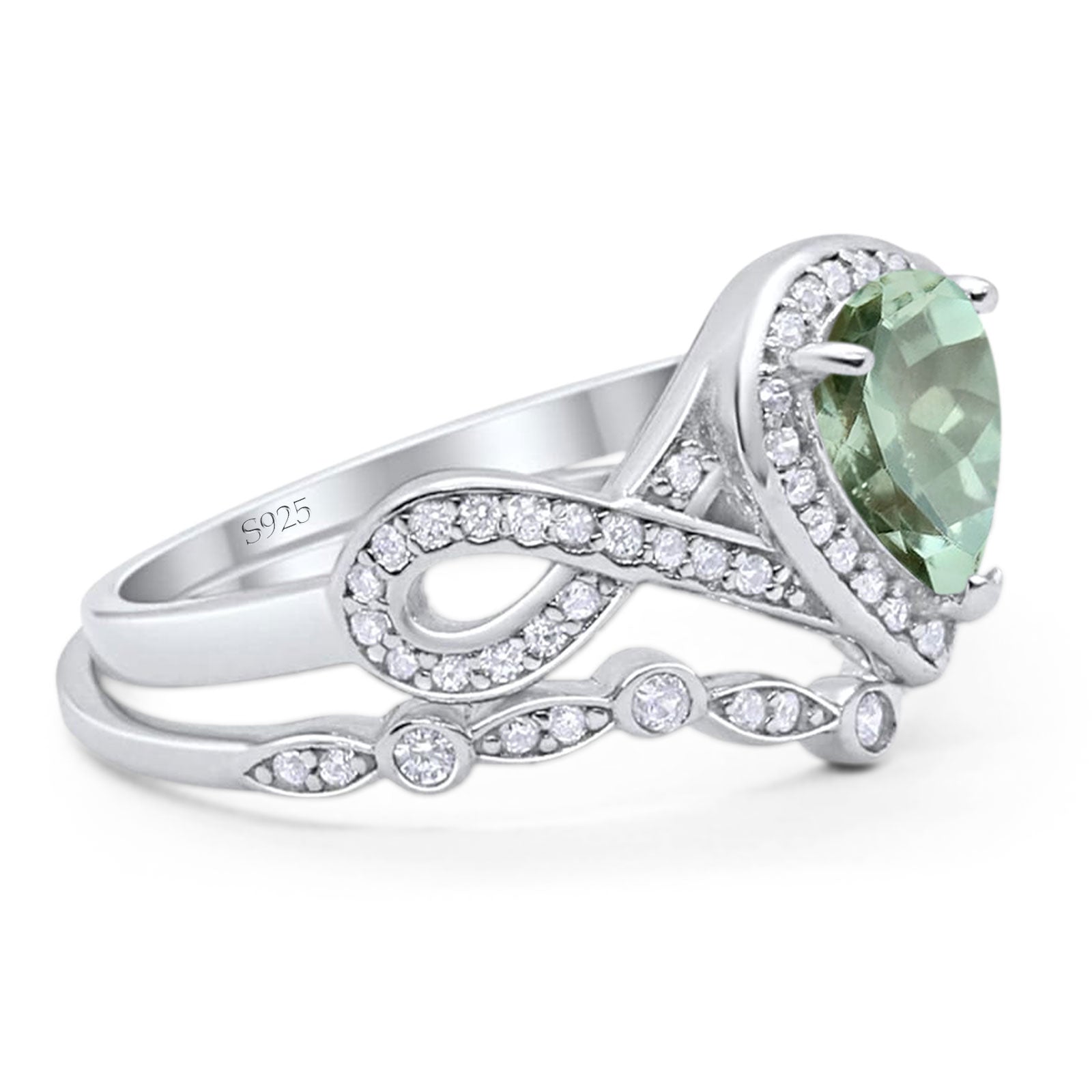 Two Piece Pear Teardrop Natural Green Amethyst Prasiolite Infinity Twisted Bridal Ring 925 Sterling Silver