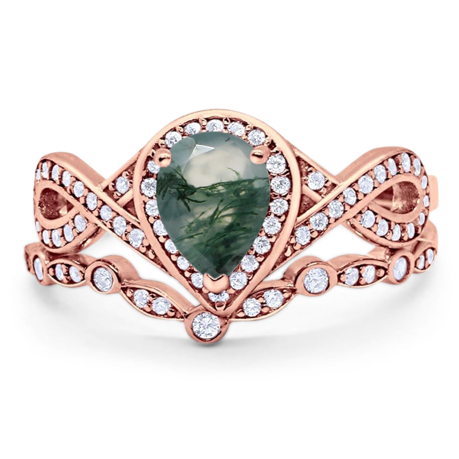 Two Piece Pear Teardrop Natural Green Moss Agate Infinity Twisted Bridal Ring 925 Sterling Silver