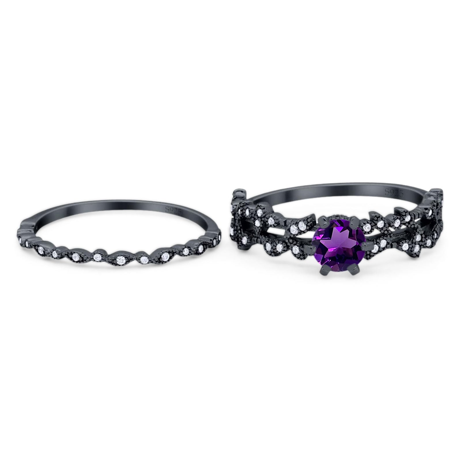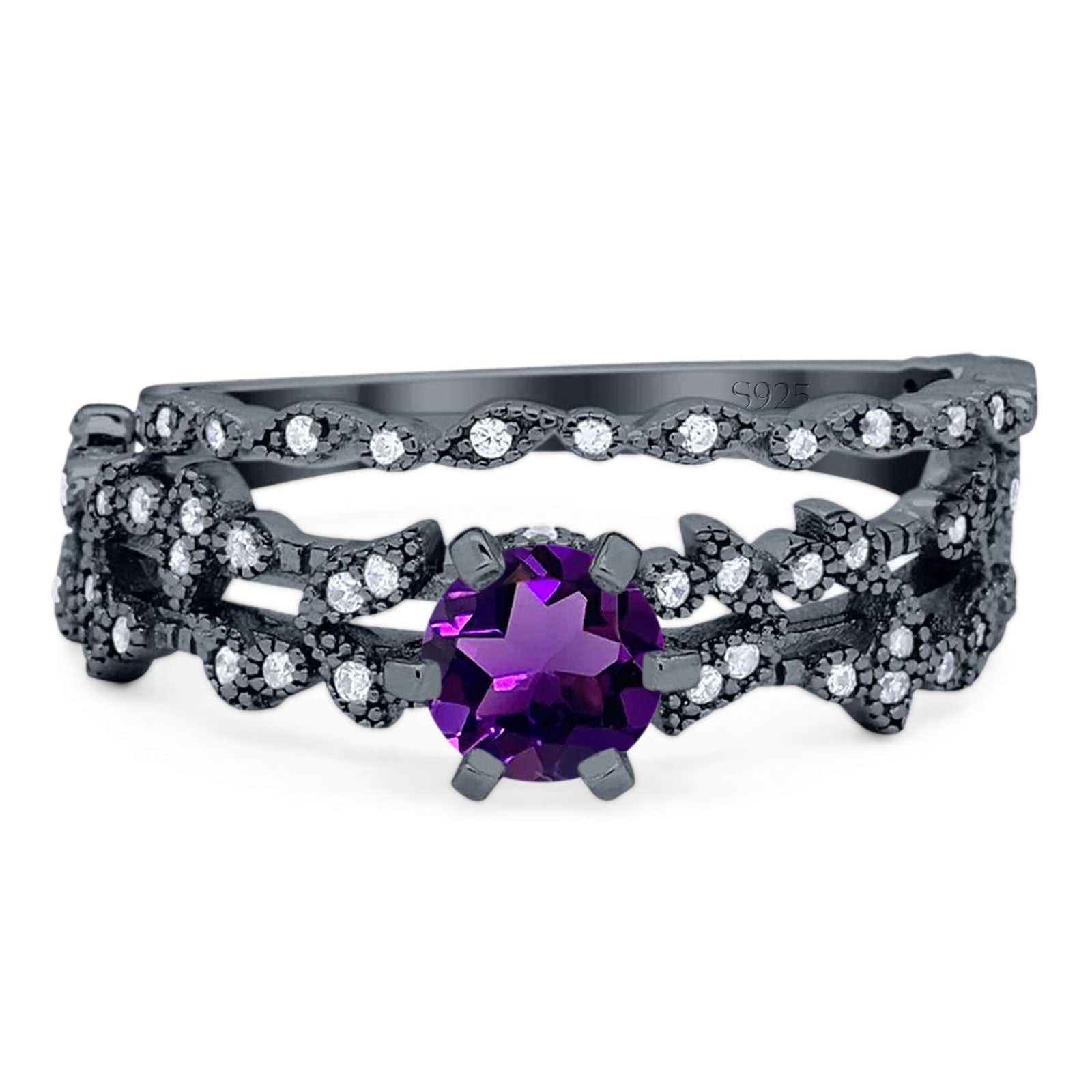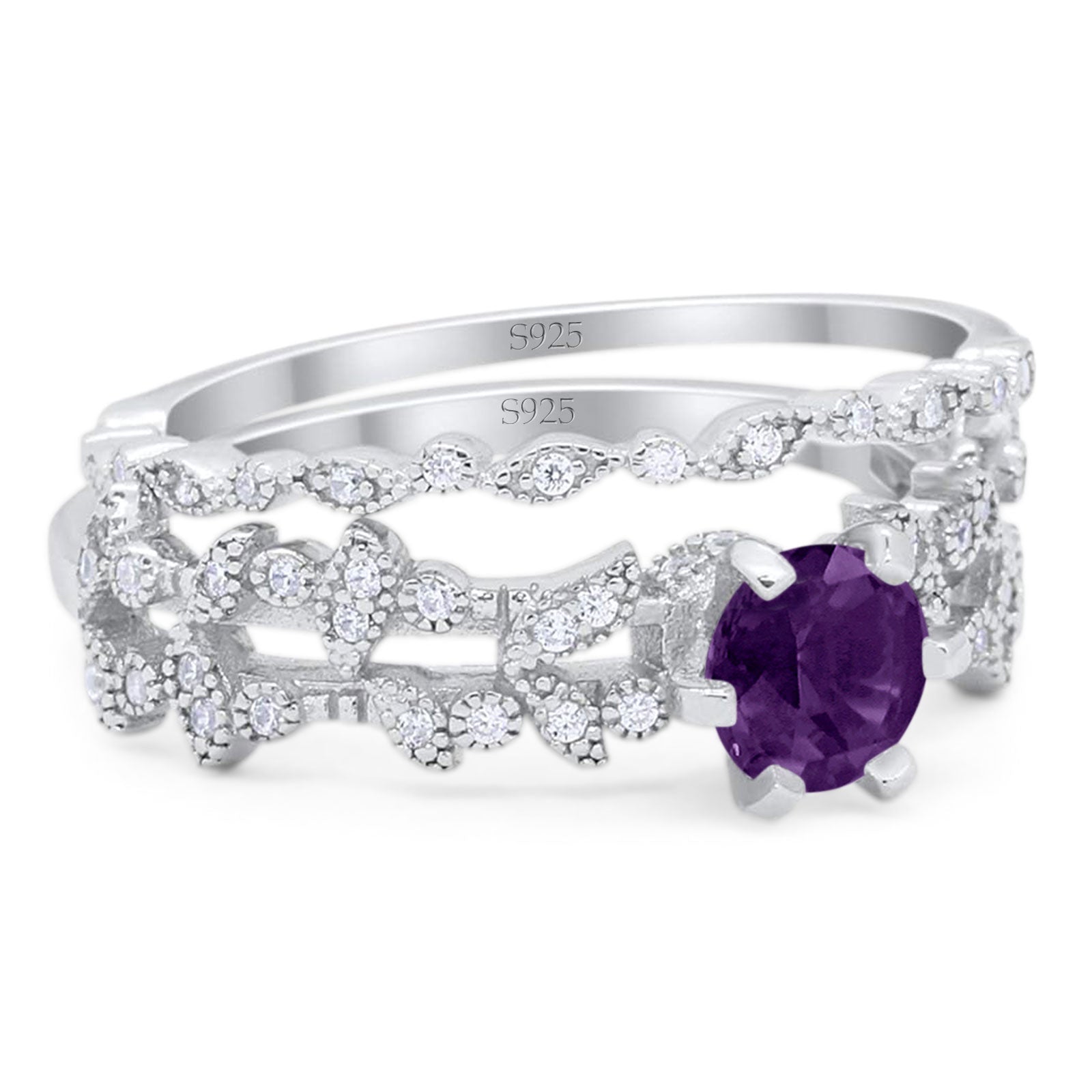 Two Piece Round Natural Amethyst Floral Leaf Style Ring 925 Sterling Silver