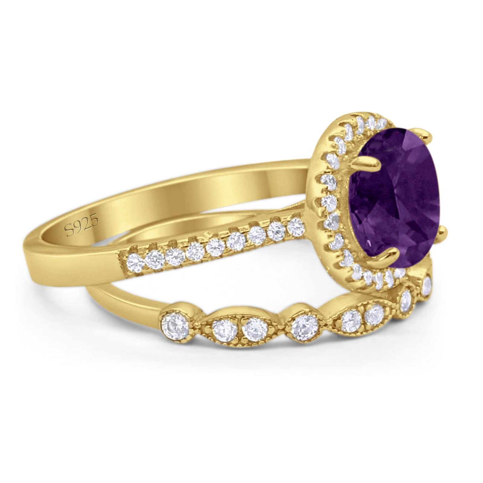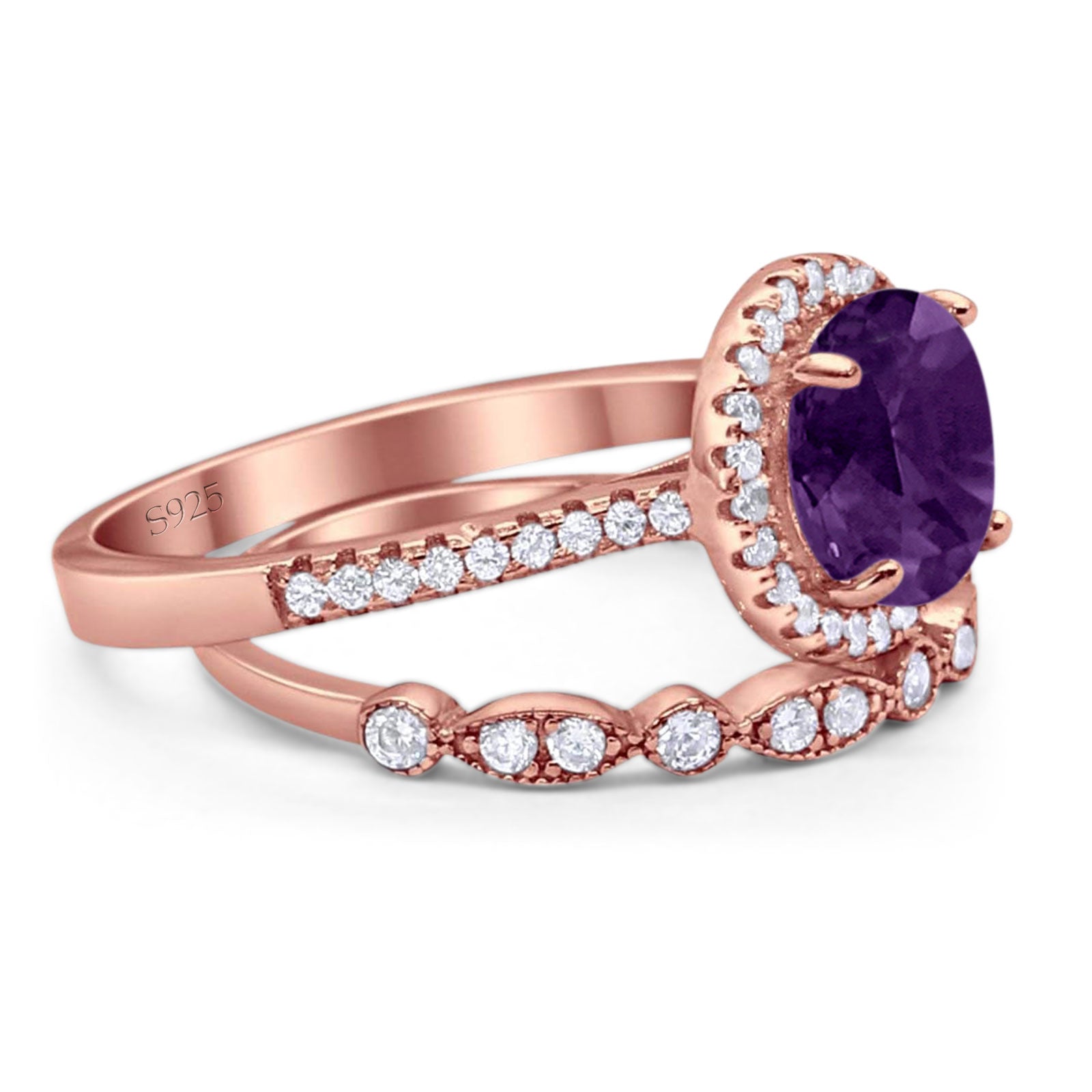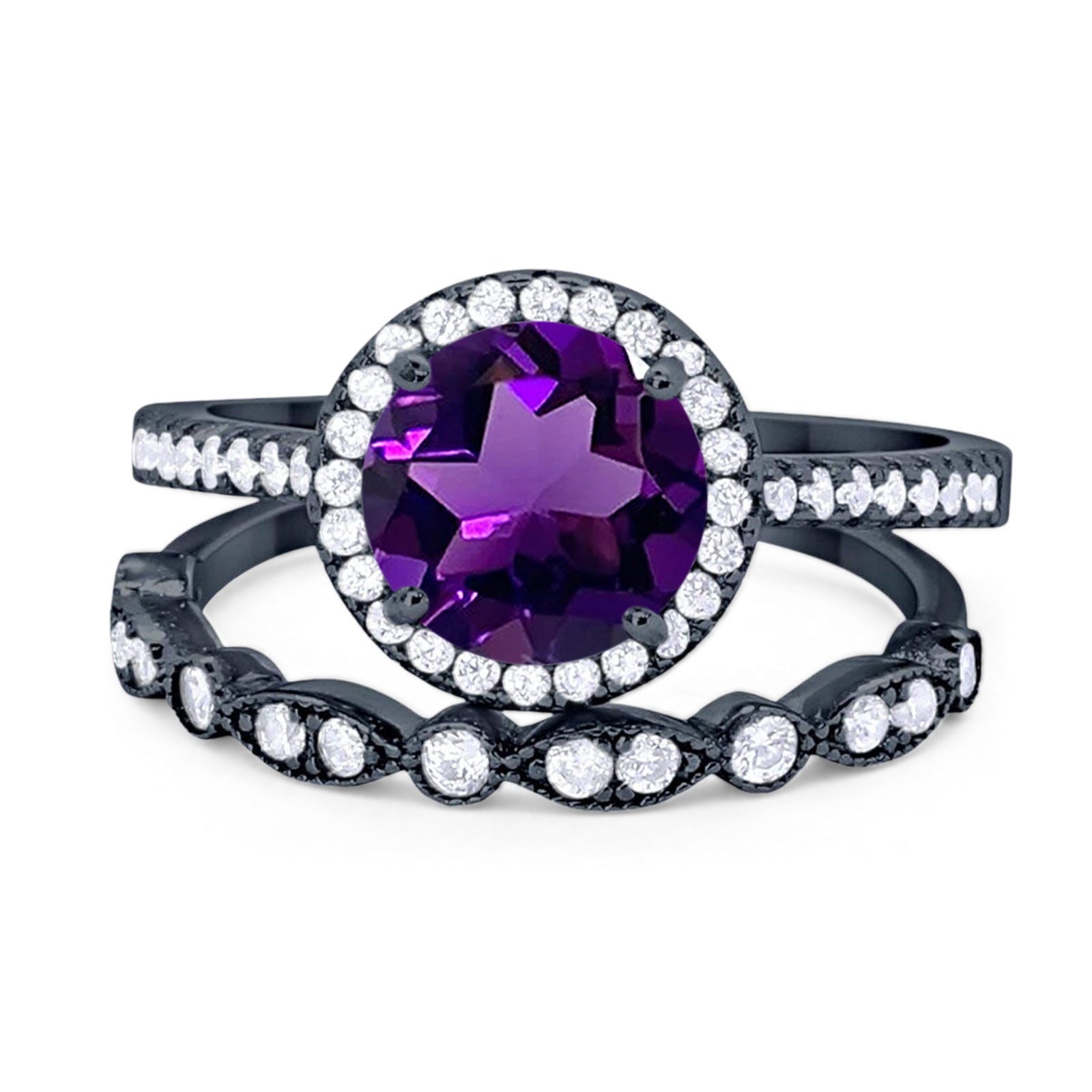 Two Piece Round Natural Amethyst Wedding Set Ring 925 Sterling Silver