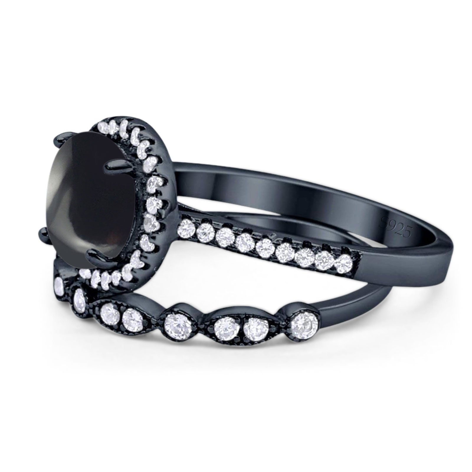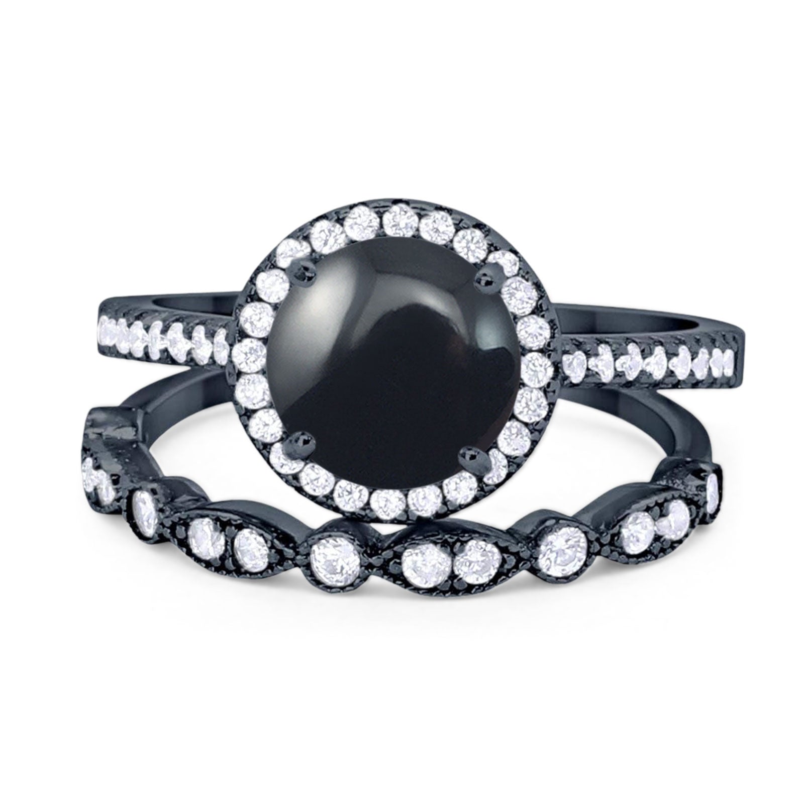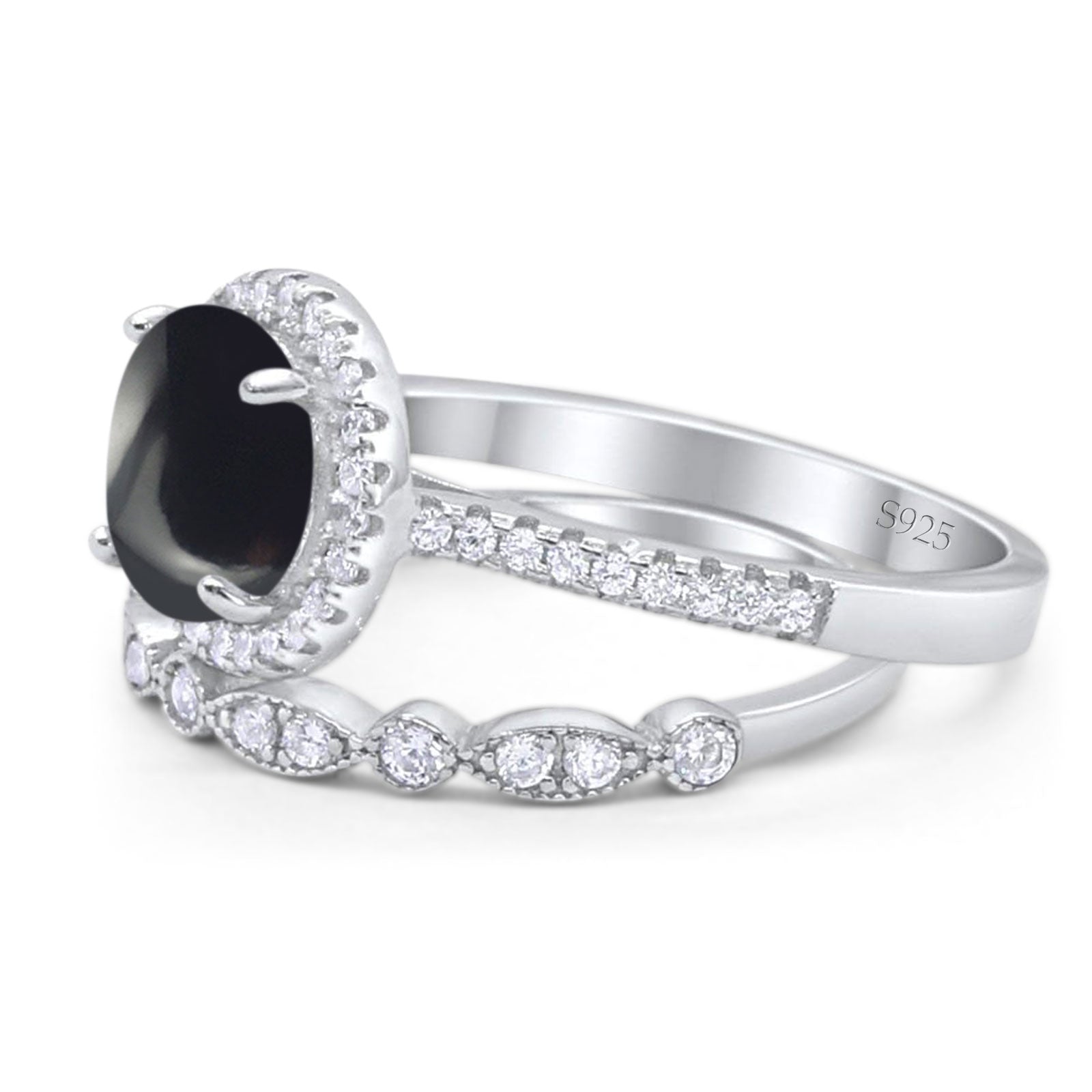 Two Piece Round Natural Black Onyx Wedding Set Ring 925 Sterling Silver