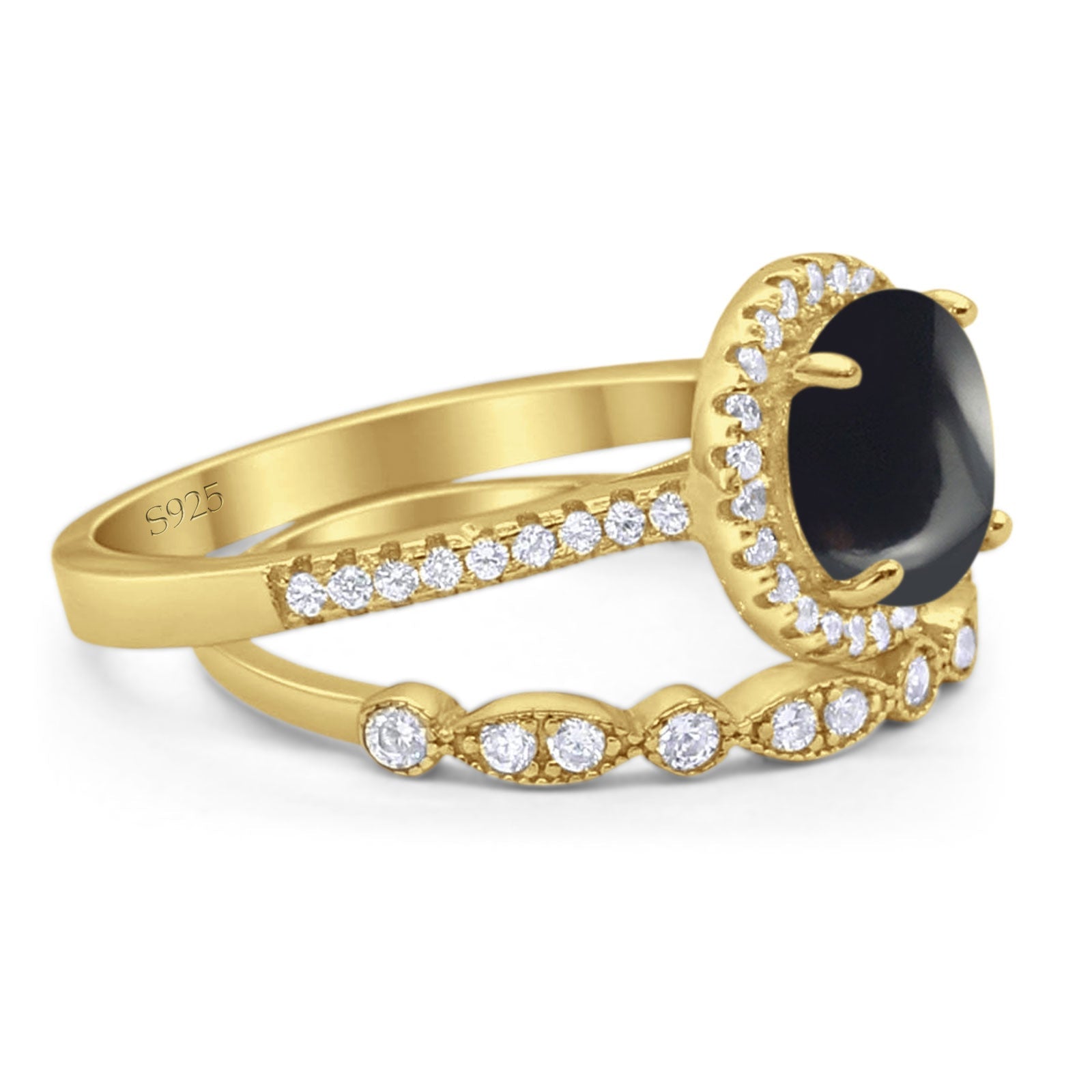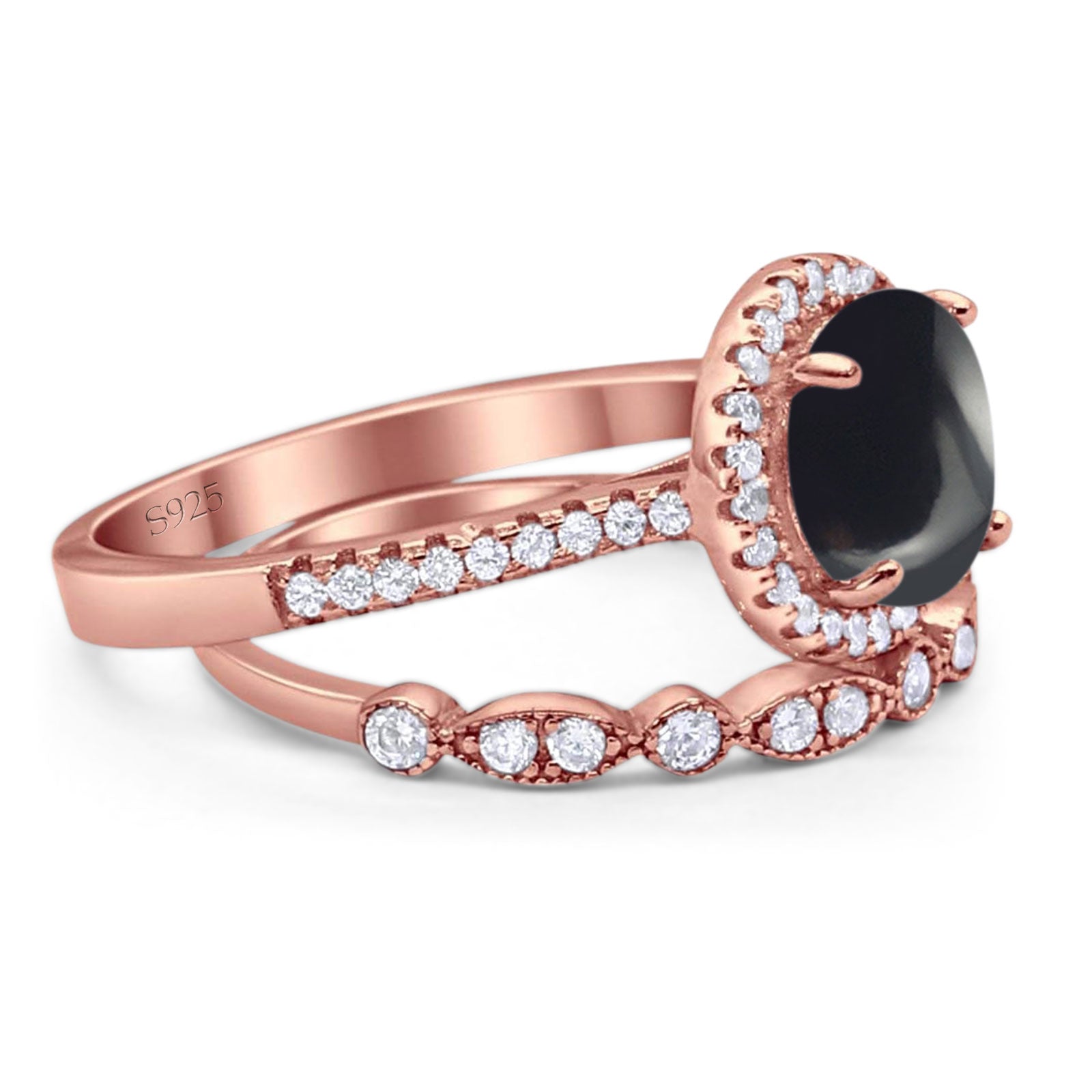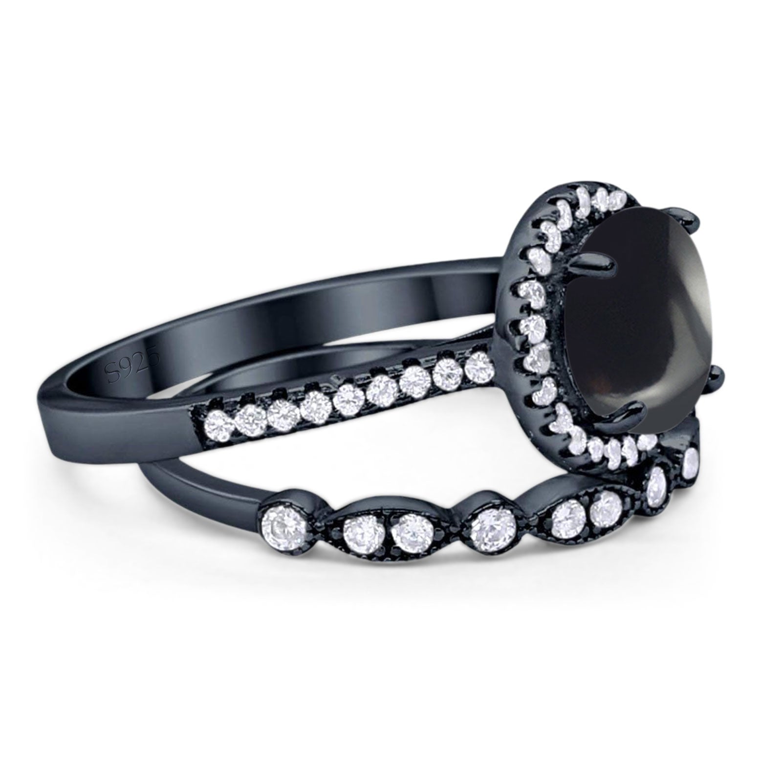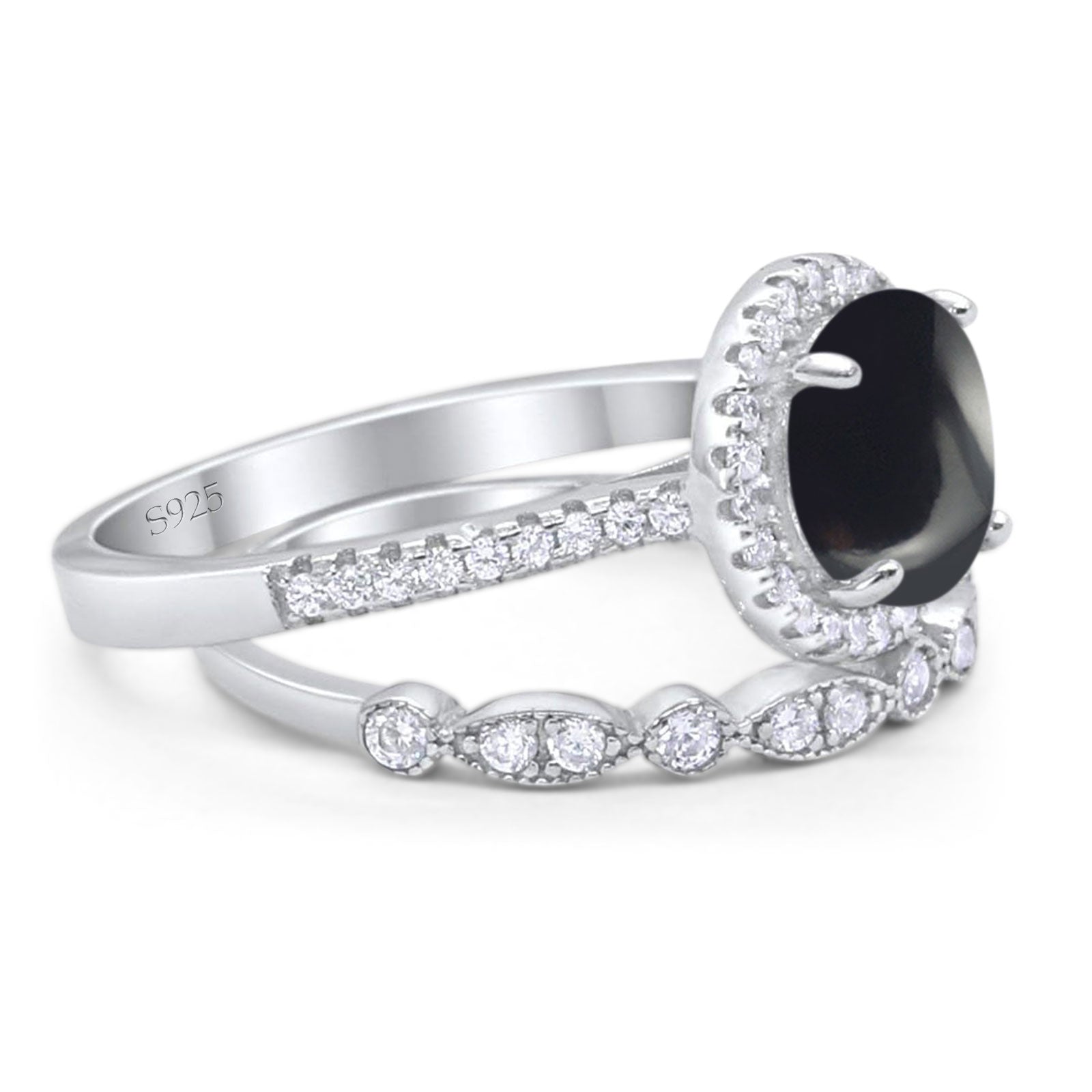 Two Piece Round Natural Black Onyx Wedding Set Ring 925 Sterling Silver