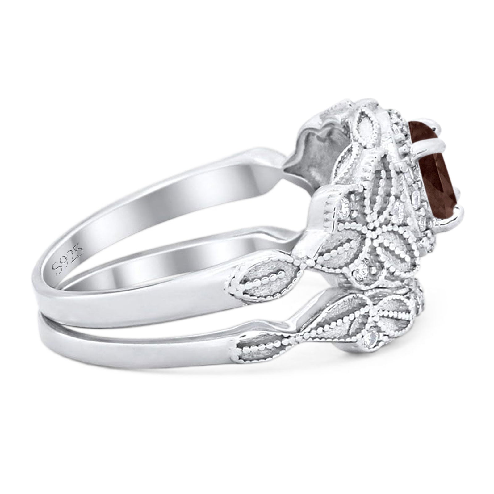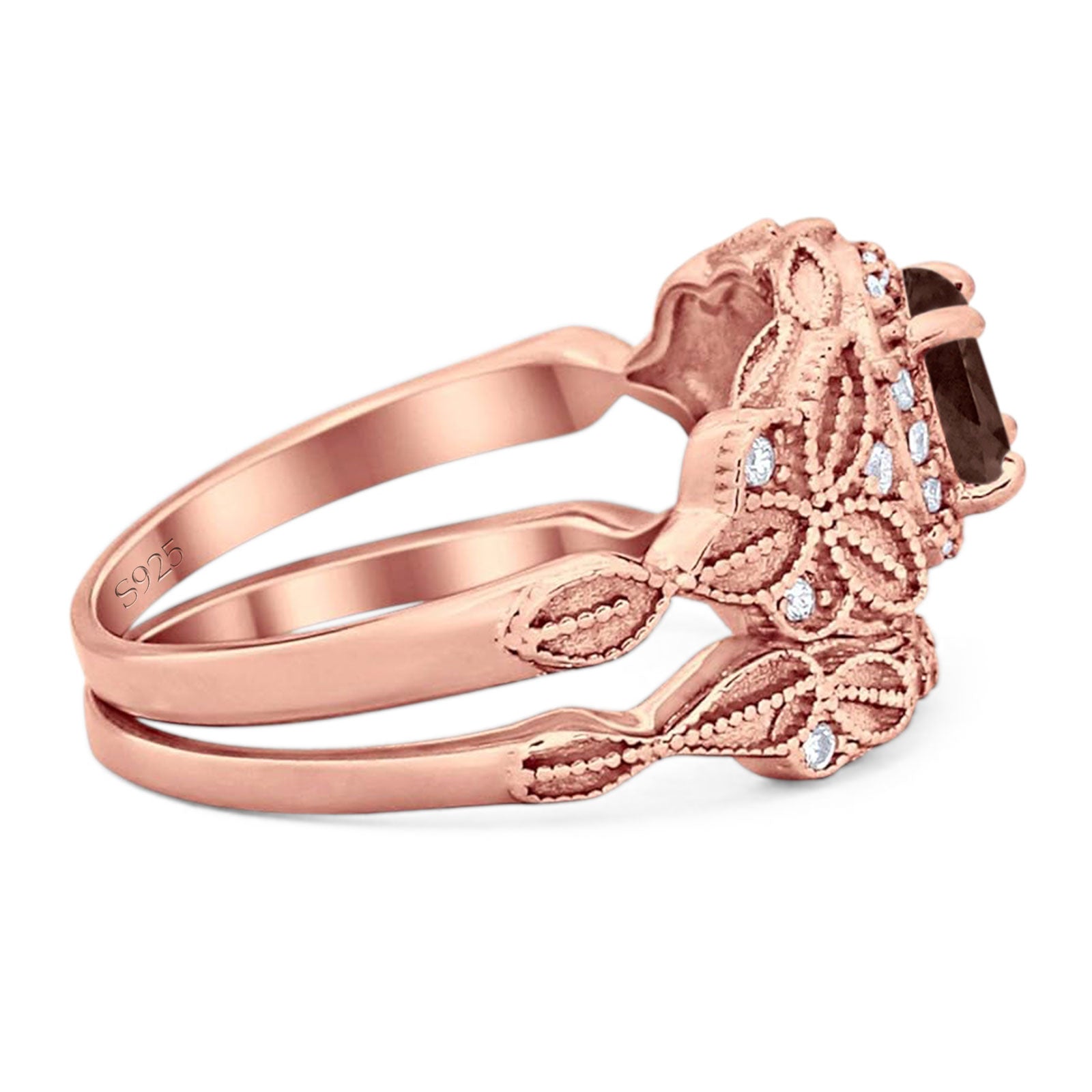 Two Piece Round Natural Chocolate Smoky Quartz Leaf Design Ring 925 Sterling Silver