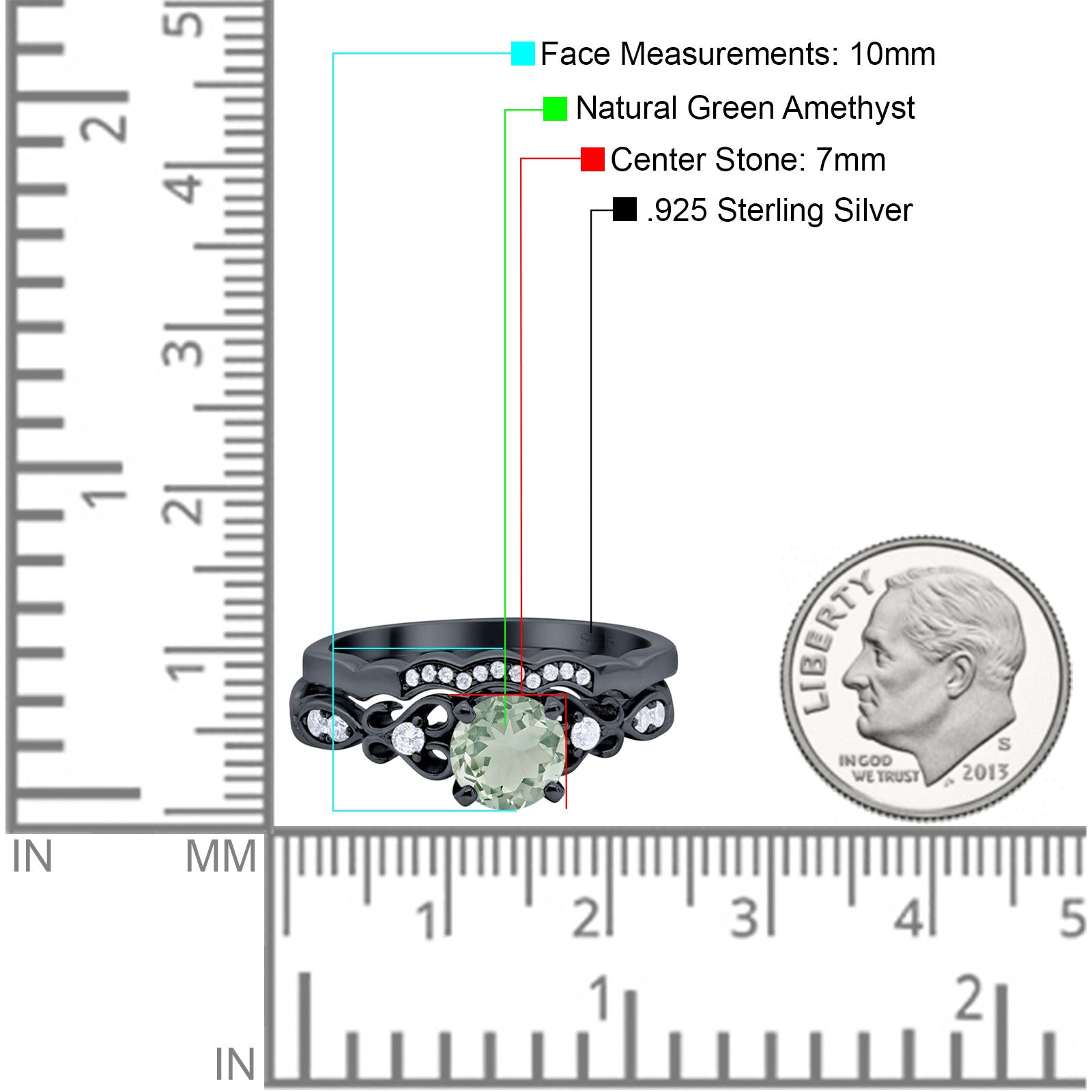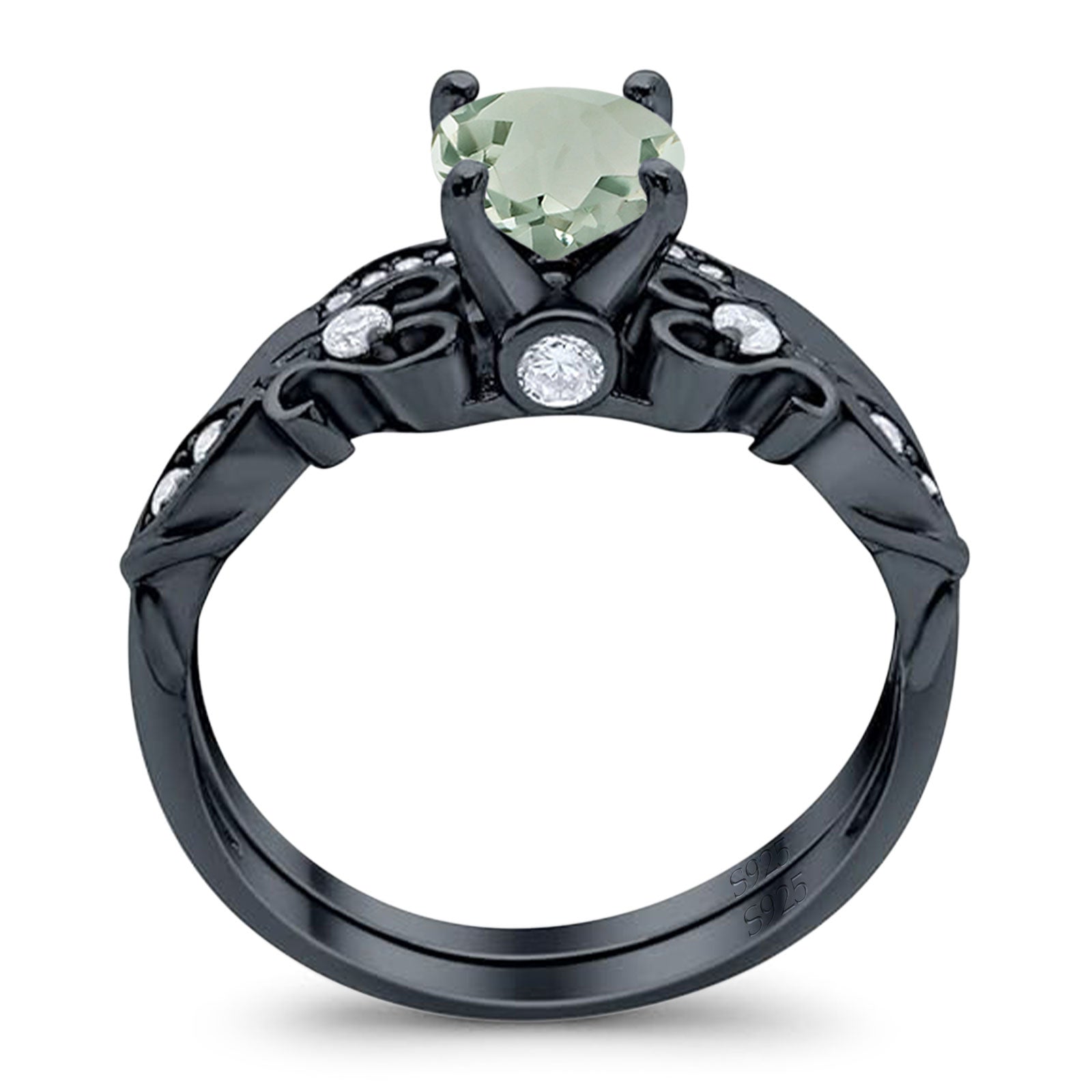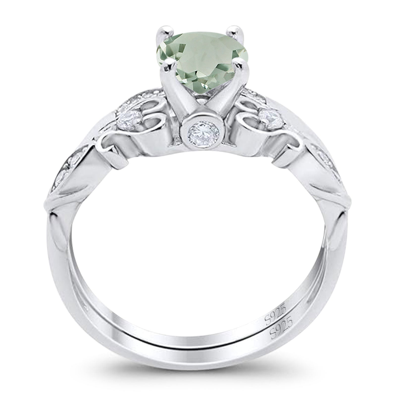 Two Piece Round Natural Green Amethyst Prasiolite Art Deco Ring 925 Sterling Silver