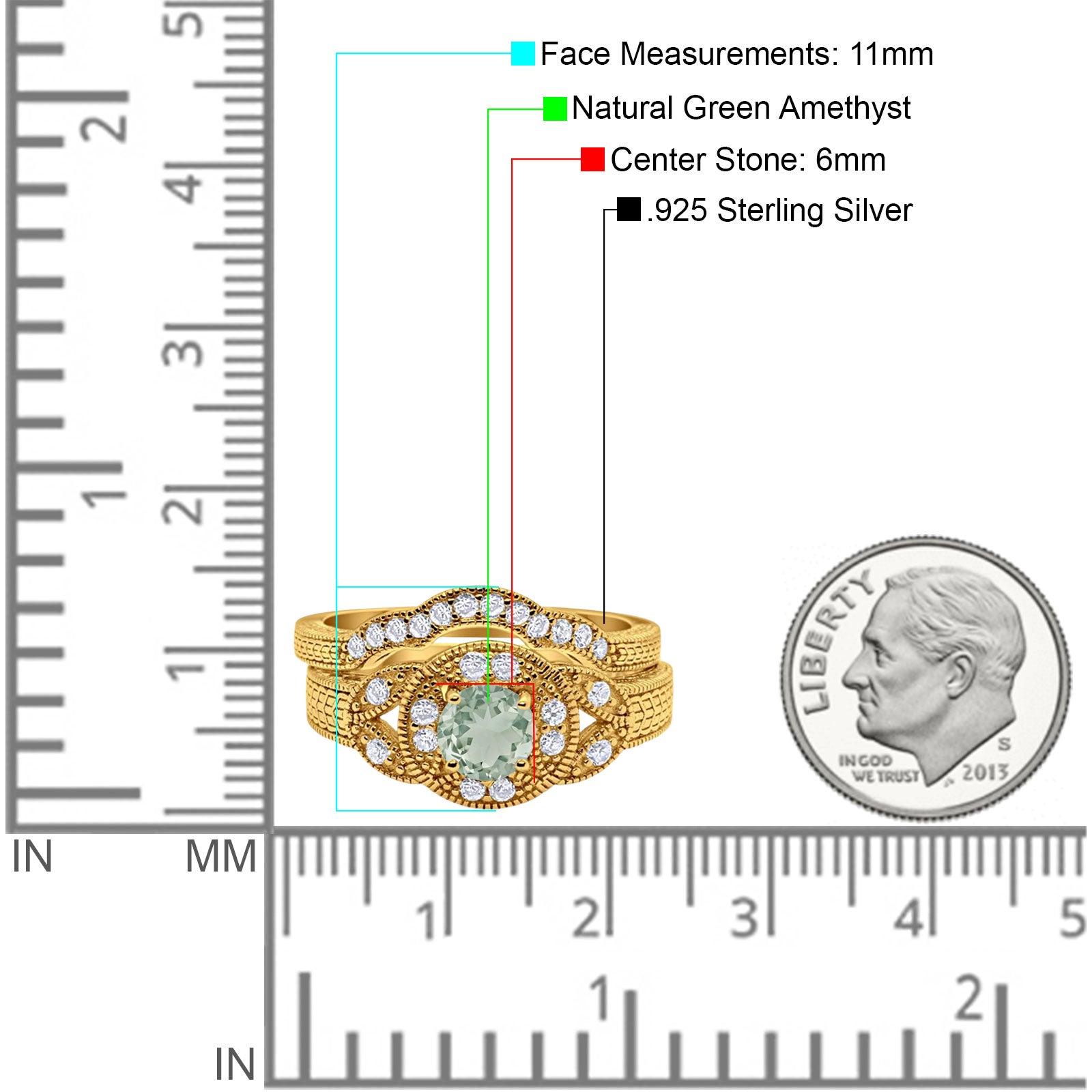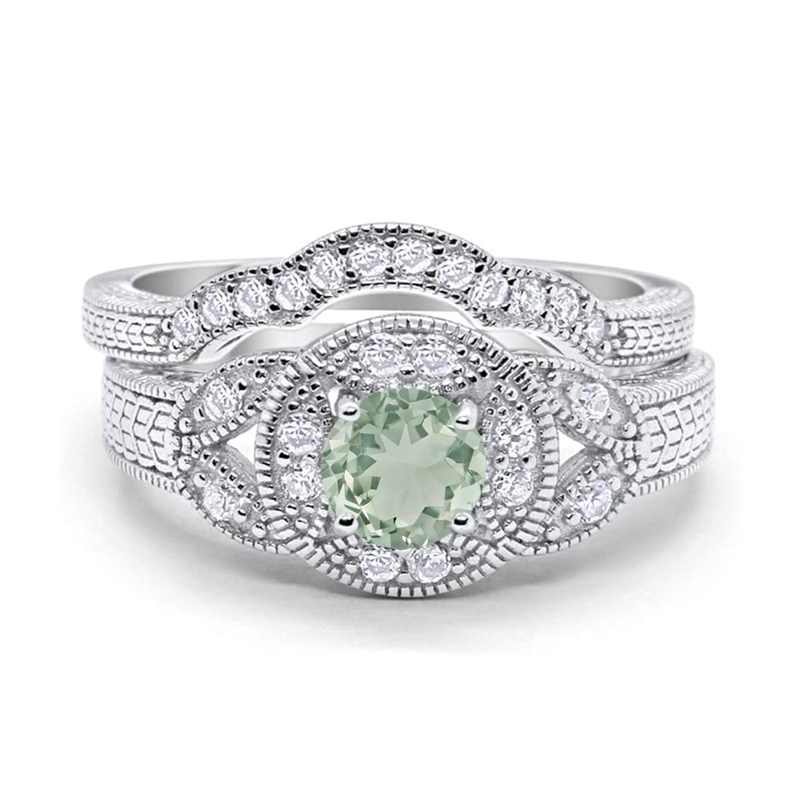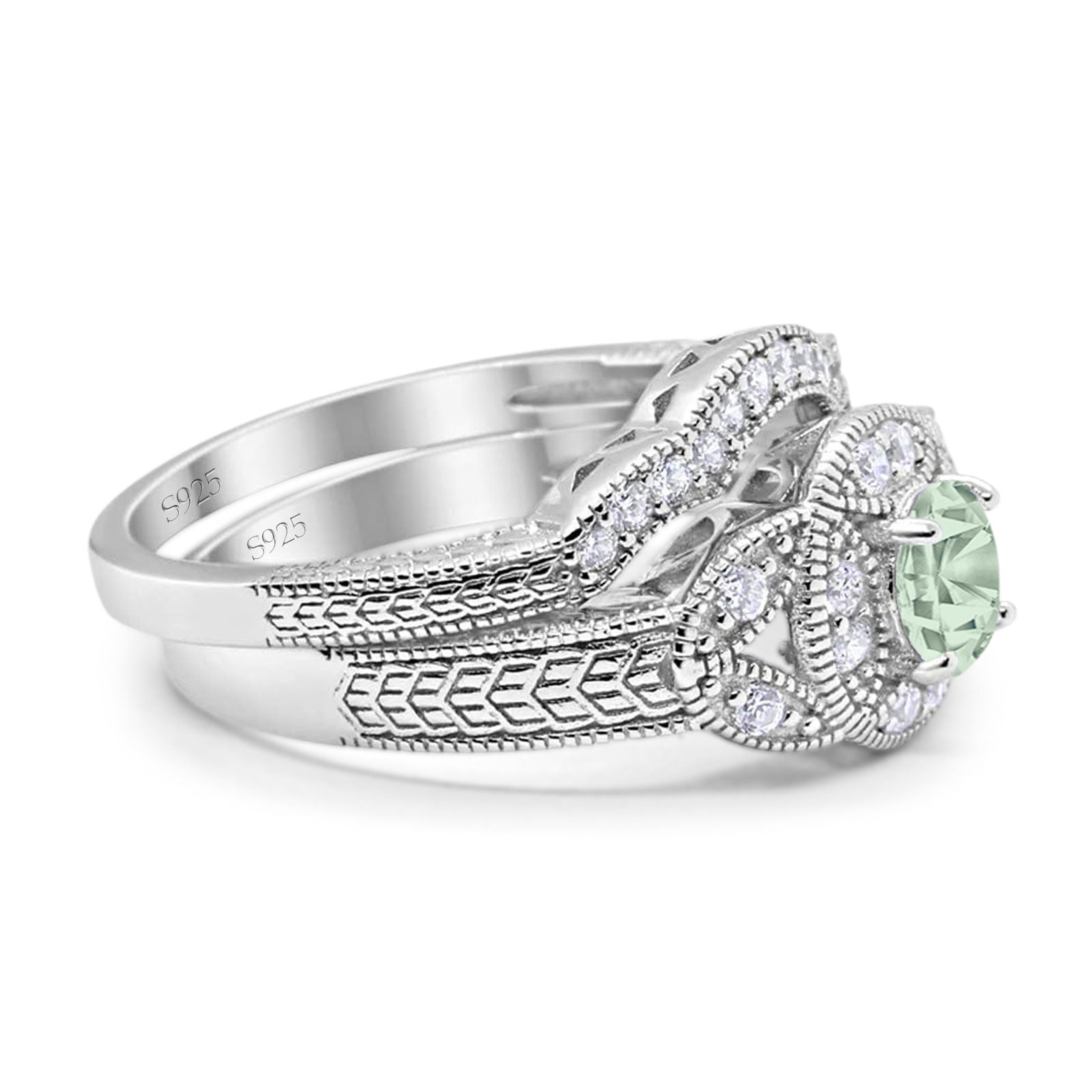 Two Piece Round Natural Green Amethyst Prasiolite Wedding Set Ring 925 Sterling Silver