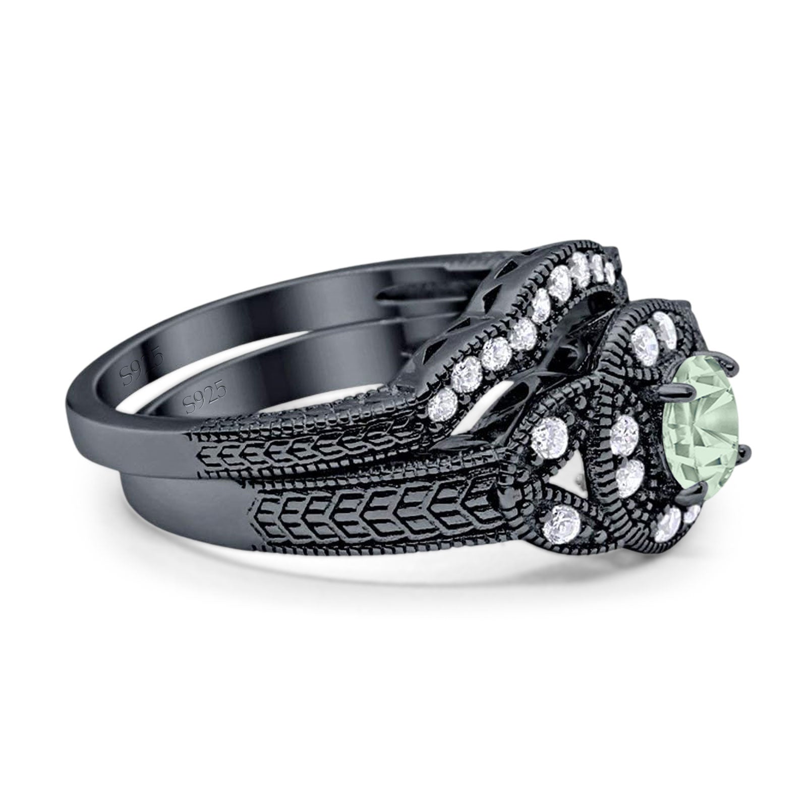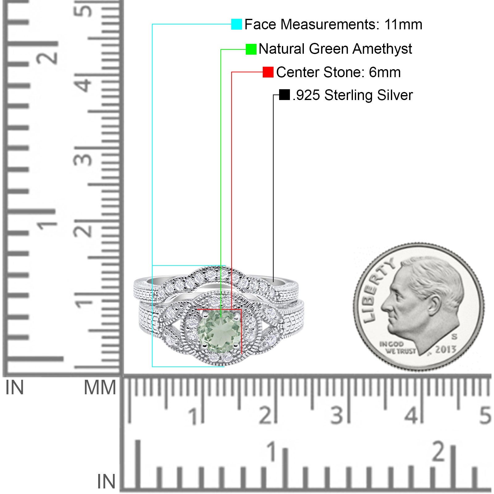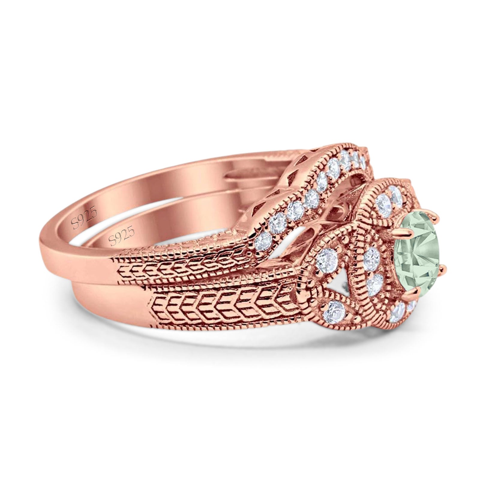 Two Piece Round Natural Green Amethyst Prasiolite Wedding Set Ring 925 Sterling Silver