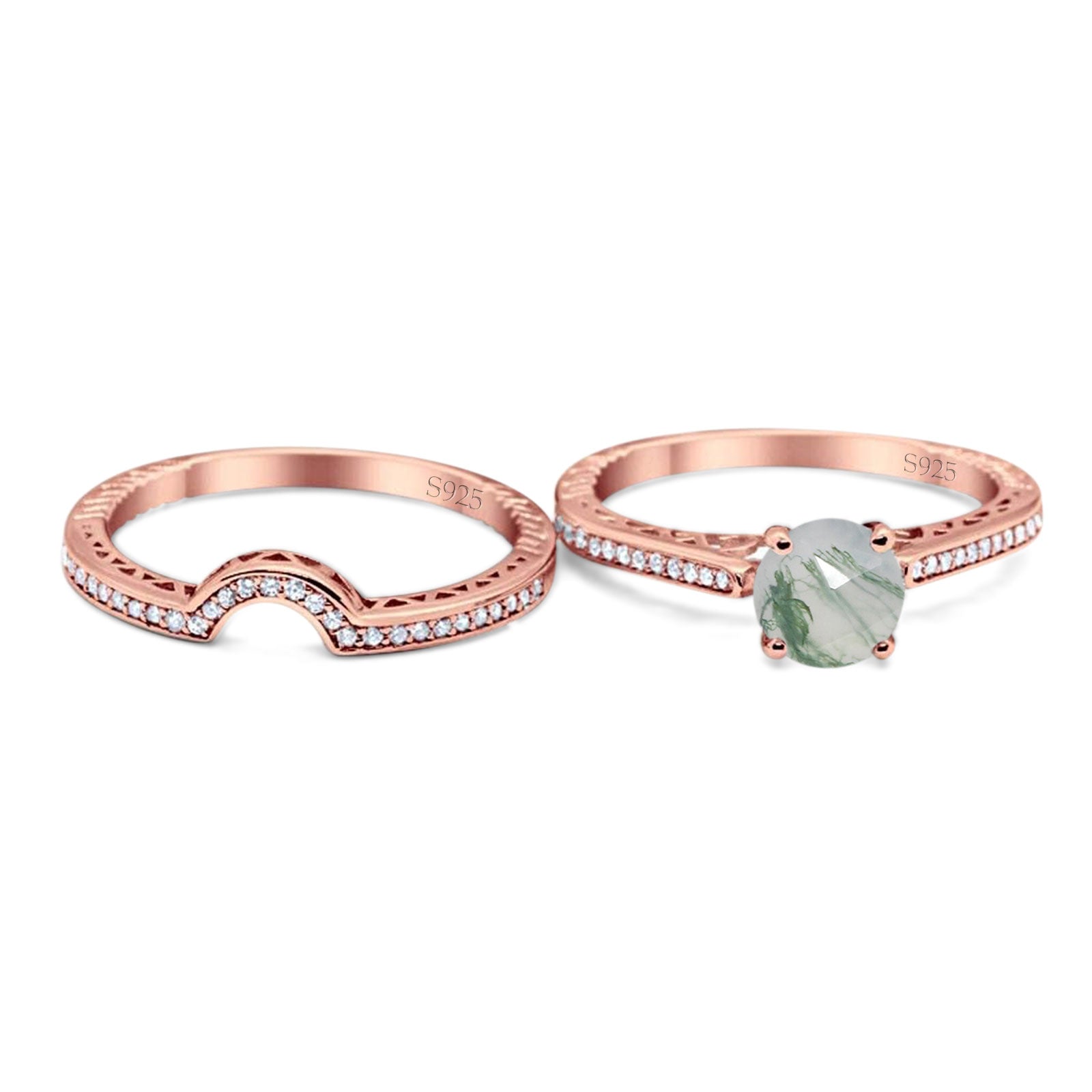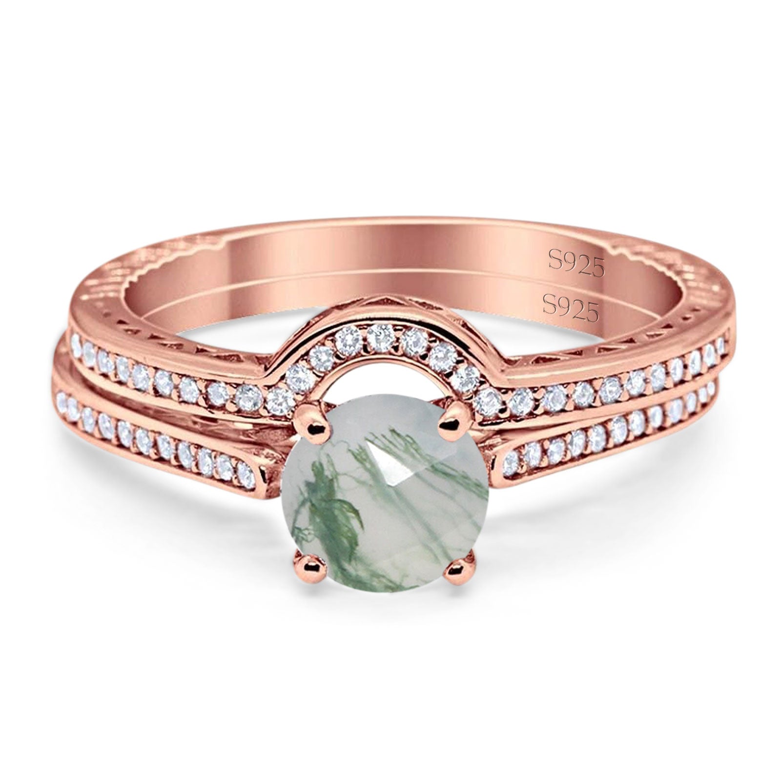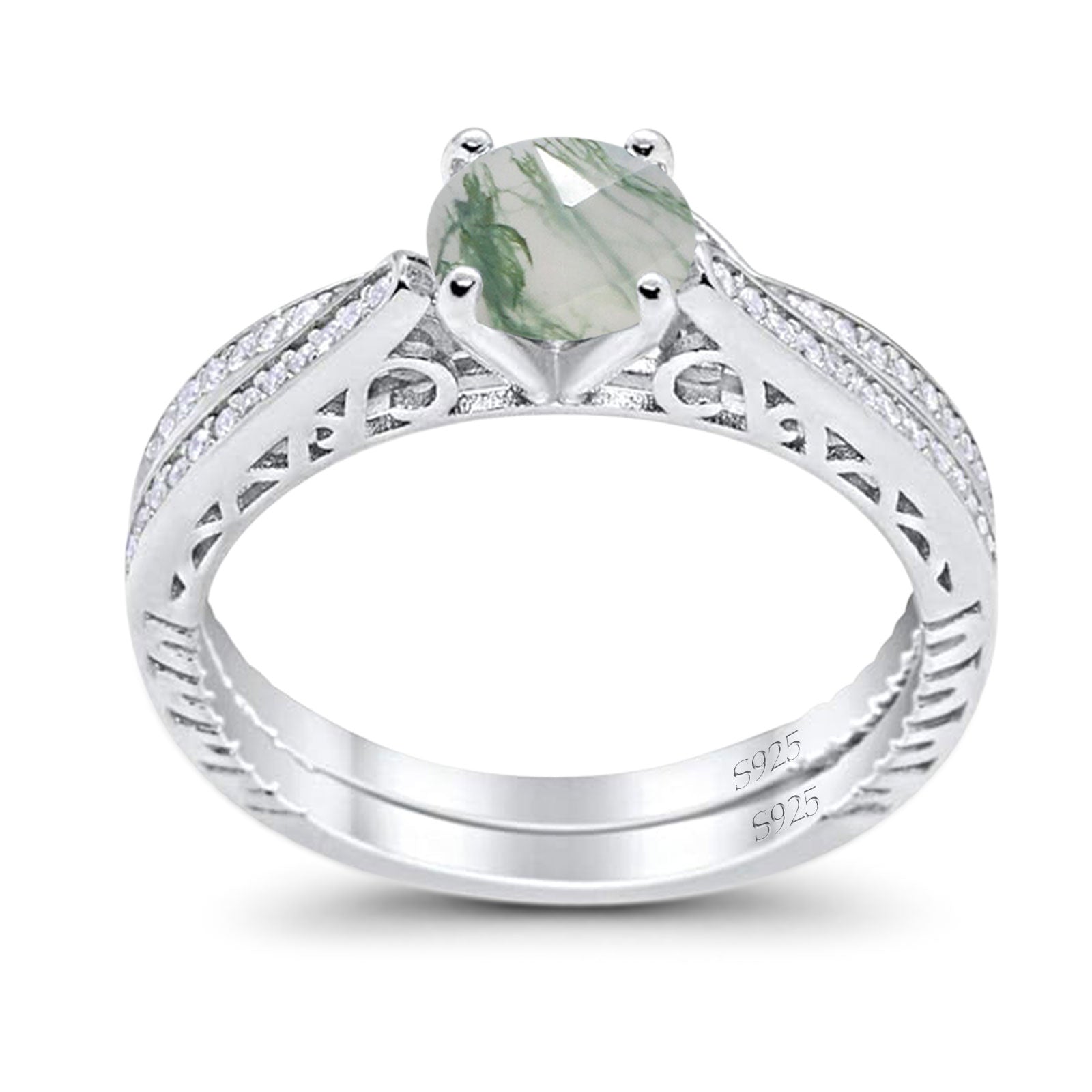 Two Piece Round Natural Green Moss Agate Bridal Ring 925 Sterling Silver