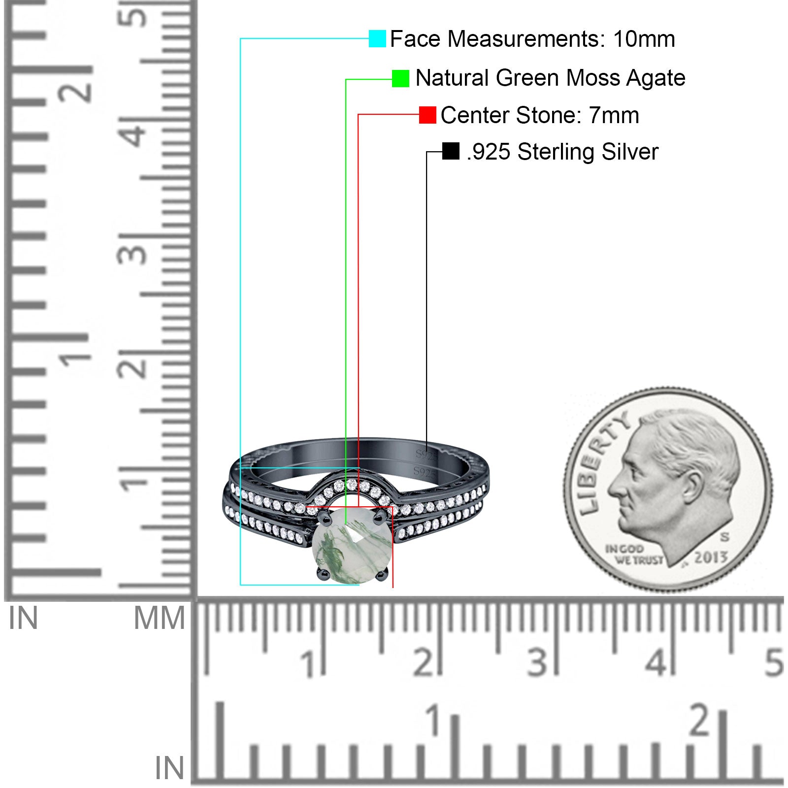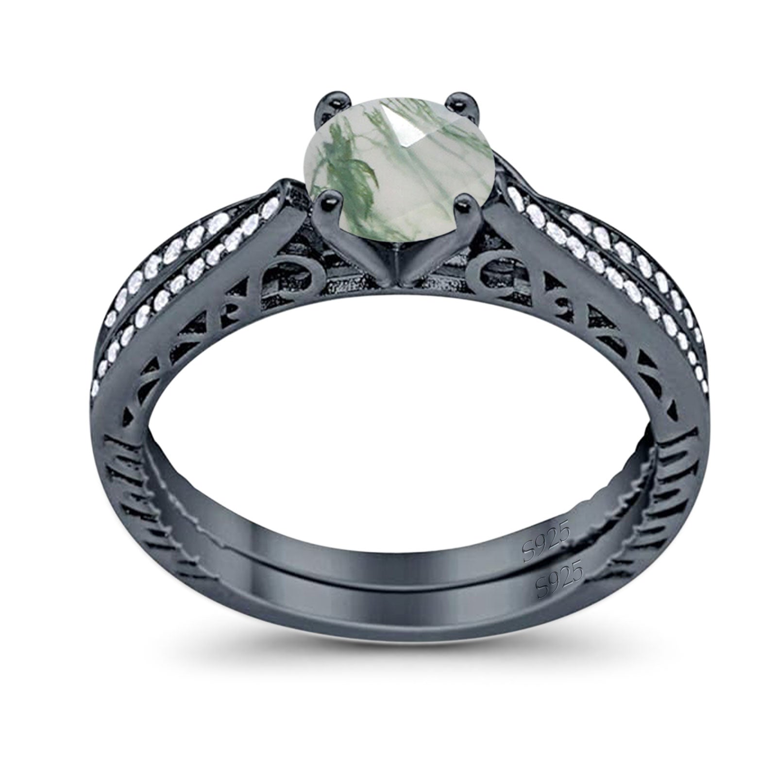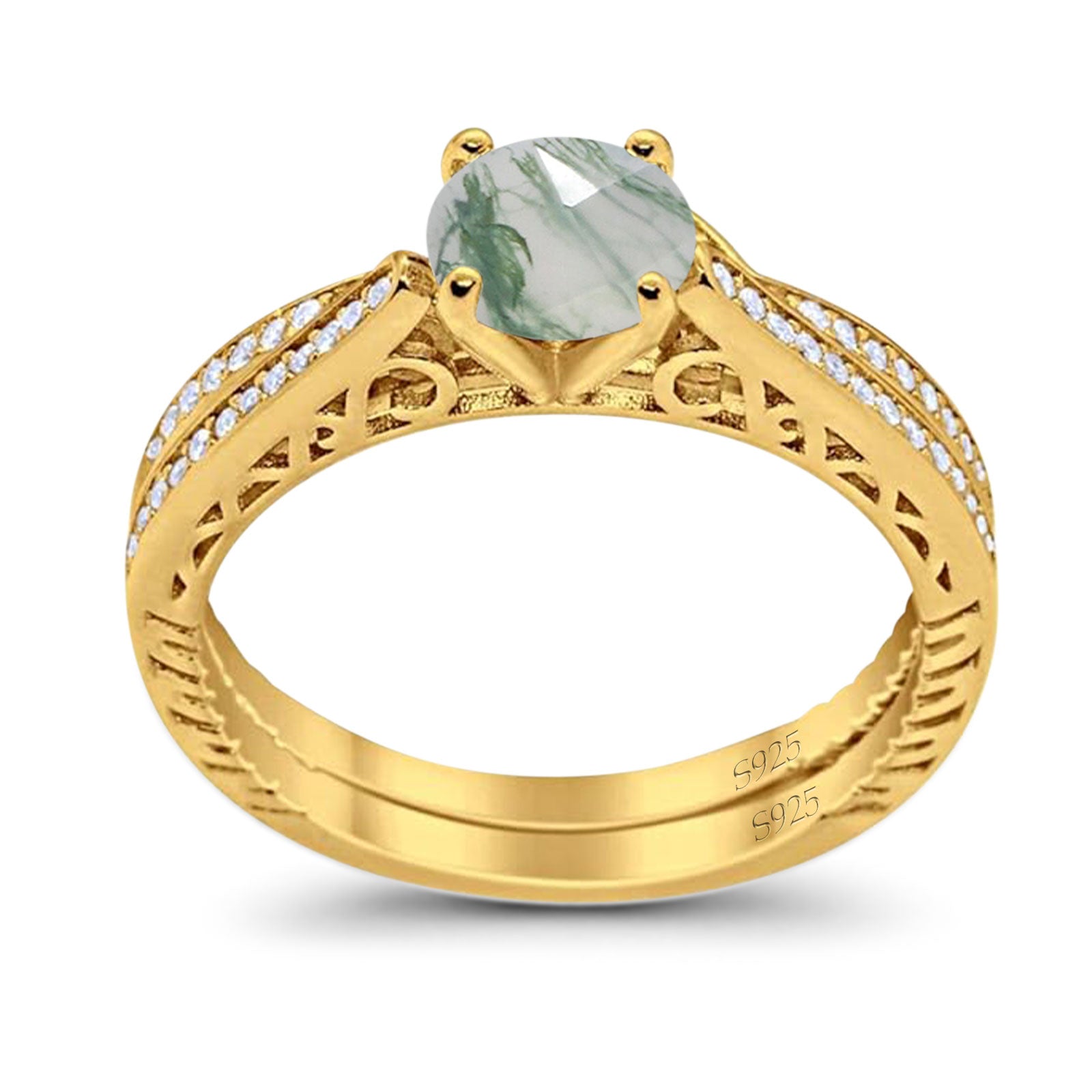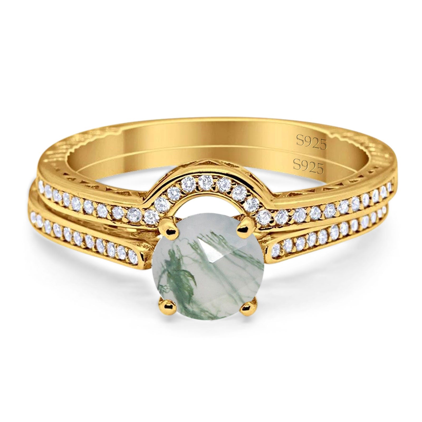 Two Piece Round Natural Green Moss Agate Bridal Ring 925 Sterling Silver