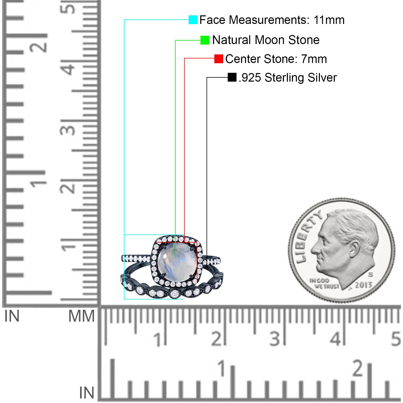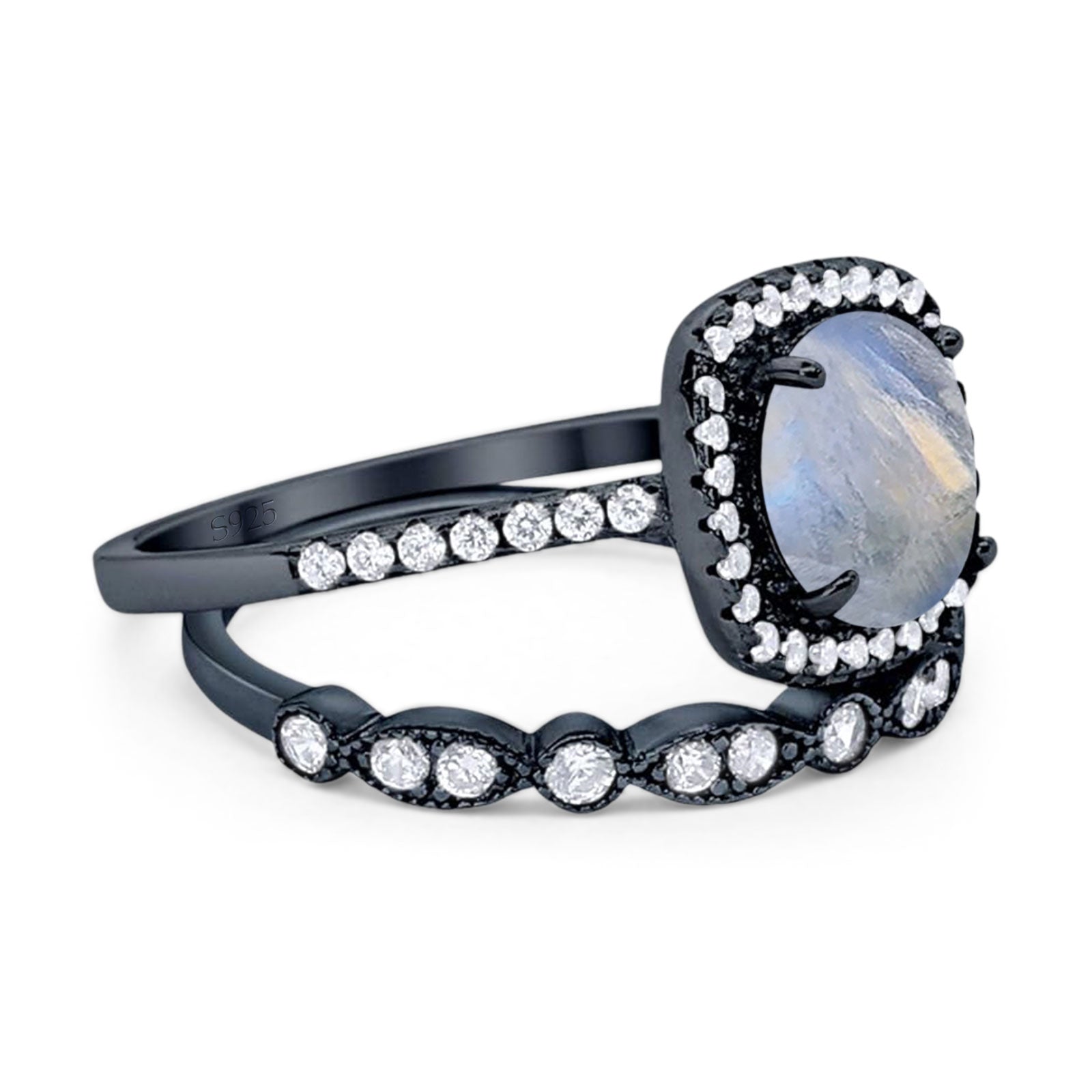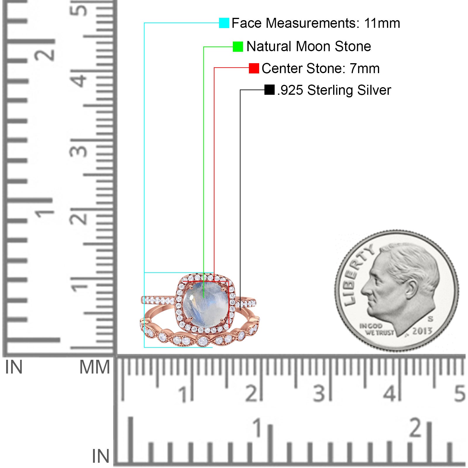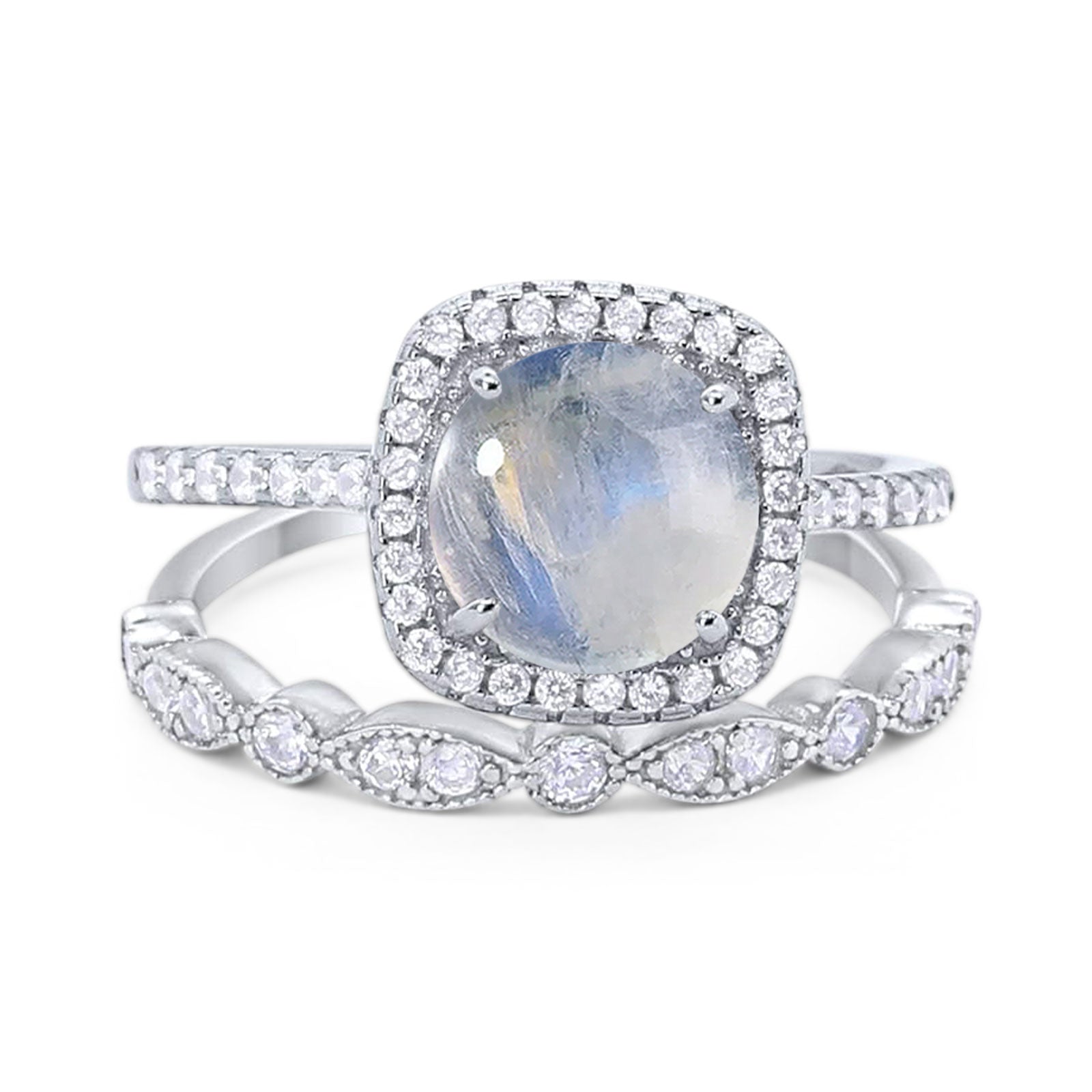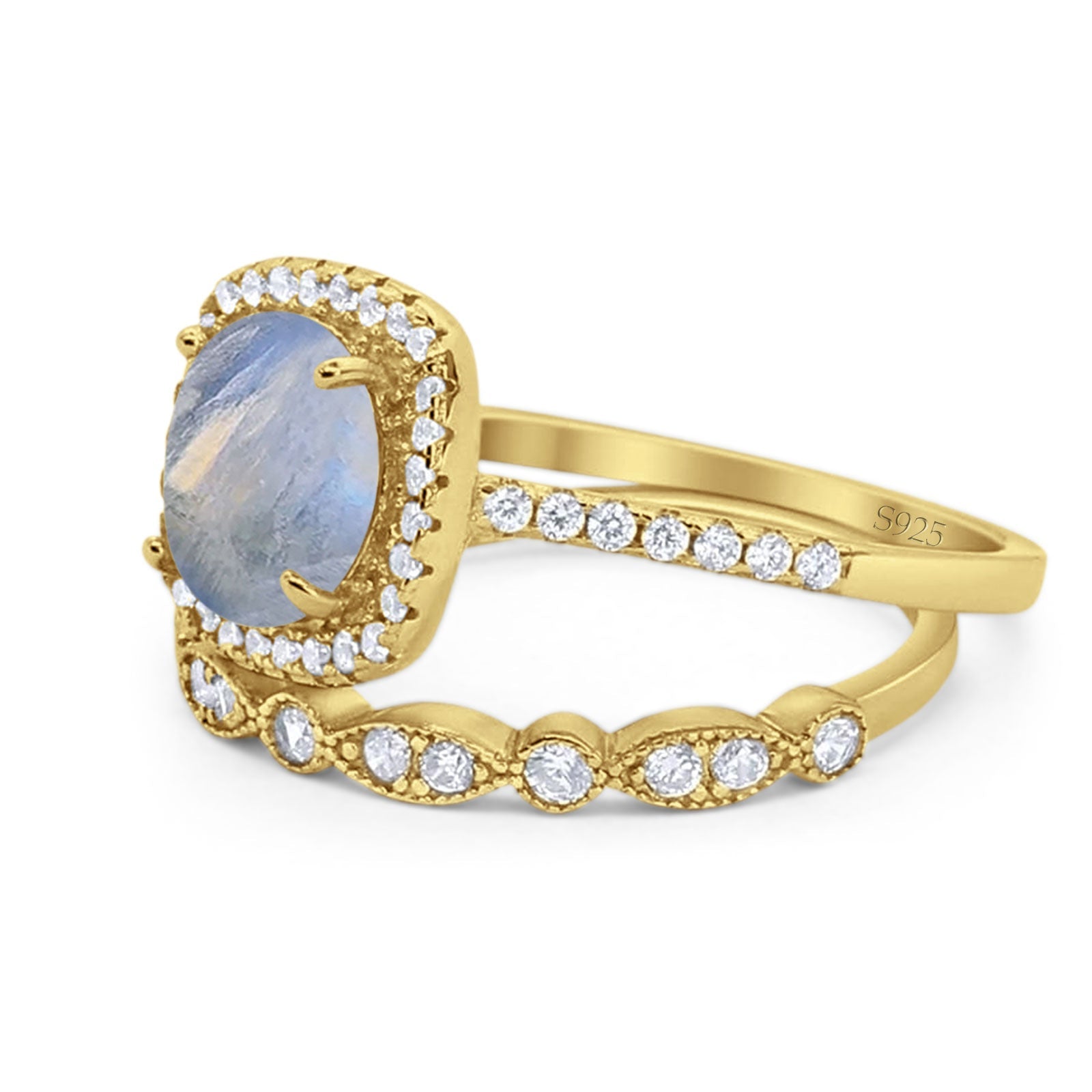 Two Piece Round Natural Moonstone Halo Bridal Ring 925 Sterling Silver