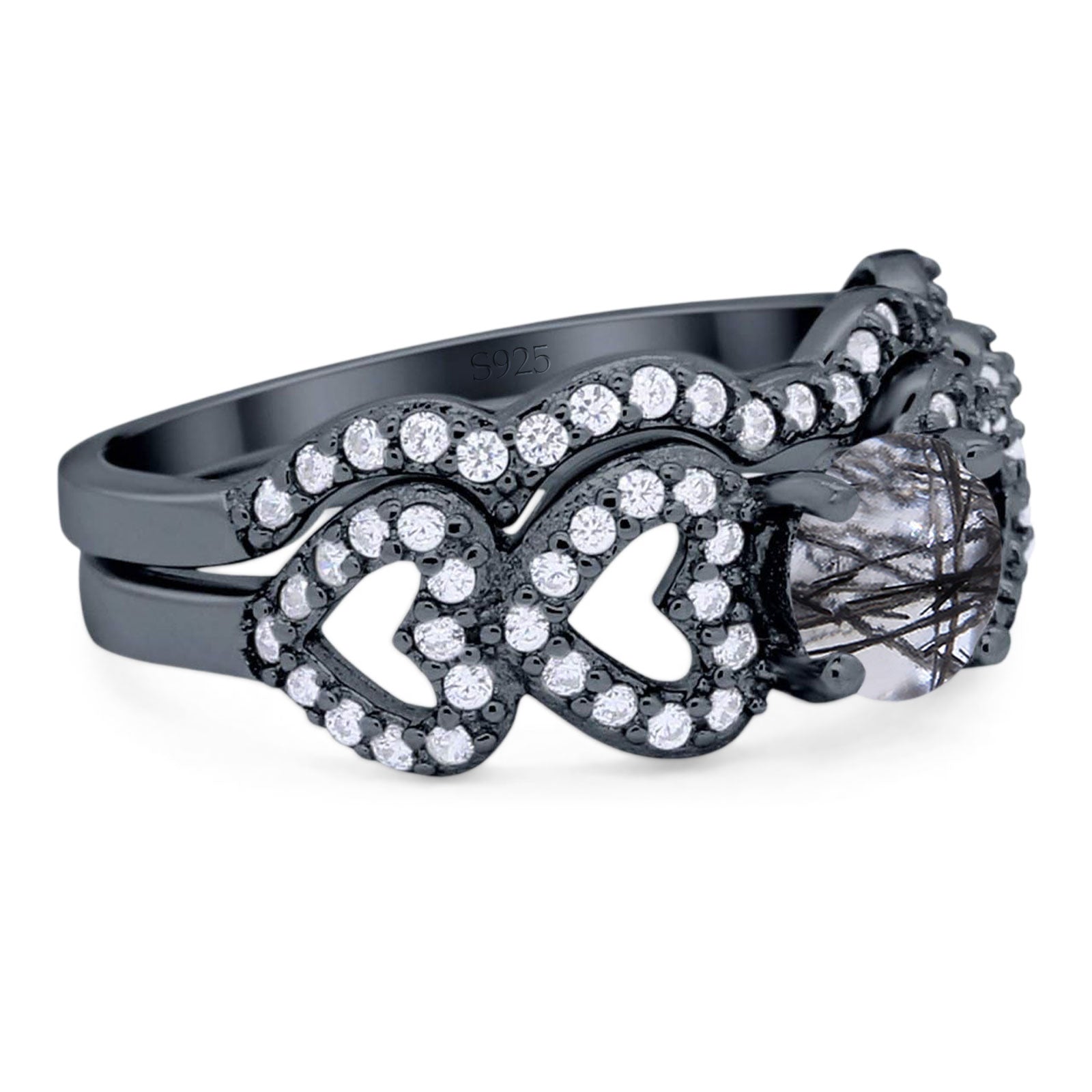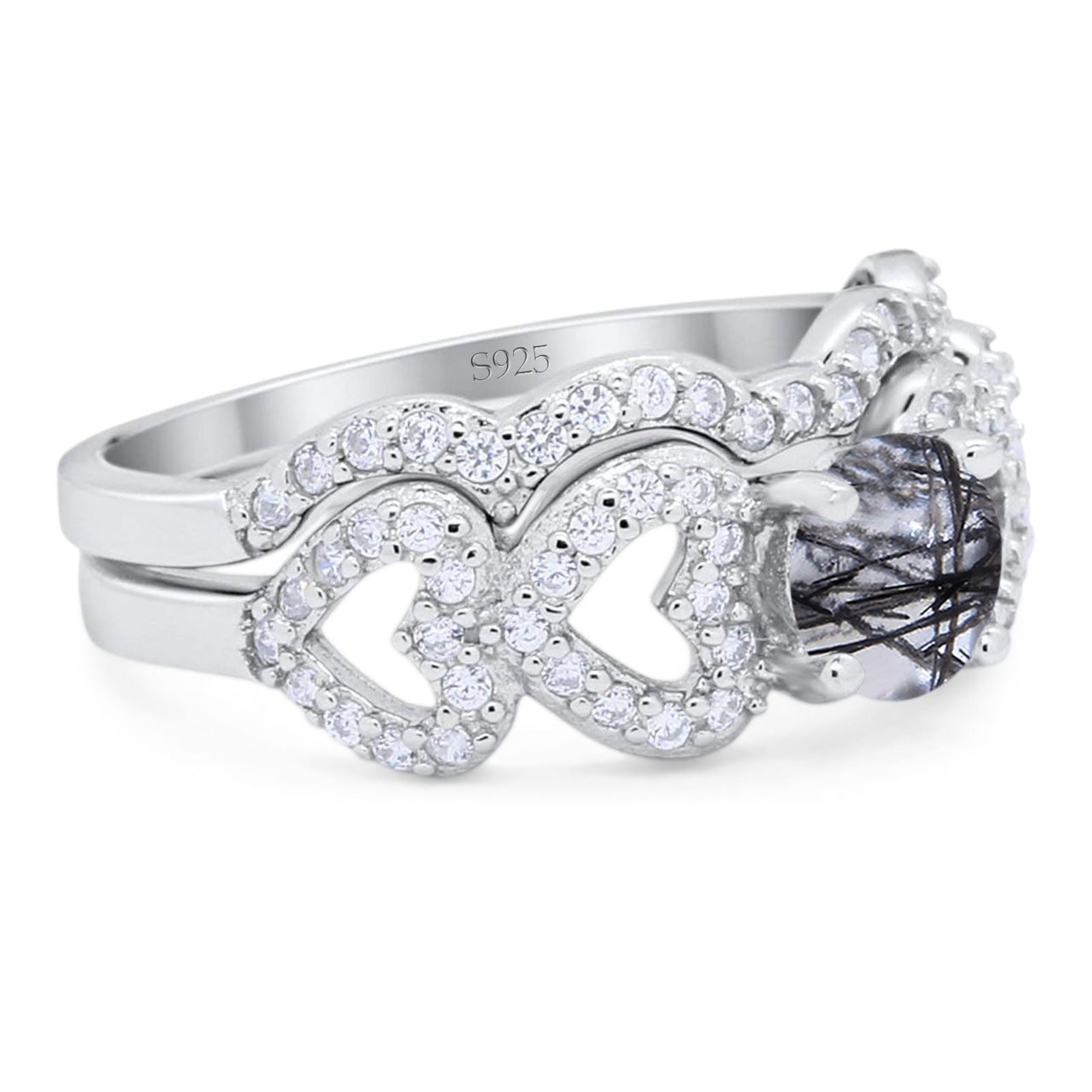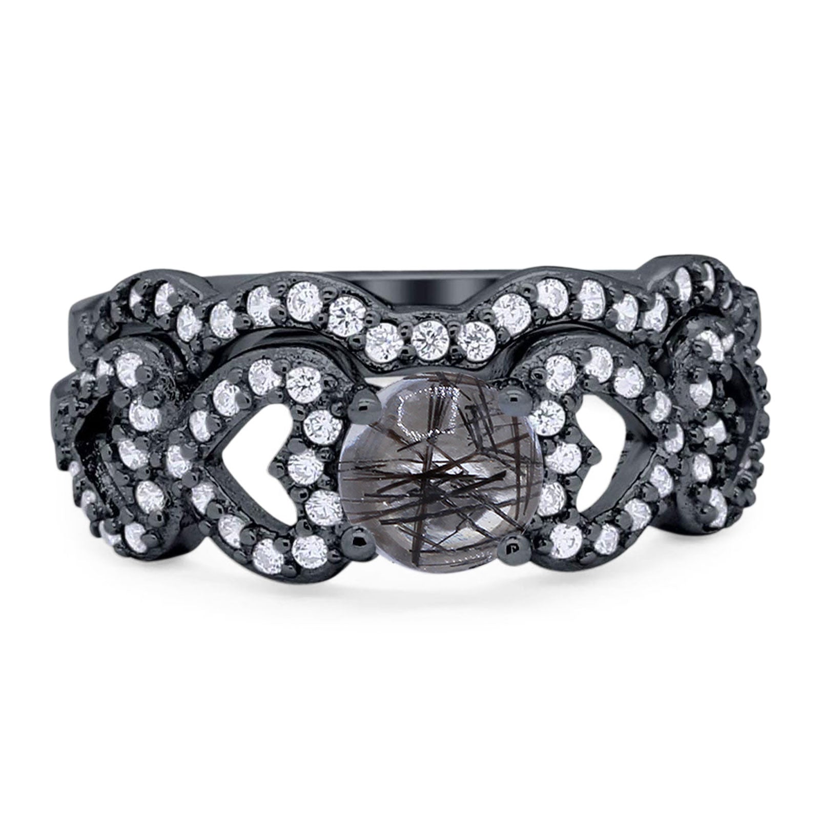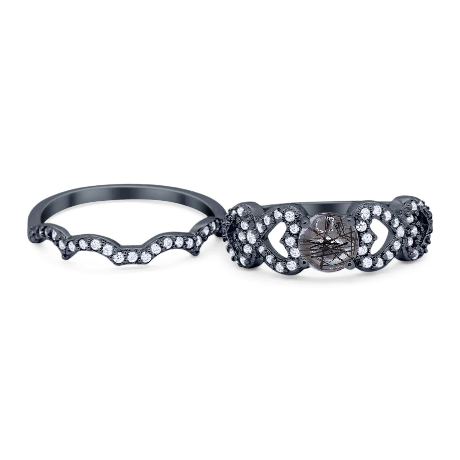 Two Piece Round Natural Rutilated Quartz Art Deco Ring 925 Sterling Silver