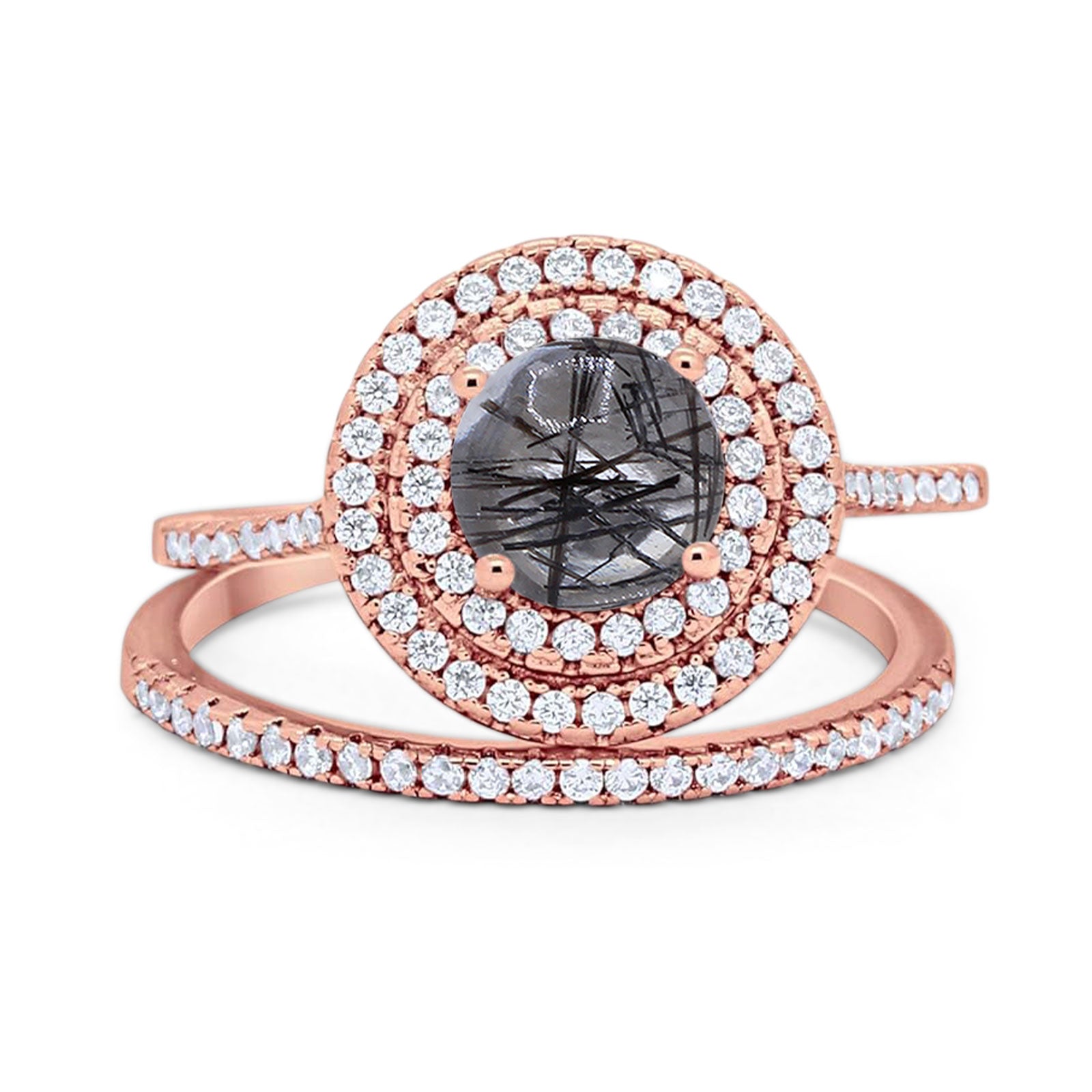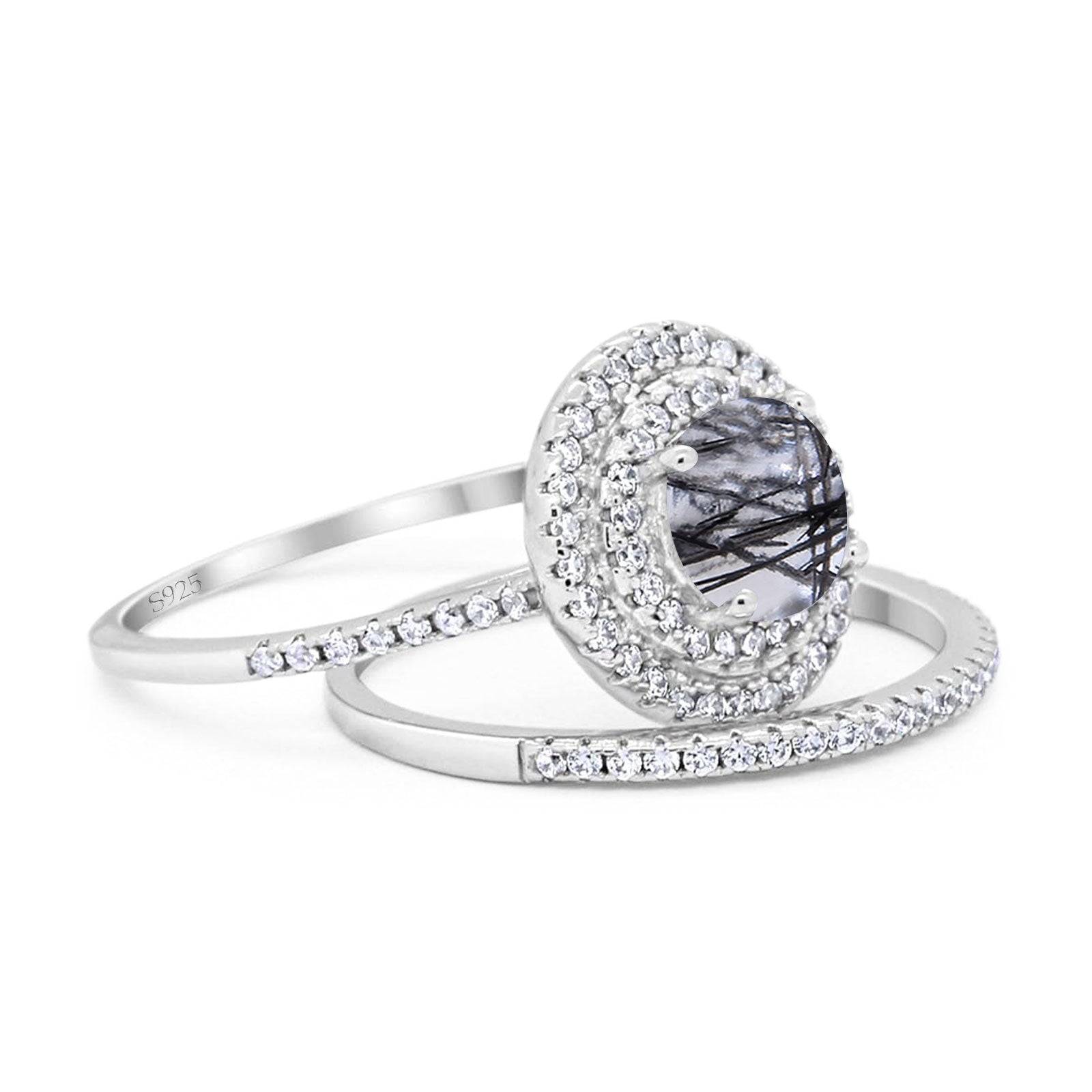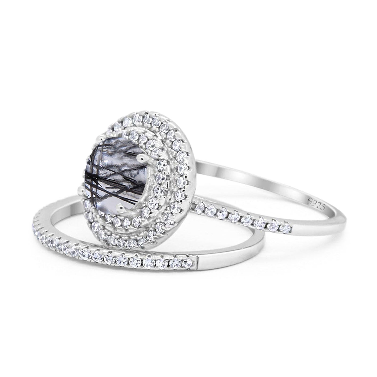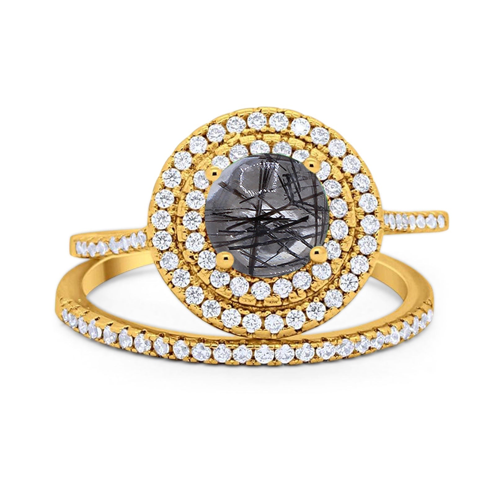 Two Piece Round Natural Rutilated Quartz Double Halo Ring 925 Sterling Silver
