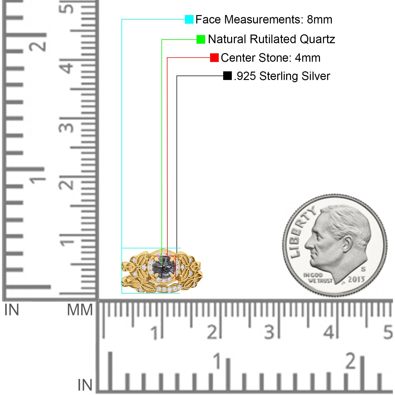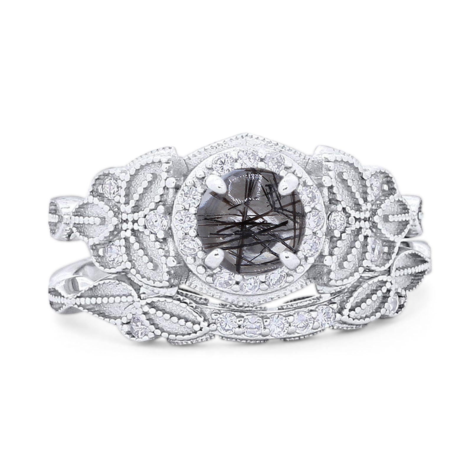 Two Piece Round Natural Rutilated Quartz Leaf Design Ring 925 Sterling Silver