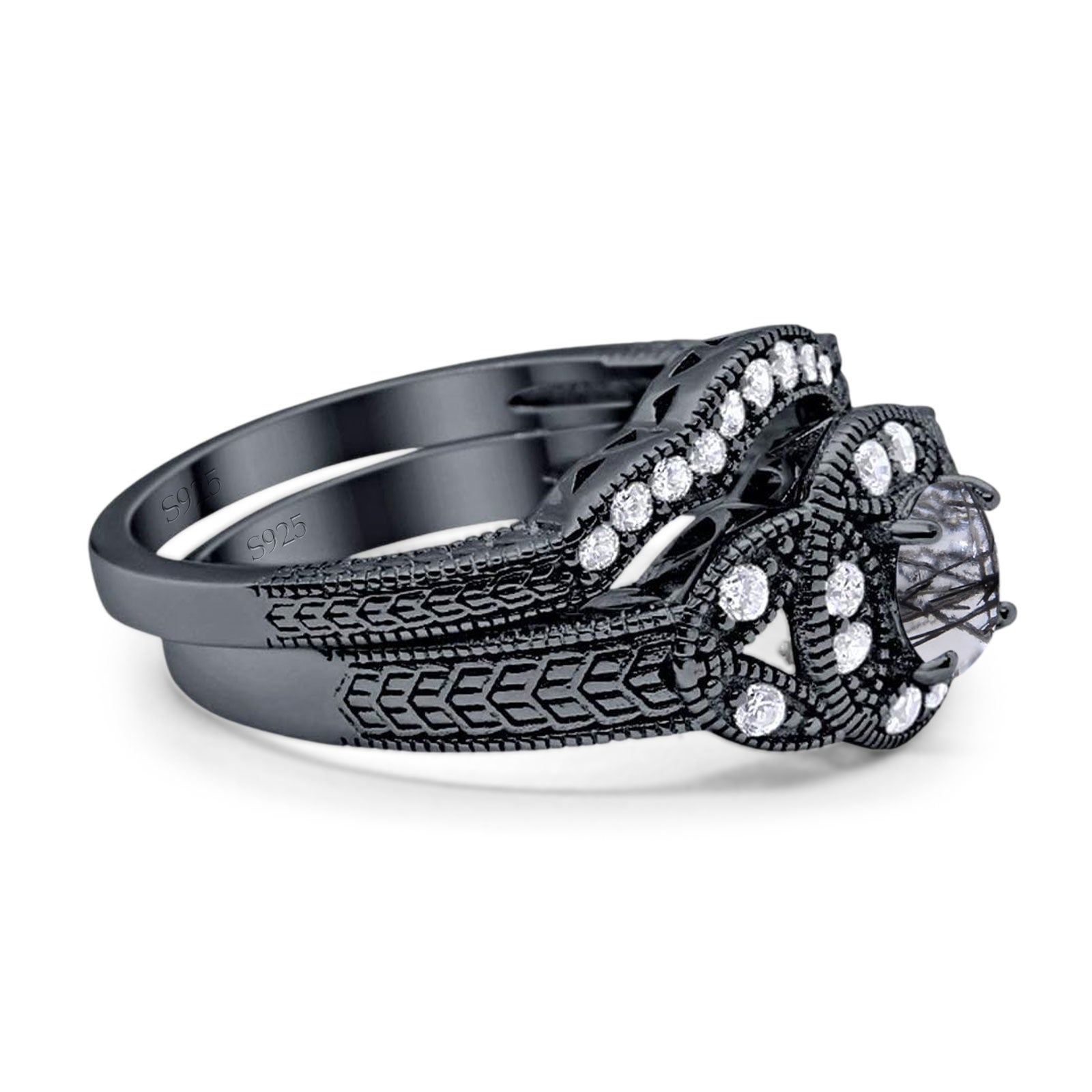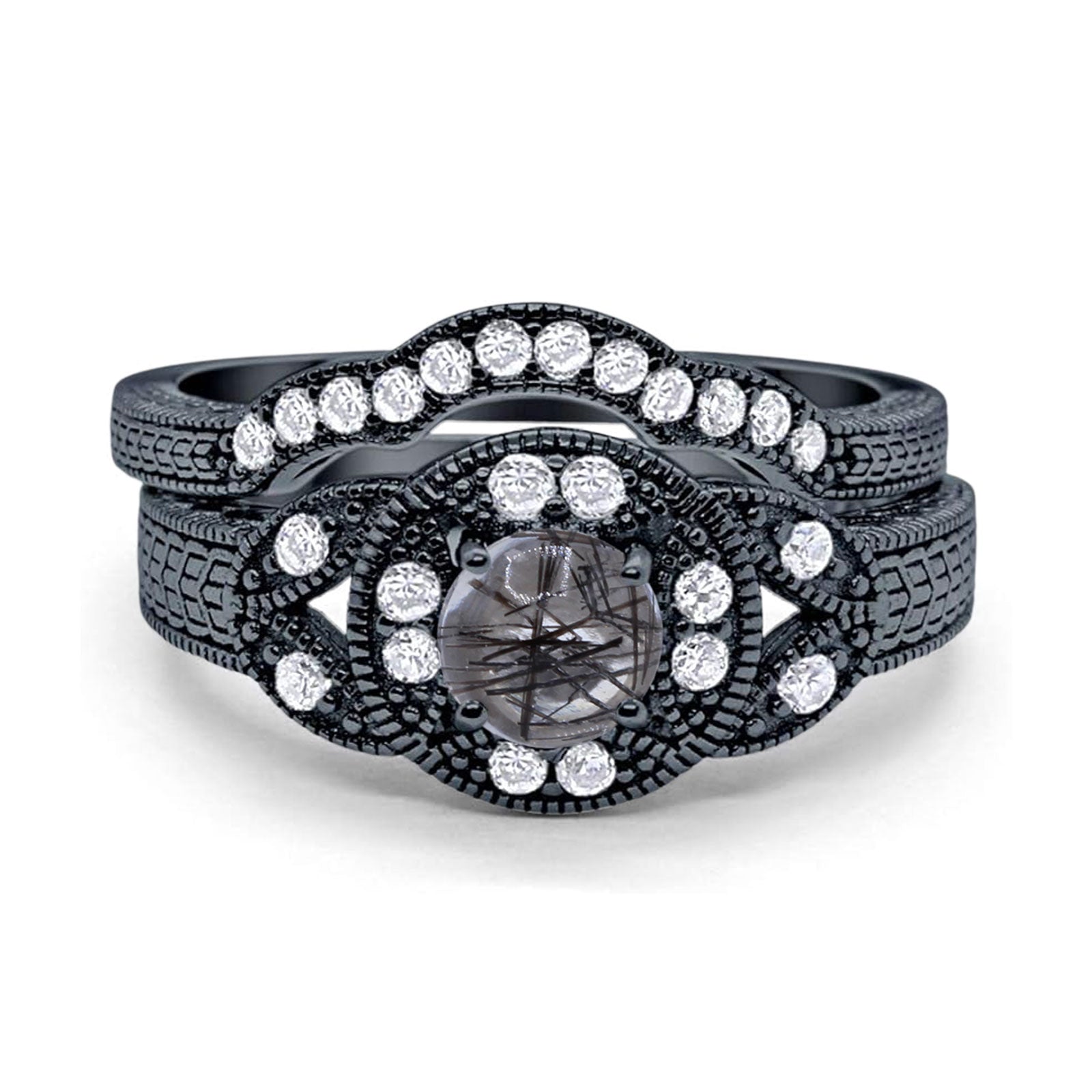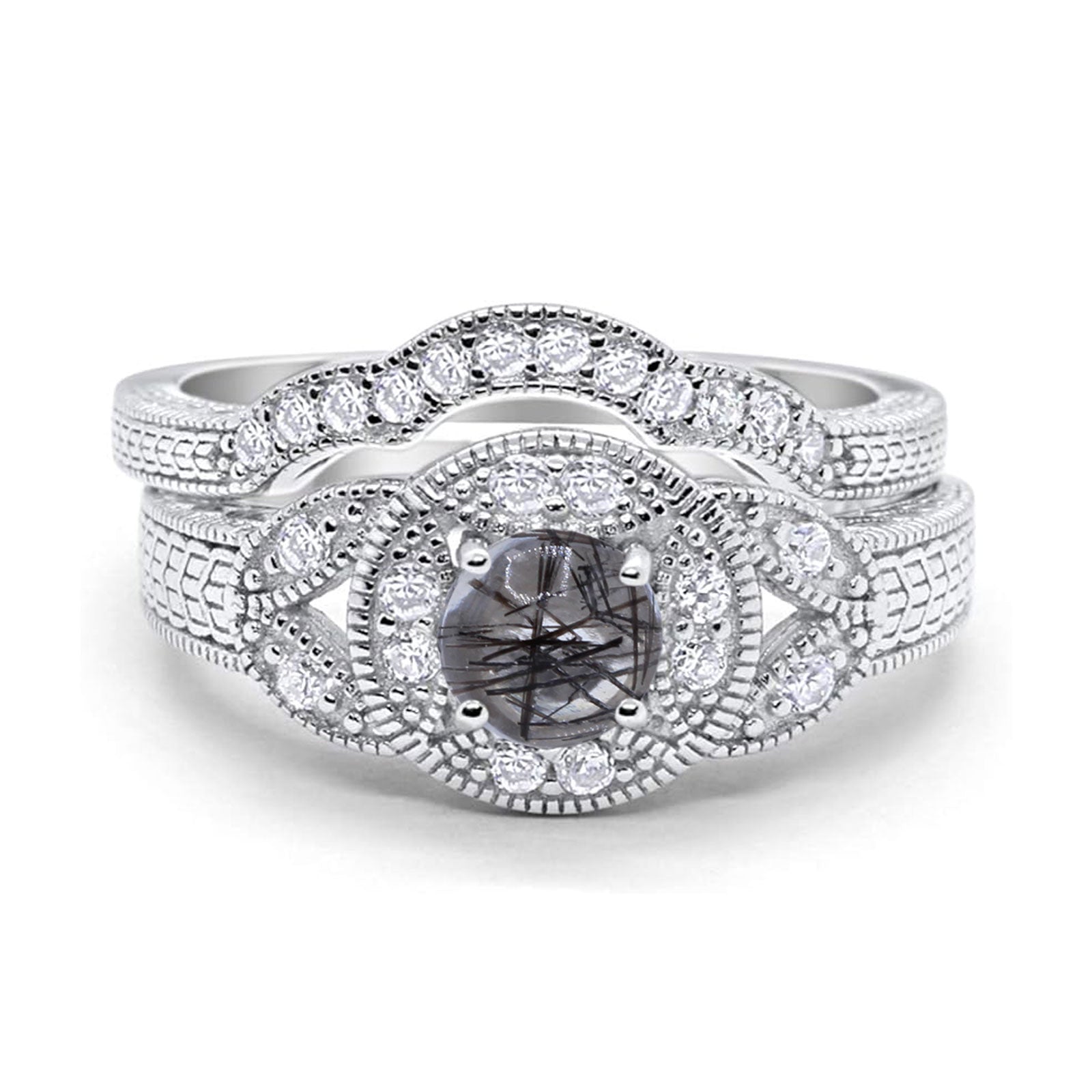 Two Piece Round Natural Rutilated Quartz Wedding Set Ring 925 Sterling Silver
